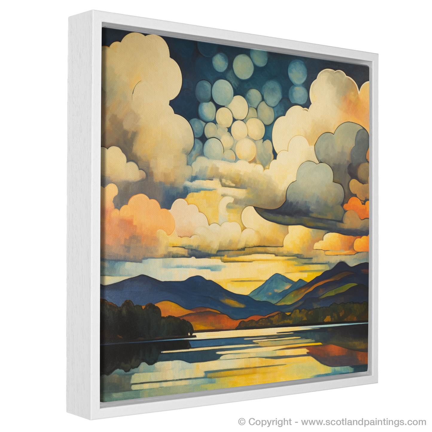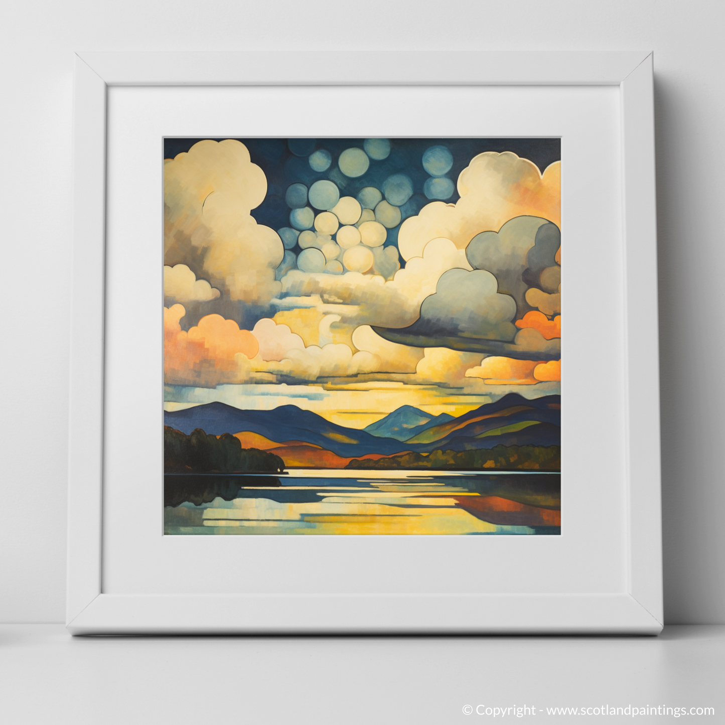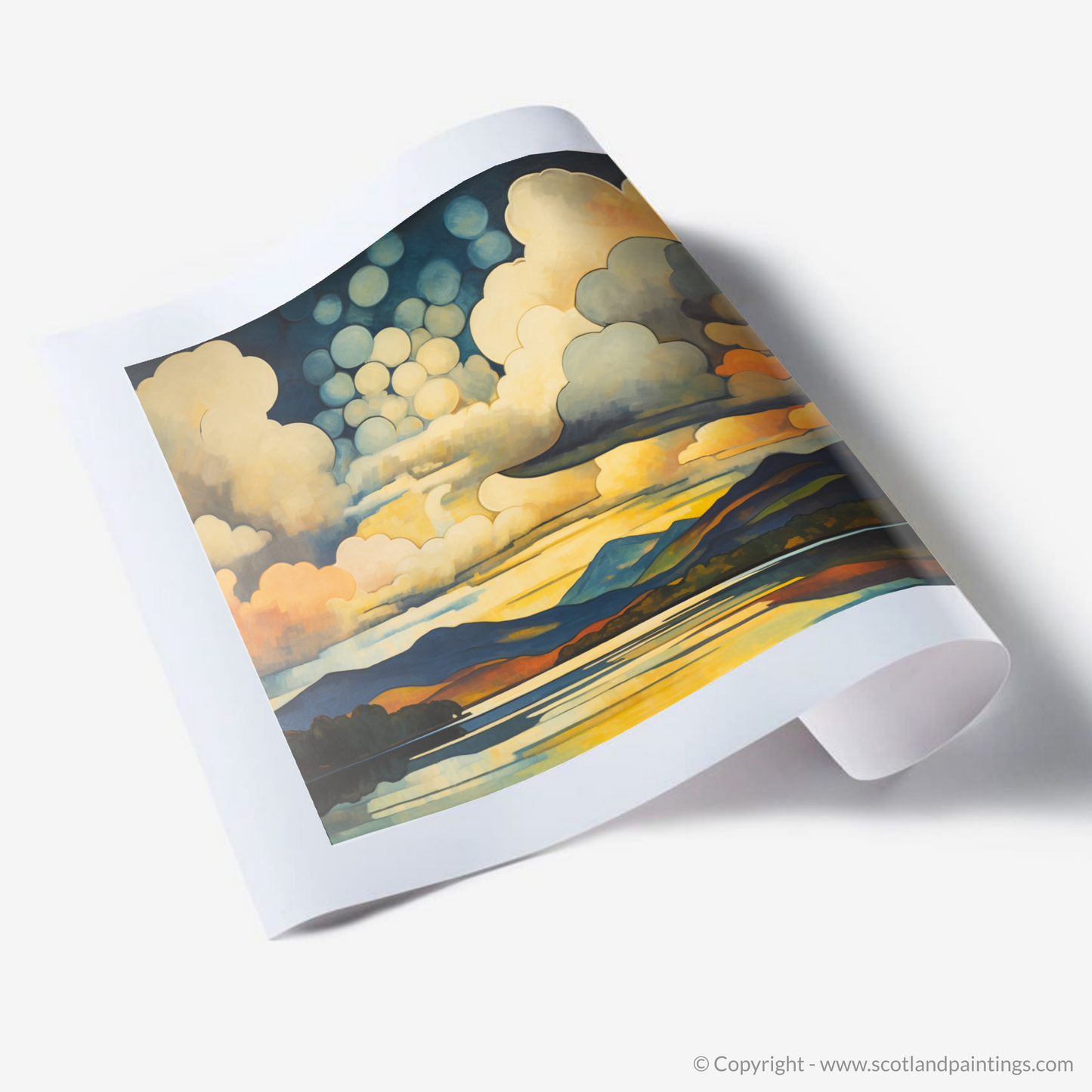 Dominating the upper portion of the composition is a dynamic sky, alive with voluptuous clouds ranging from luminescent whites to deep, dramatic greys. These clouds are not merely puffs in the sky but a whirl of spherical forms that dance and merge, creating a visual rhythm that resonates with the viewer's imagination. The interplay of light and shadow imparts depth and movement, suggesting the ephemeral nature of the skies above the loch.