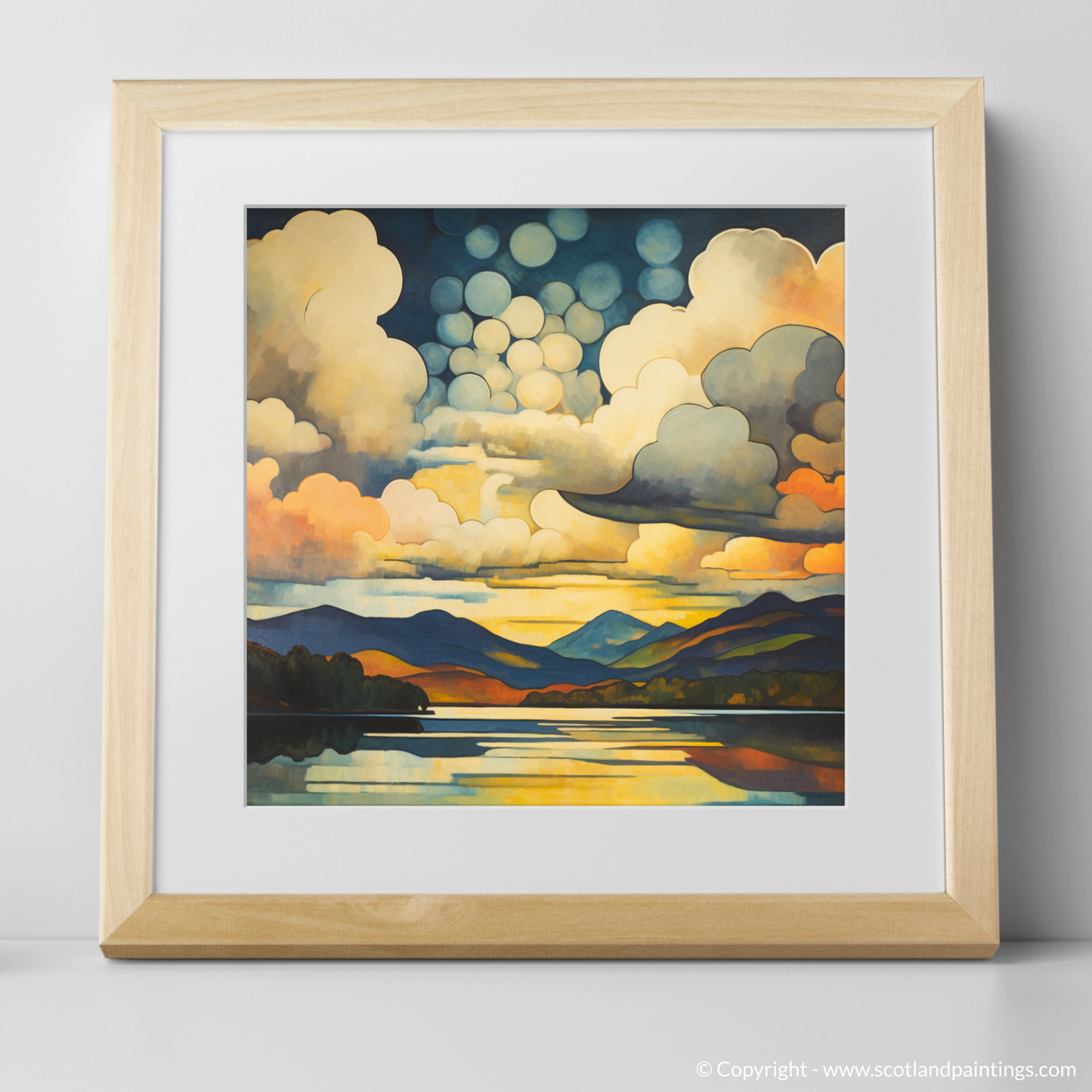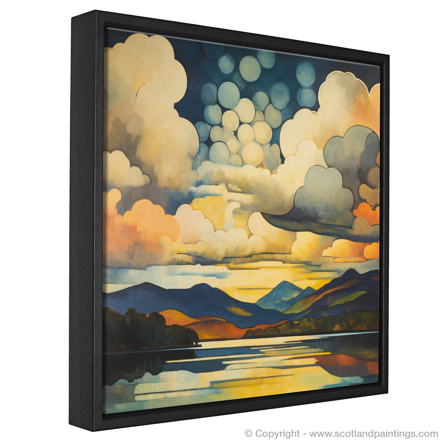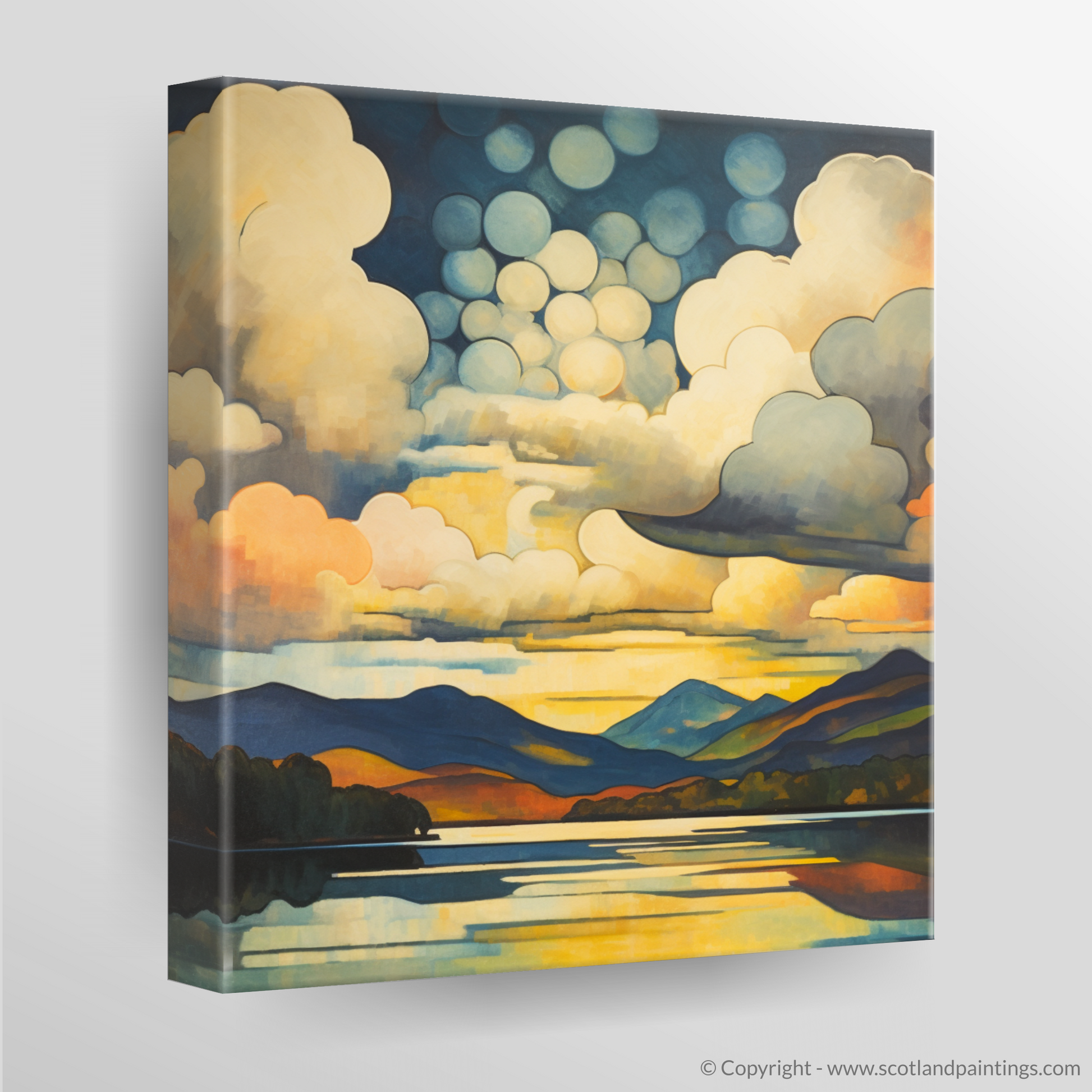Dominating the upper portion of the composition is a dynamic sky, alive with voluptuous clouds ranging from luminescent whites to deep, dramatic greys. These clouds are not merely puffs in the sky but a whirl of spherical forms that dance and merge, creating a visual rhythm that resonates with the viewer's imagination. The interplay of light and shadow imparts depth and movement, suggesting the ephemeral nature of the skies above the loch.