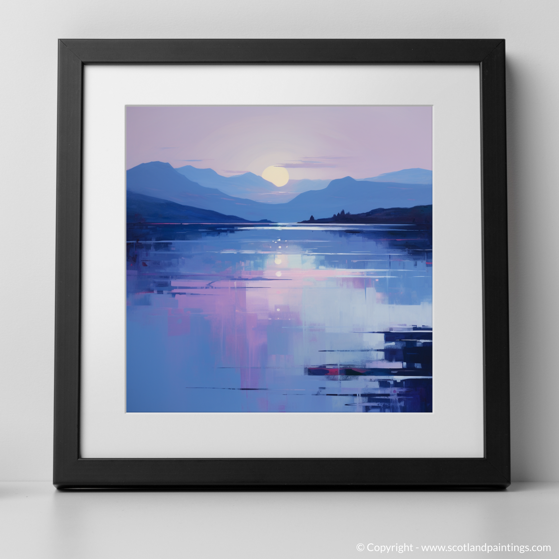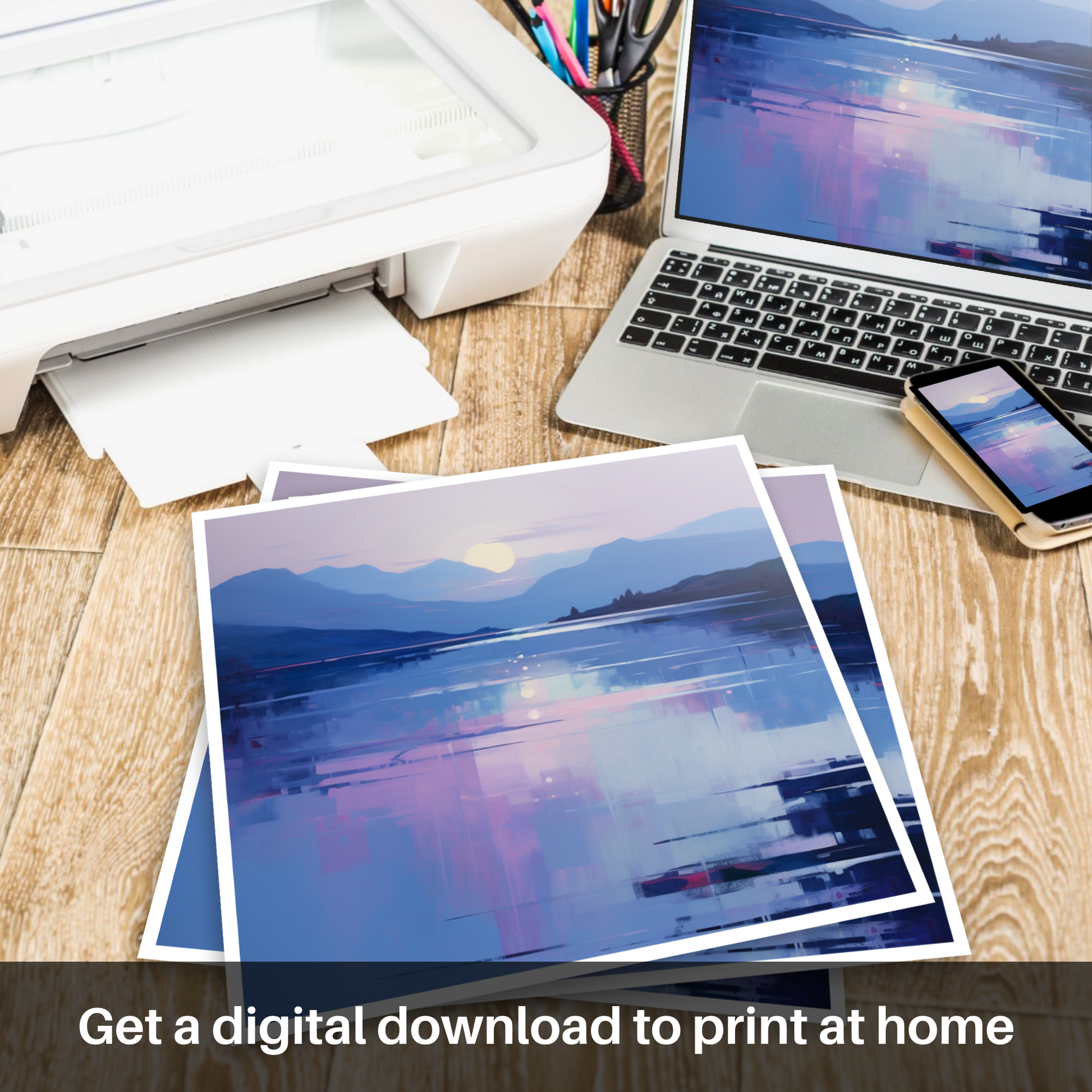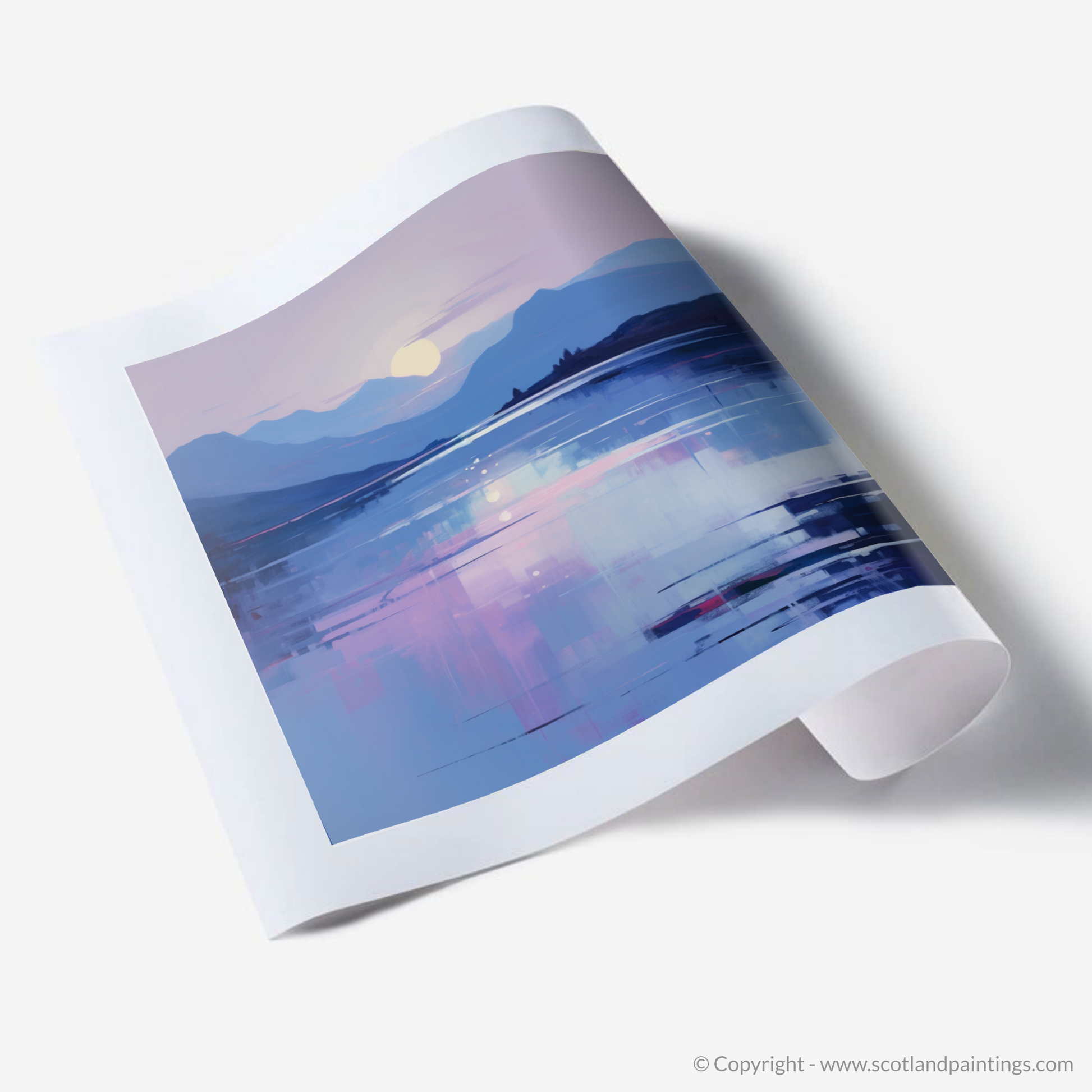 Capturing the serene beauty of Scotland's landscapes, this exquisite print features a mesmerizing scene of Loch Lomond at dusk. The calm waters mirror the gradient hues of the twilight sky, with soft pinks, purples, and blues creating a tranquil and dreamy atmosphere. The gentle orb of the setting sun is perfectly centered, casting a warm glow that graces the layered silhouettes of distant mountains, while subtle reflections dance on the surface of the loch.