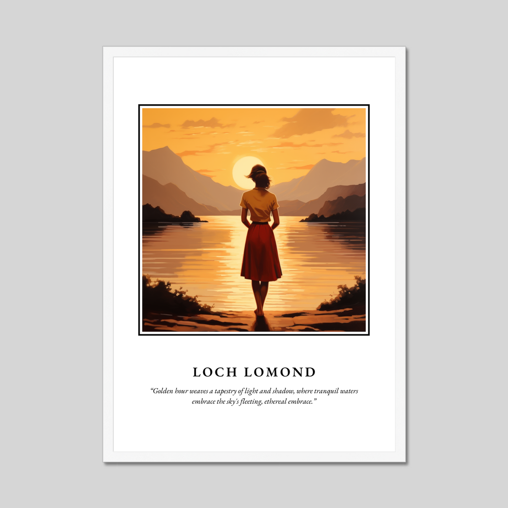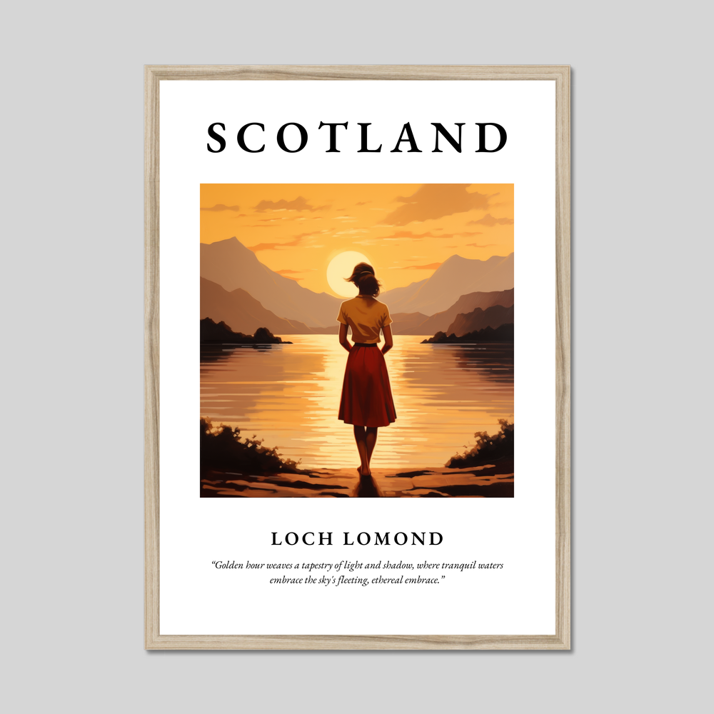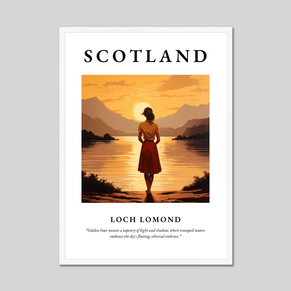 The bold lettering of "SCOTLAND" sets the stage for what lies beneath—an evocative depiction of Loch Lomond. The painting captures the essence of the loch during the 'golden hour', a time when light and shadow dance delicately across the tranquil waters, as if the sky and water share an ethereal embrace. Beneath the artwork, the poetic quote enhances the sensory experience, inviting the viewer to pause and reflect.