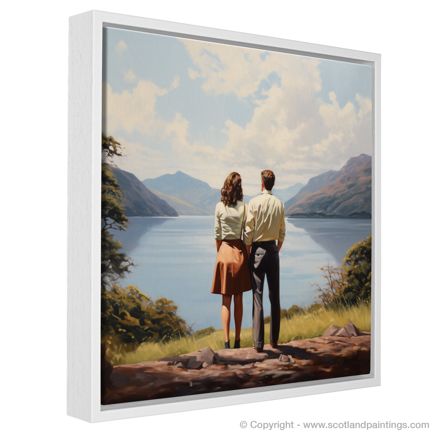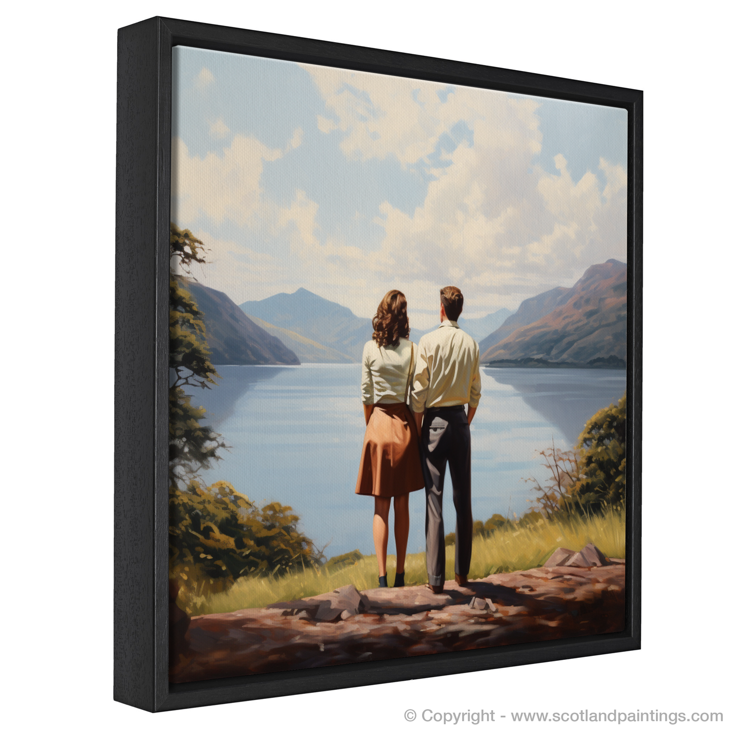 Capture the essence of tranquility and companionship with this evocative piece, depicting a couple standing hand-in-hand, gazing out across the serene expanse of Loch Lomond. This exquisite print portrays a tender moment shared between two figures, set against the majestic backdrop of one of Scotland's most iconic landscapes.