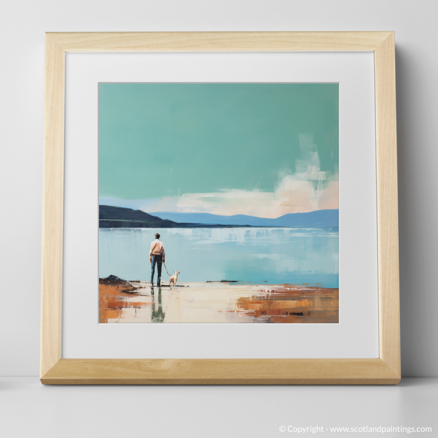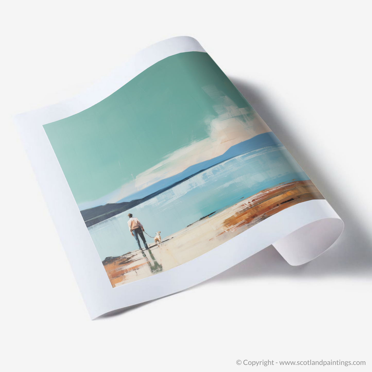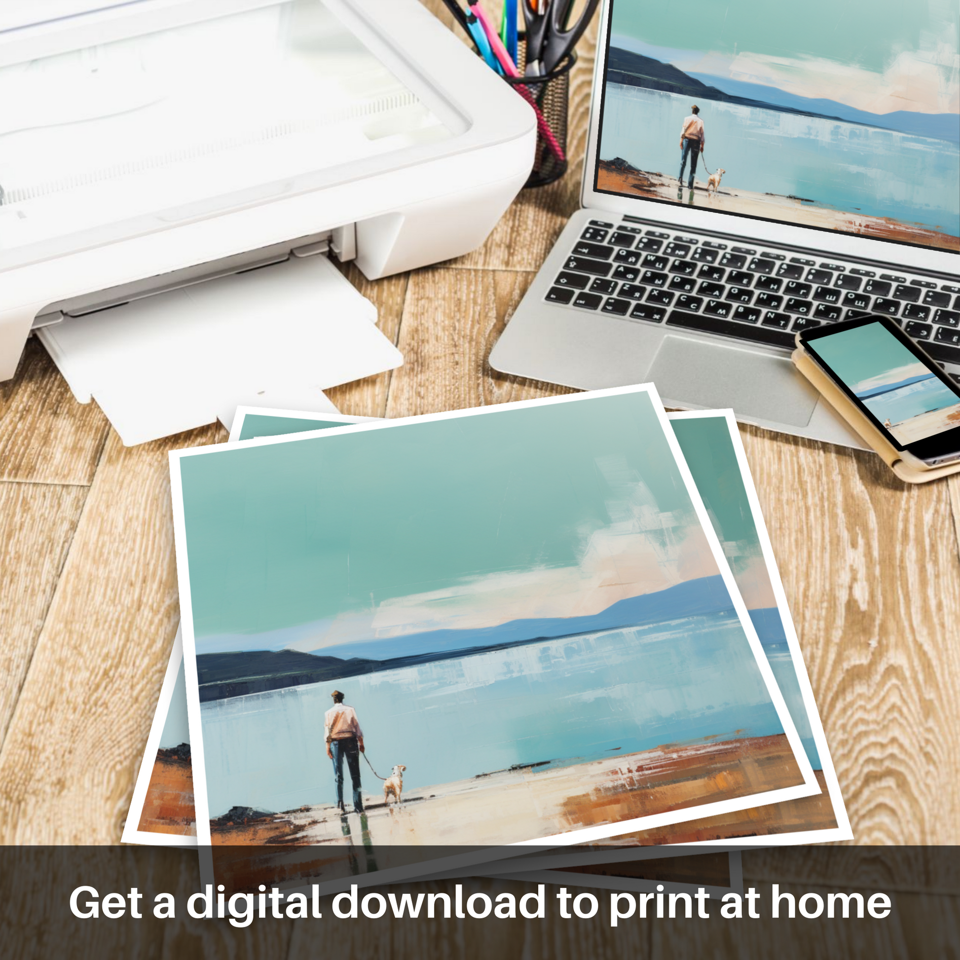 Capturing the serene beauty of Loch Lomond, this captivating print brings to life a harmonious moment shared between a man and his loyal canine companion. The vivid blues of the water blend effortlessly with the expansive sky, punctuated by gentle strokes of white and soft peach, suggesting the calm passage of clouds. The distant rolling hills, rendered in subtle shades of blue and green, quietly frame the tranquil waterscape.