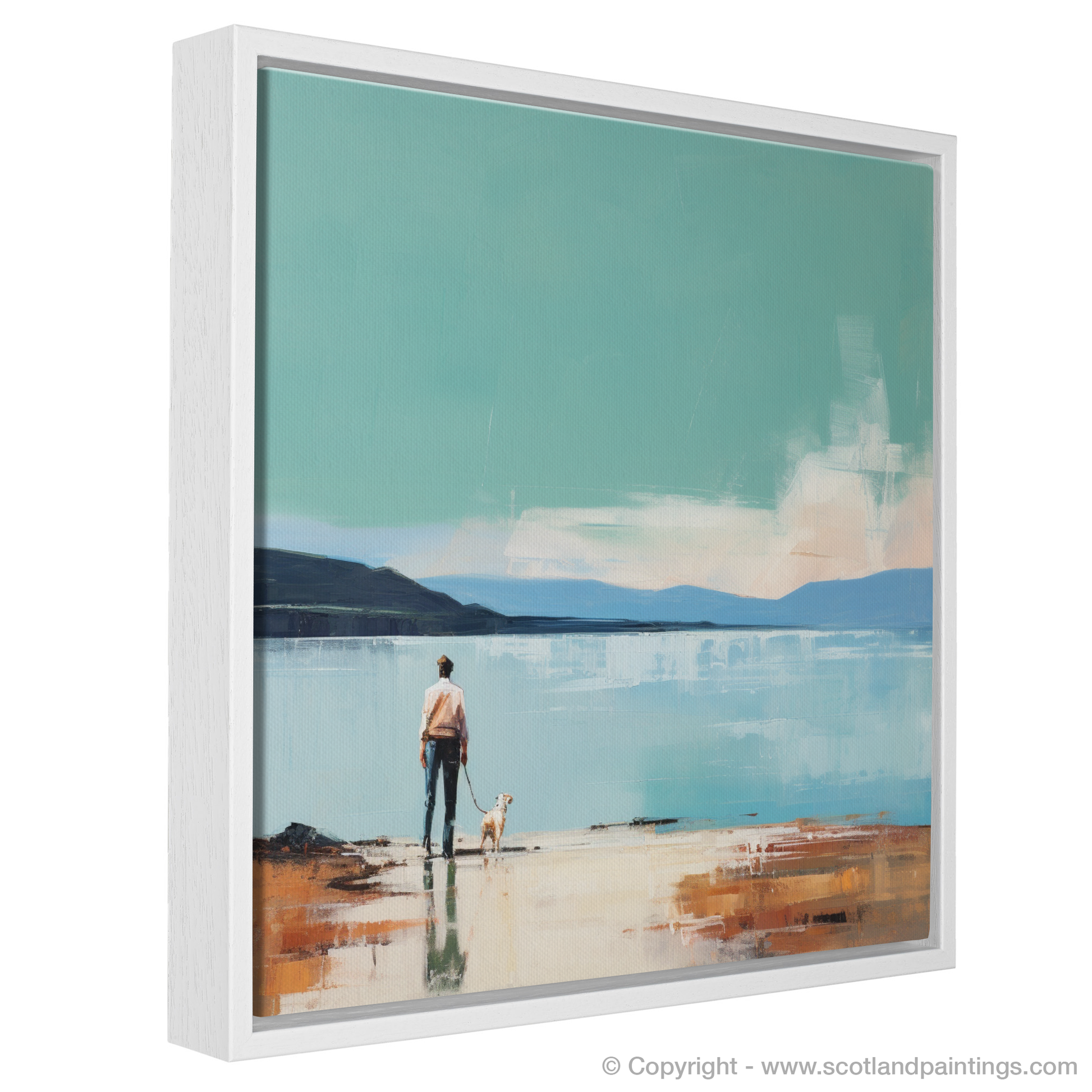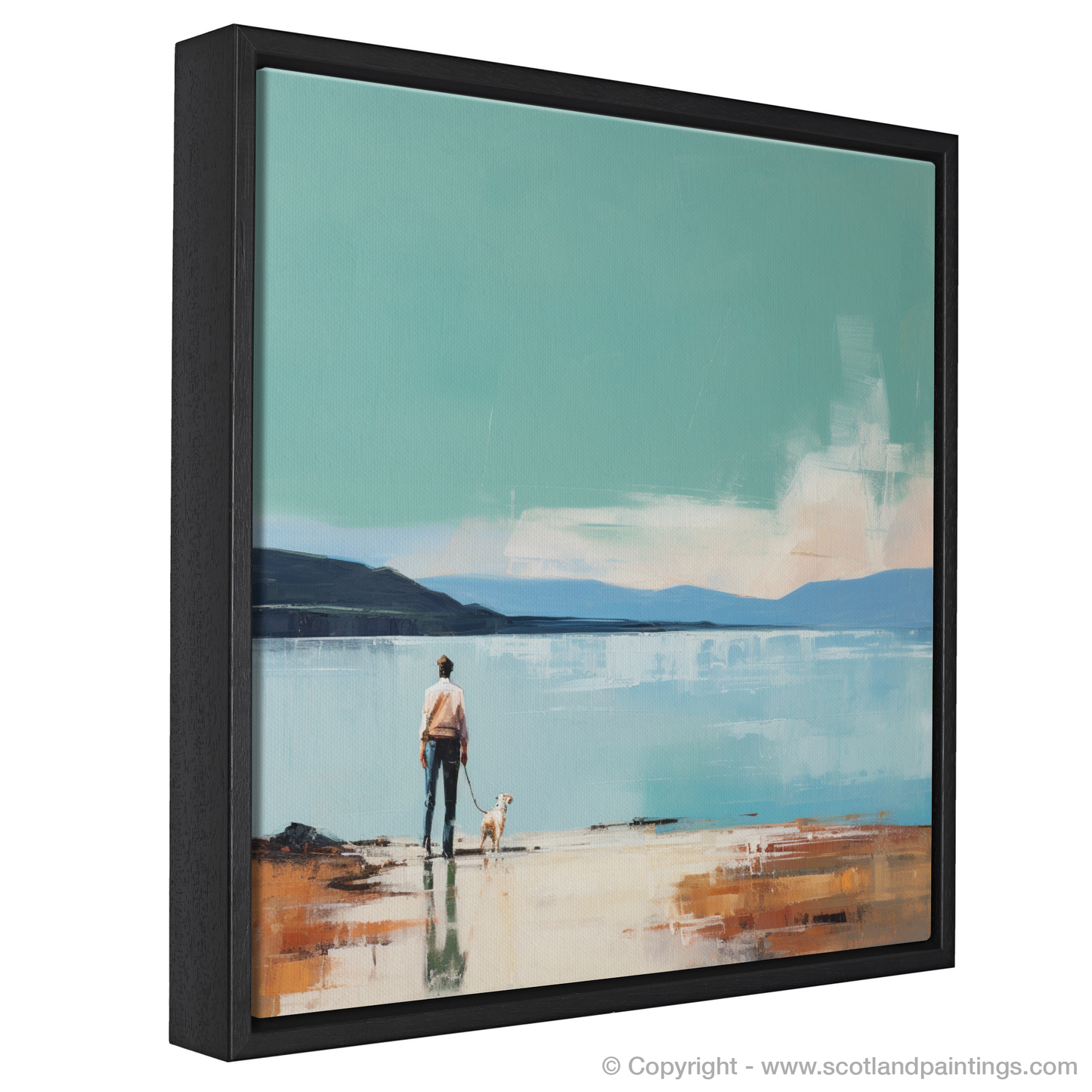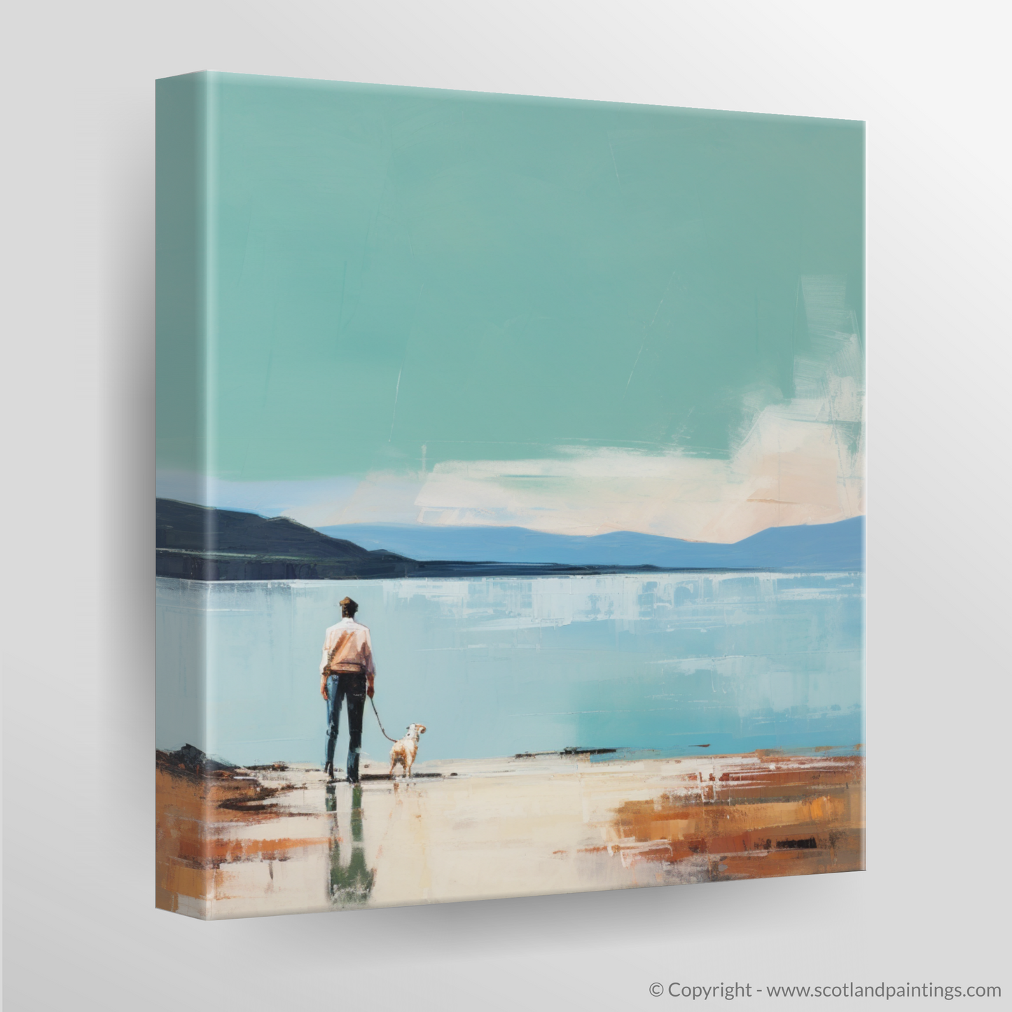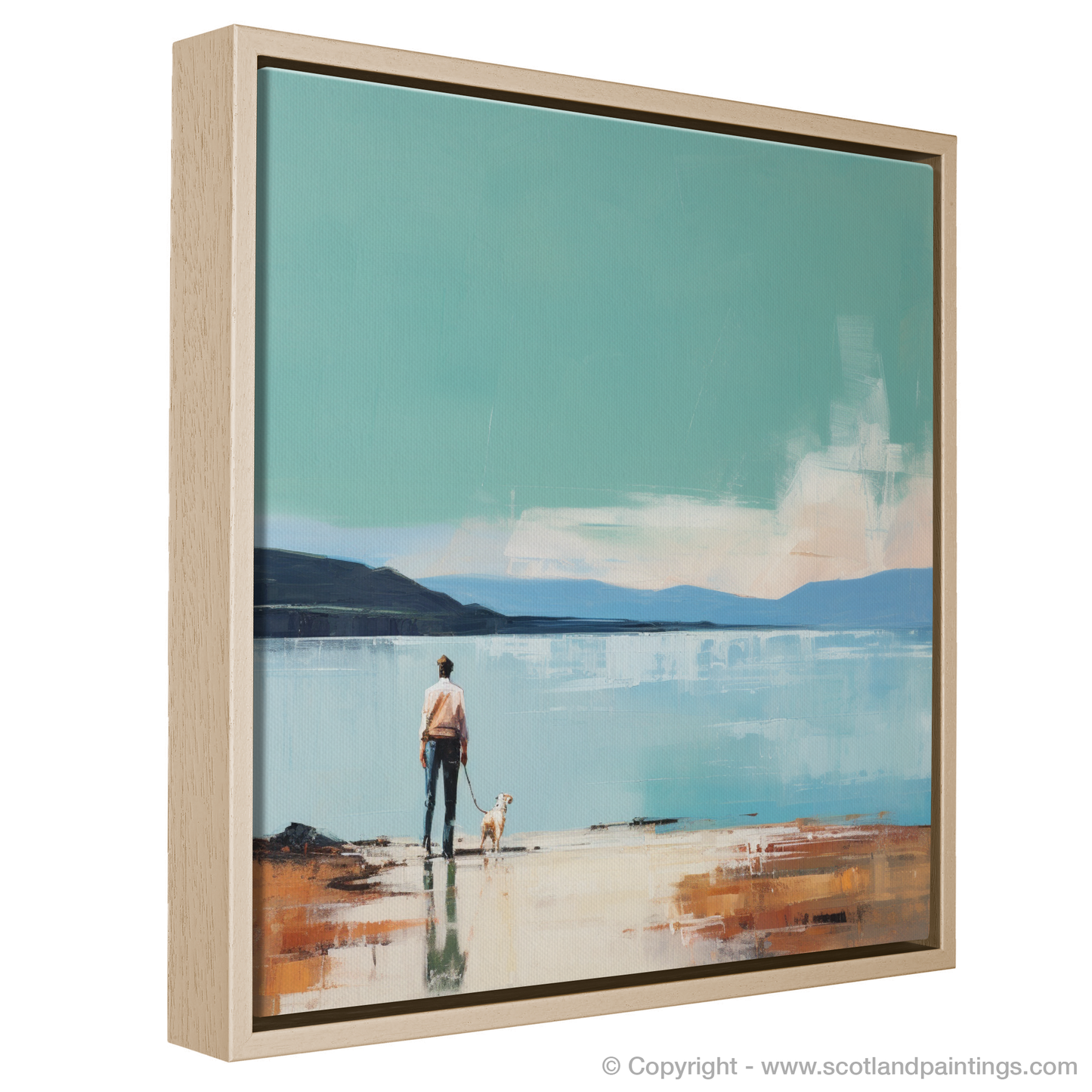 Capturing the serene beauty of Loch Lomond, this captivating print brings to life a harmonious moment shared between a man and his loyal canine companion. The vivid blues of the water blend effortlessly with the expansive sky, punctuated by gentle strokes of white and soft peach, suggesting the calm passage of clouds. The distant rolling hills, rendered in subtle shades of blue and green, quietly frame the tranquil waterscape.