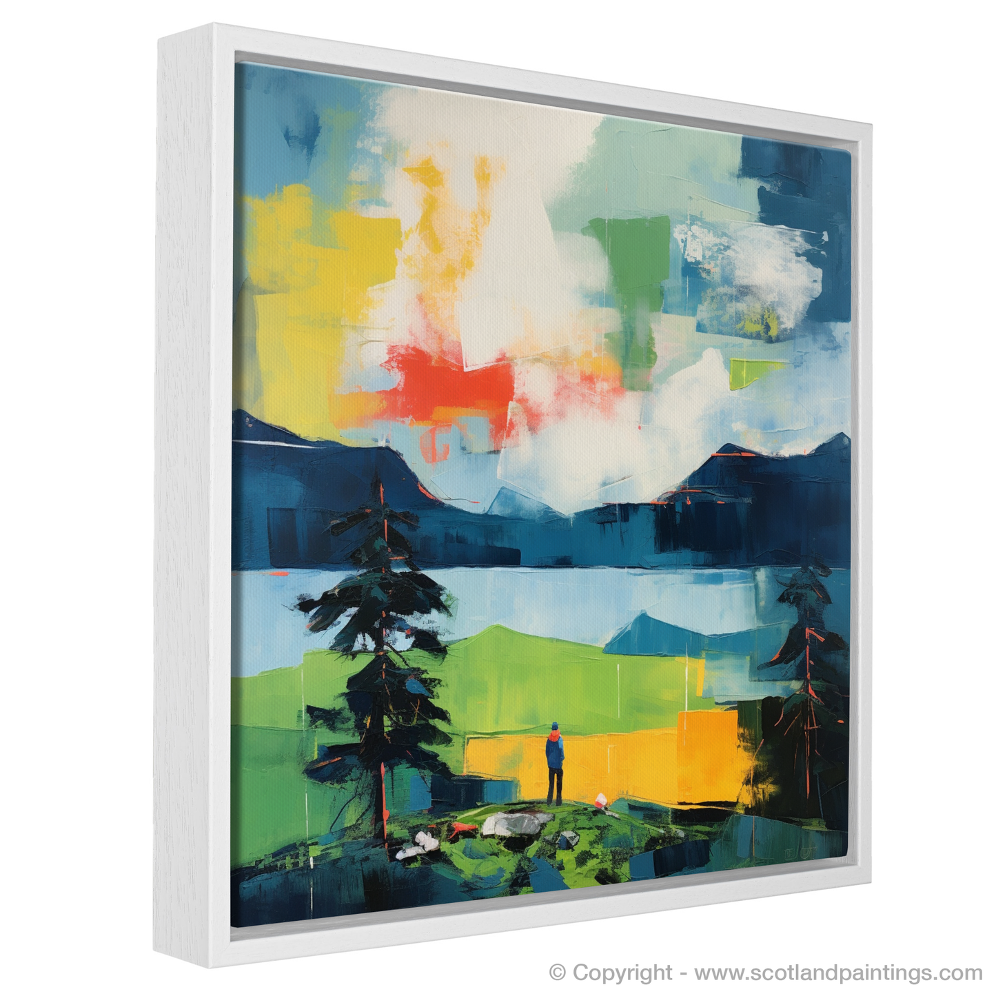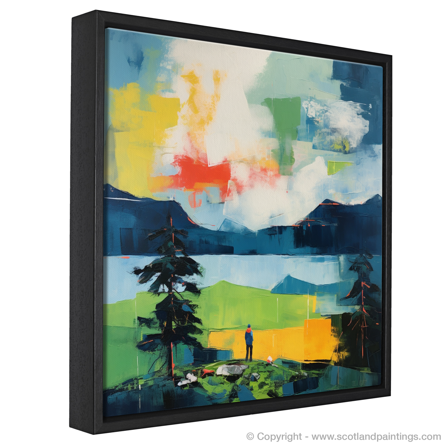 Step into a vista of vibrant colours and evocative forms with this abstract rendering of two hikers gazing upon the majestic Loch Lomond. Bolstered by broad strokes and a vivid palette, this print captures the essence of the Scottish landscape through a tapestry of blues, greens, and unexpected splashes of red and yellow, invoking the many moods and lights of the highlands.
