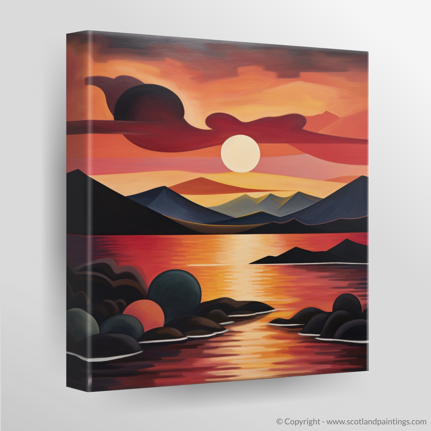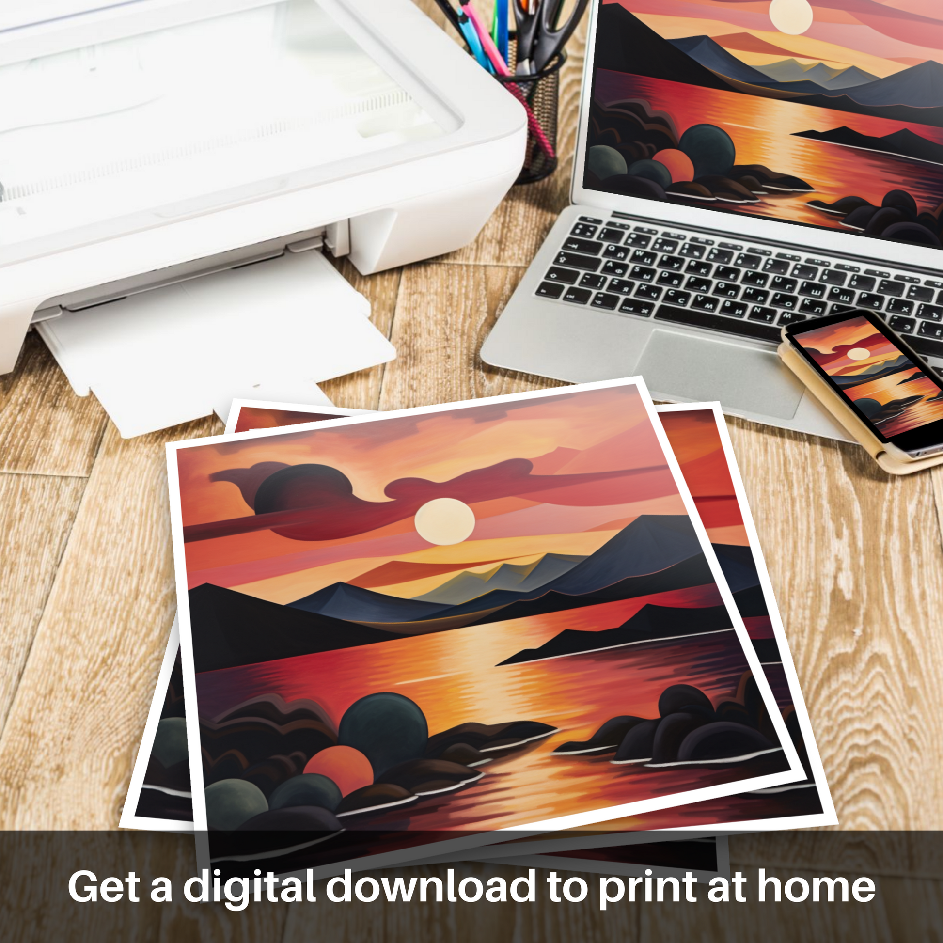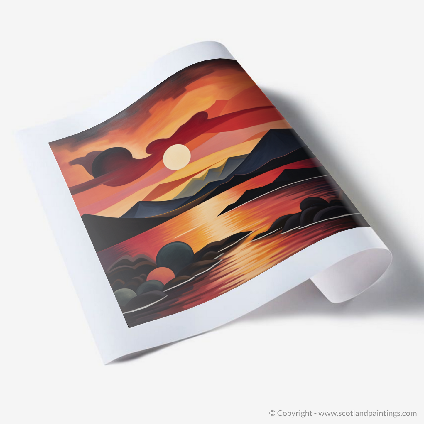 Experience the vibrant allure of dusk reflected in this captivating abstract print portraying Sunset over Loch Lomond. This piece is an enchanting symphony of colors ranging from the warm hues of crimson and amber to the cooler tones of navy and charcoal. The bold sun takes center stage, bleeding its radiance into the surrounding sky, while below it, a series of undulating mountain silhouettes cast a dramatic backdrop.