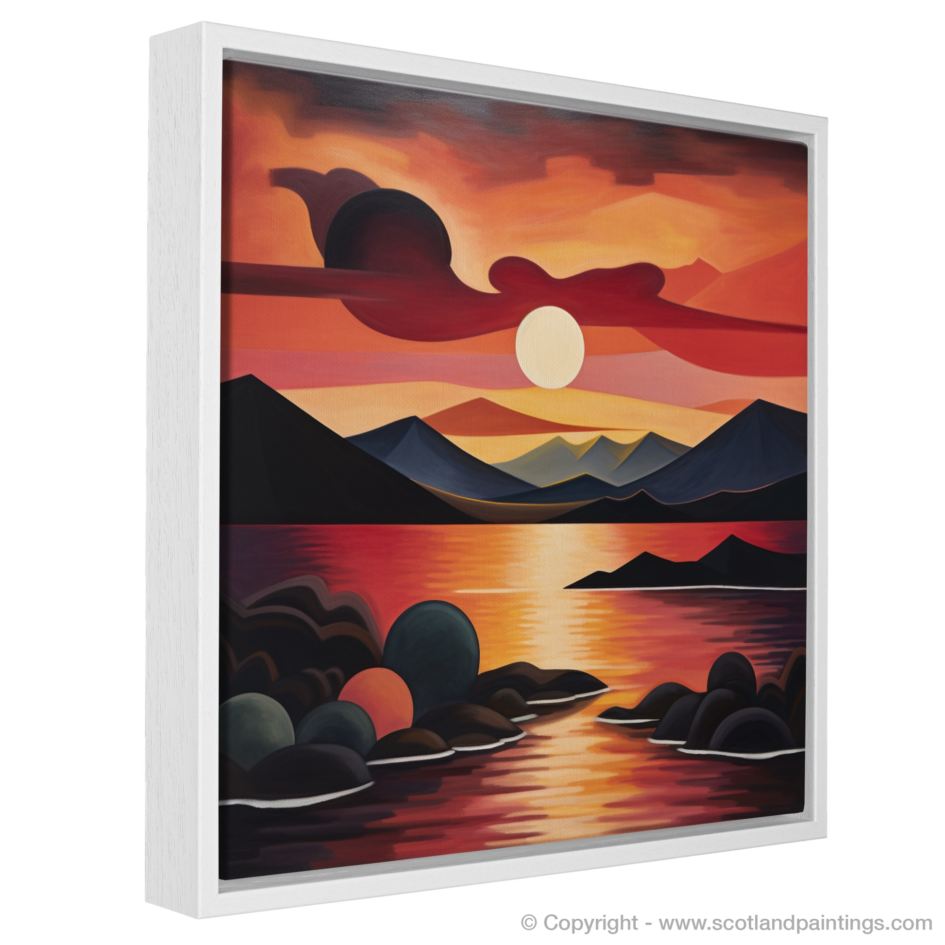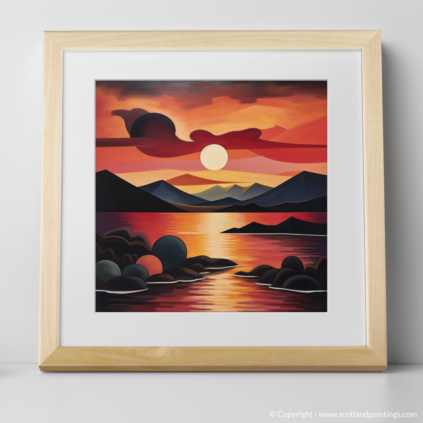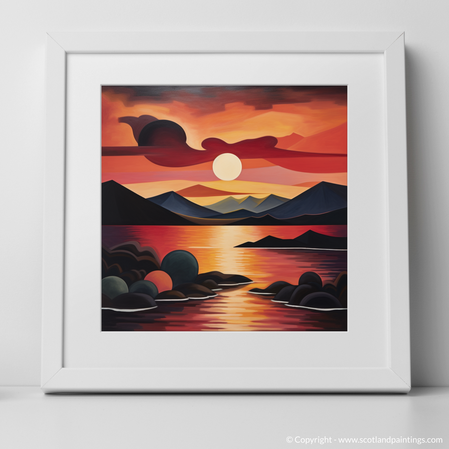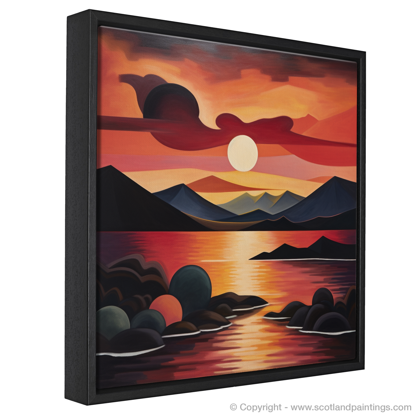 Experience the vibrant allure of dusk reflected in this captivating abstract print portraying Sunset over Loch Lomond. This piece is an enchanting symphony of colors ranging from the warm hues of crimson and amber to the cooler tones of navy and charcoal. The bold sun takes center stage, bleeding its radiance into the surrounding sky, while below it, a series of undulating mountain silhouettes cast a dramatic backdrop.