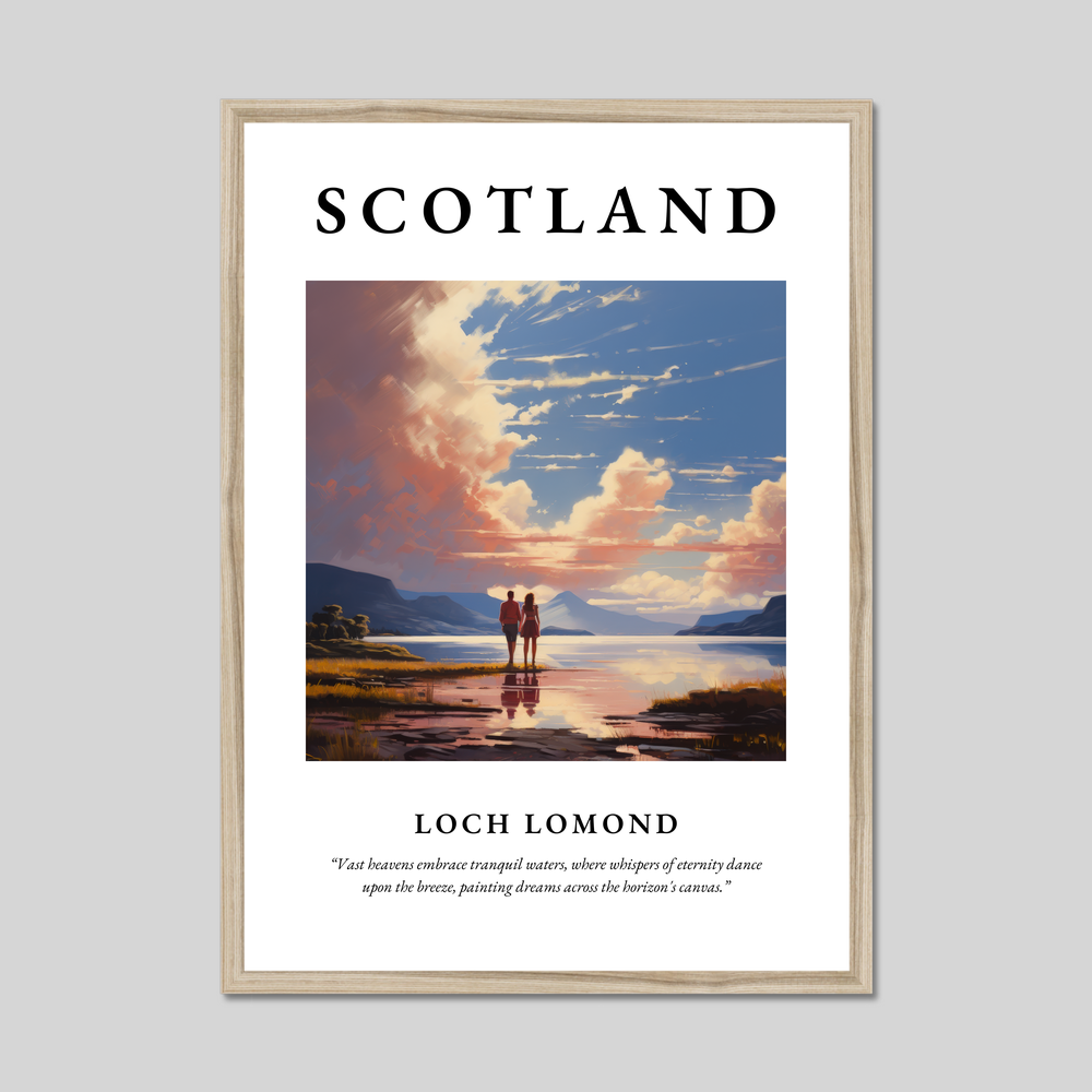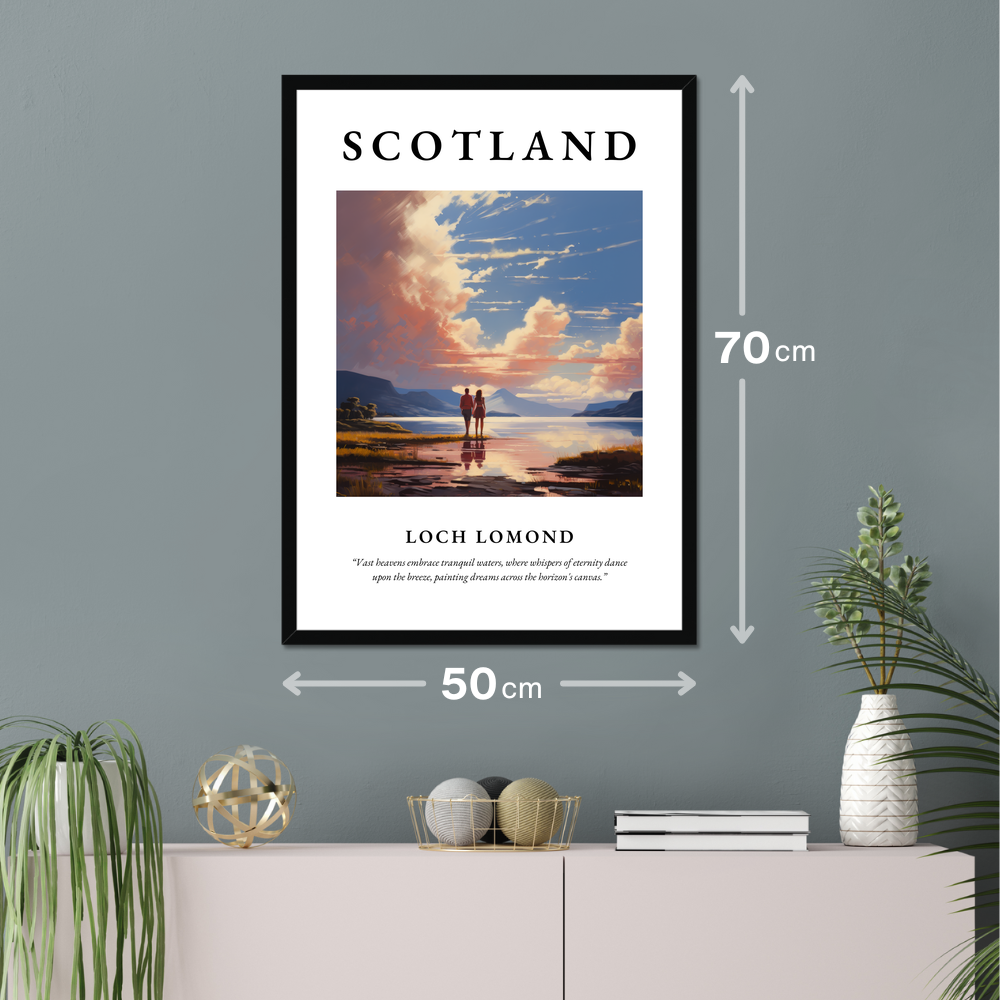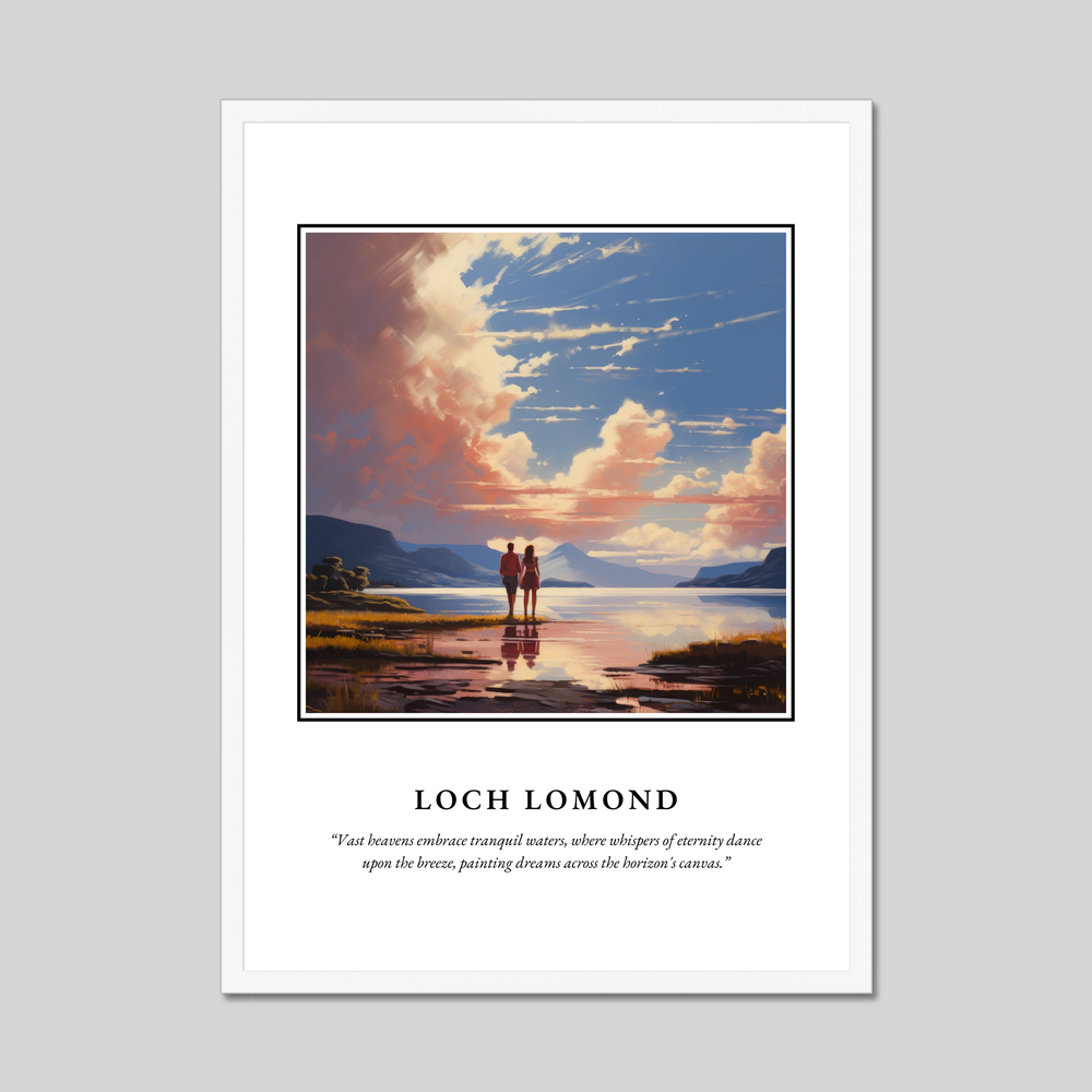 The poster prominently features the word “SCOTLAND” in bold lettering, above the scene of Loch Lomond, inviting all those who gaze upon it to explore the depth and charm of this iconic location. Below the painting, a poetic quote beautifully encapsulates the essence of the locale: “Vast heavens embrace tranquil waters, where whispers of eternity dance upon the breeze, painting dreams across the horizon's canvas.” This large-scale artwork commands attention, effortlessly transforming your wall space without breaking the bank.