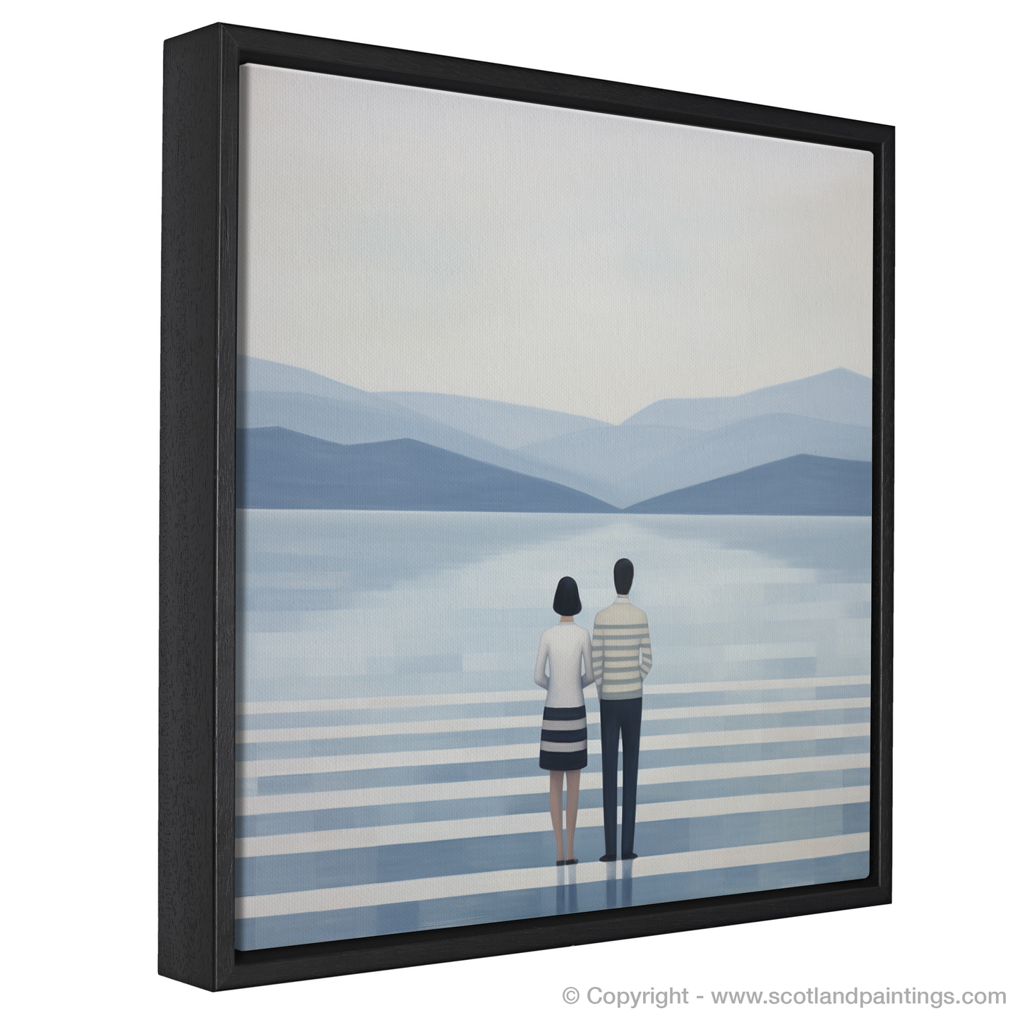 Capture the essence of tranquillity and companionship with this serene depiction of a couple standing hand-in-hand, gazing out over the calm expanse of Loch Lomond. The artwork embodies the aesthetic principles of minimalism, utilising a subdued palette and simplified forms to evoke a sense of peace and spaciousness.
