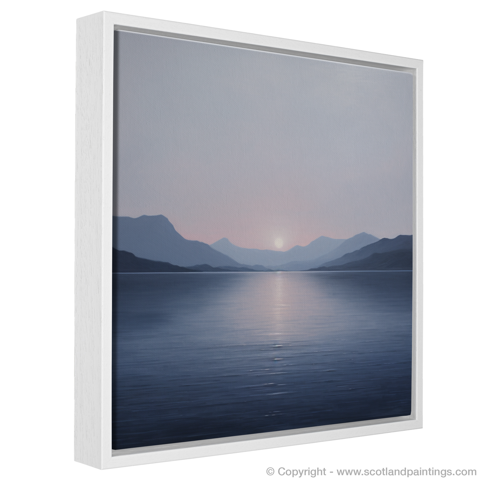 This evocative piece captures the serene beauty of Dusk on Loch Lomond with a minimalist's touch. The composition is a harmonious blend of tranquility and subtlety, using a restrained colour palette that echoes the quietude of the scene. In the forefront lies the glassy expanse of the loch, its surface reflecting the gentle kiss of twilight with soft ripples that draw the eye to the horizon. This body of water shimmers with gradients of dusky blues and muted purples, suggesting the cool whisper of evening air.