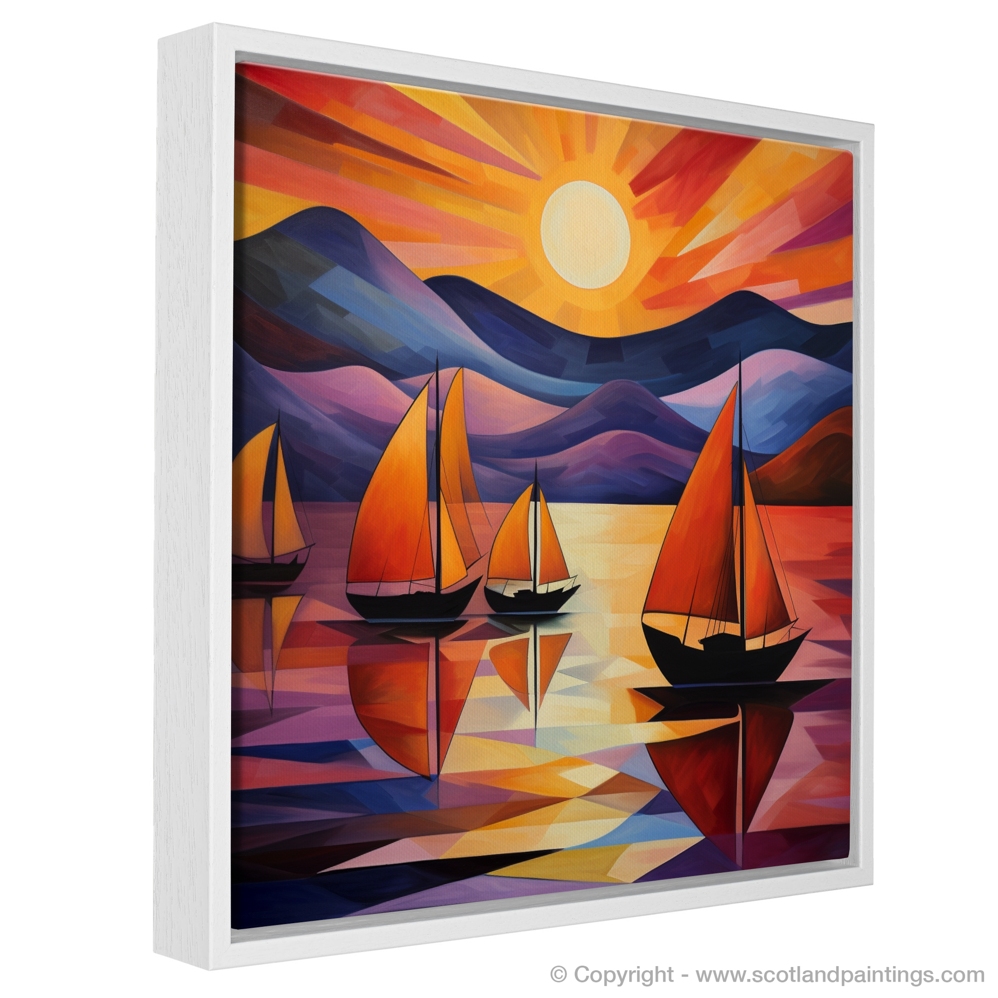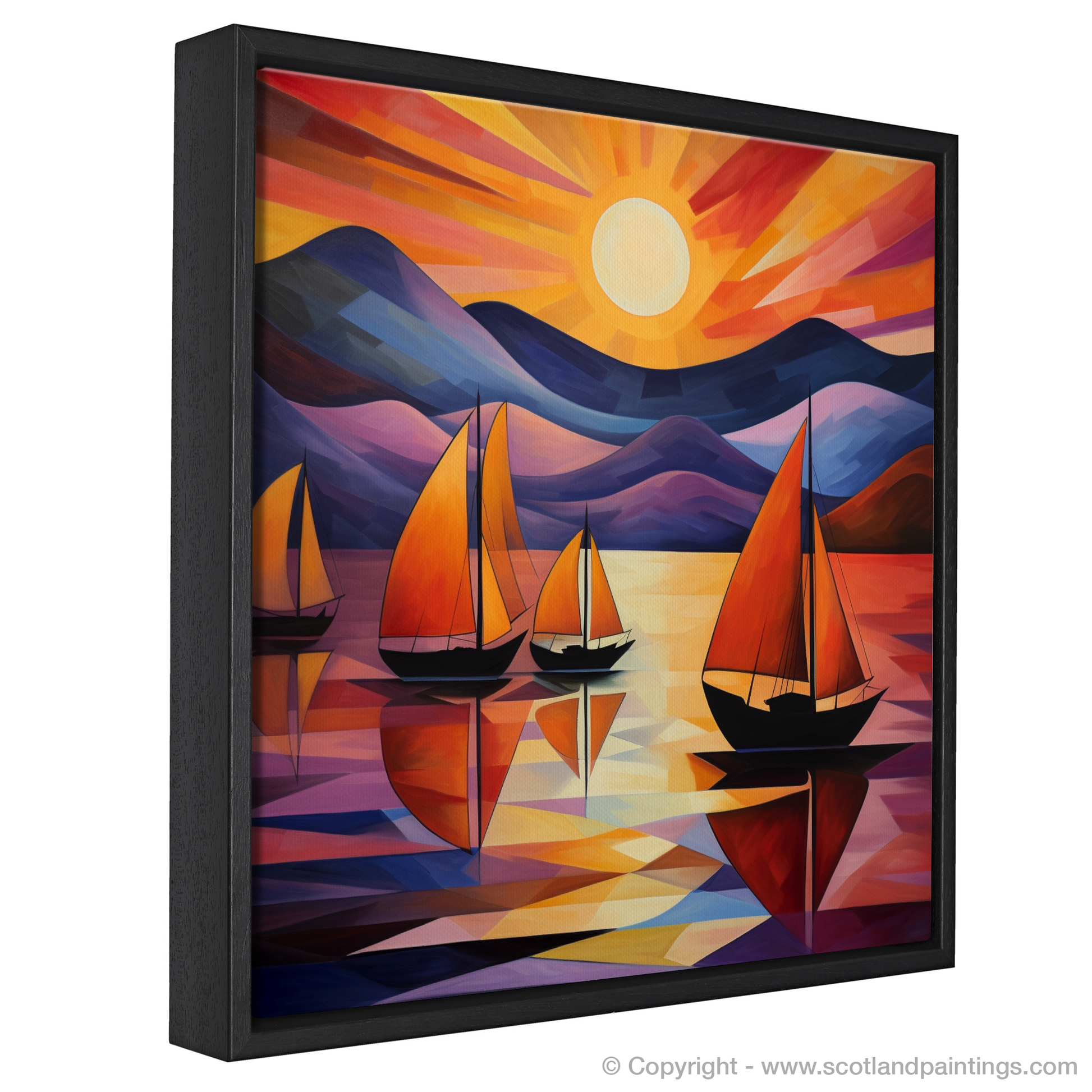 The focal point of the piece is a fleet of elegant sailing boats, their sails full and richly coloured in shades that echo the sunset itself, ranging from deep oranges to warm, inviting reds. Black hulls anchor the composition, while the sails' crisp geometry adds a sense of movement and rhythm. The reflection of the boats and the sun in the water is rendered with a mosaic of fragmented colour, lending a serendipitous calmness to the piece.