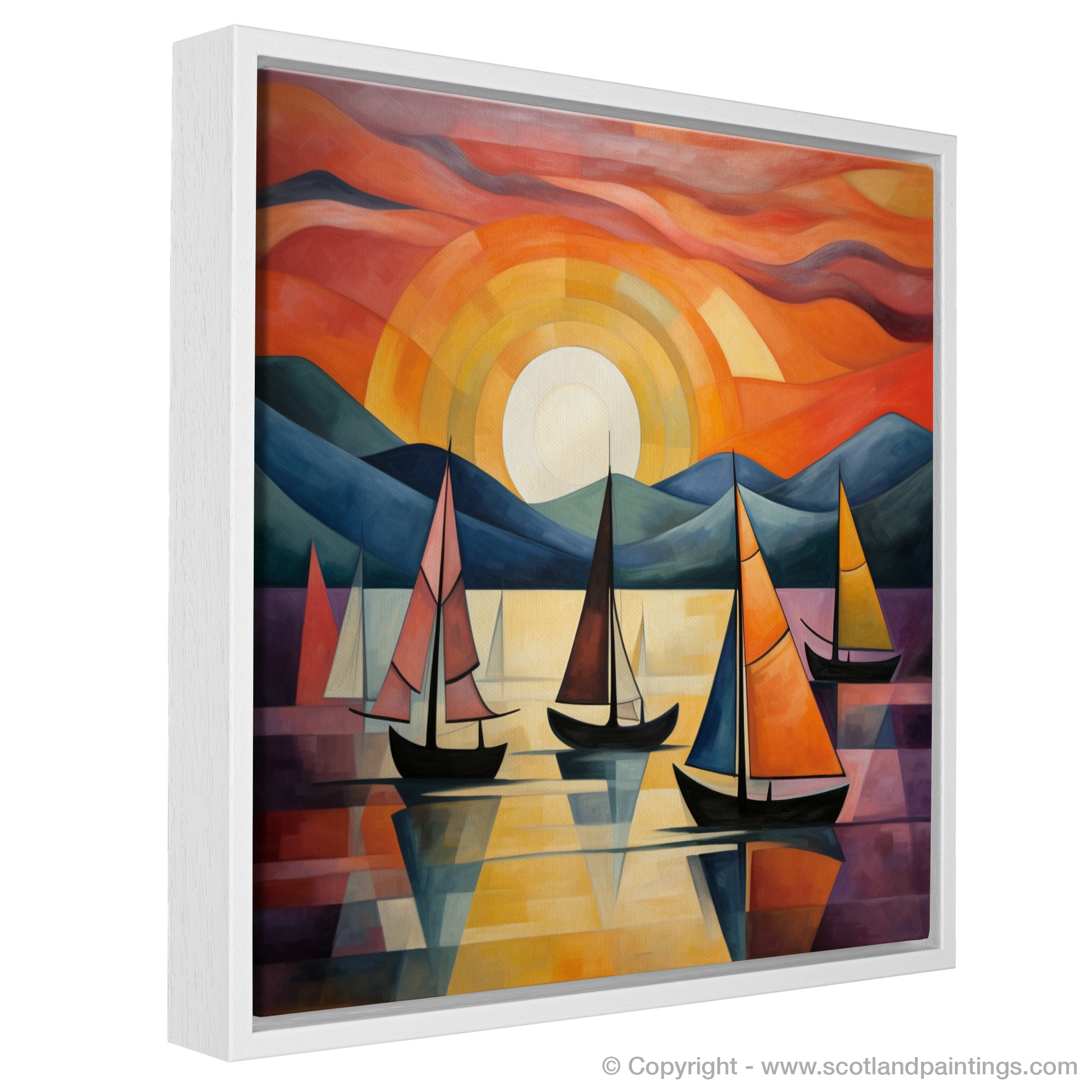 Capturing the serene majesty of Loch Lomond at the waning hours of daylight, this exquisite print features a fleet of sailing boats gracefully navigating the tranquil waters. The artwork masterfully employs abstract styling to evoke the natural splendour of the loch and its surroundings. Bold geometric shapes suggest the gentle roll of hills, while the fluid lines of the sails and hulls convey a sense of motion and elegance.