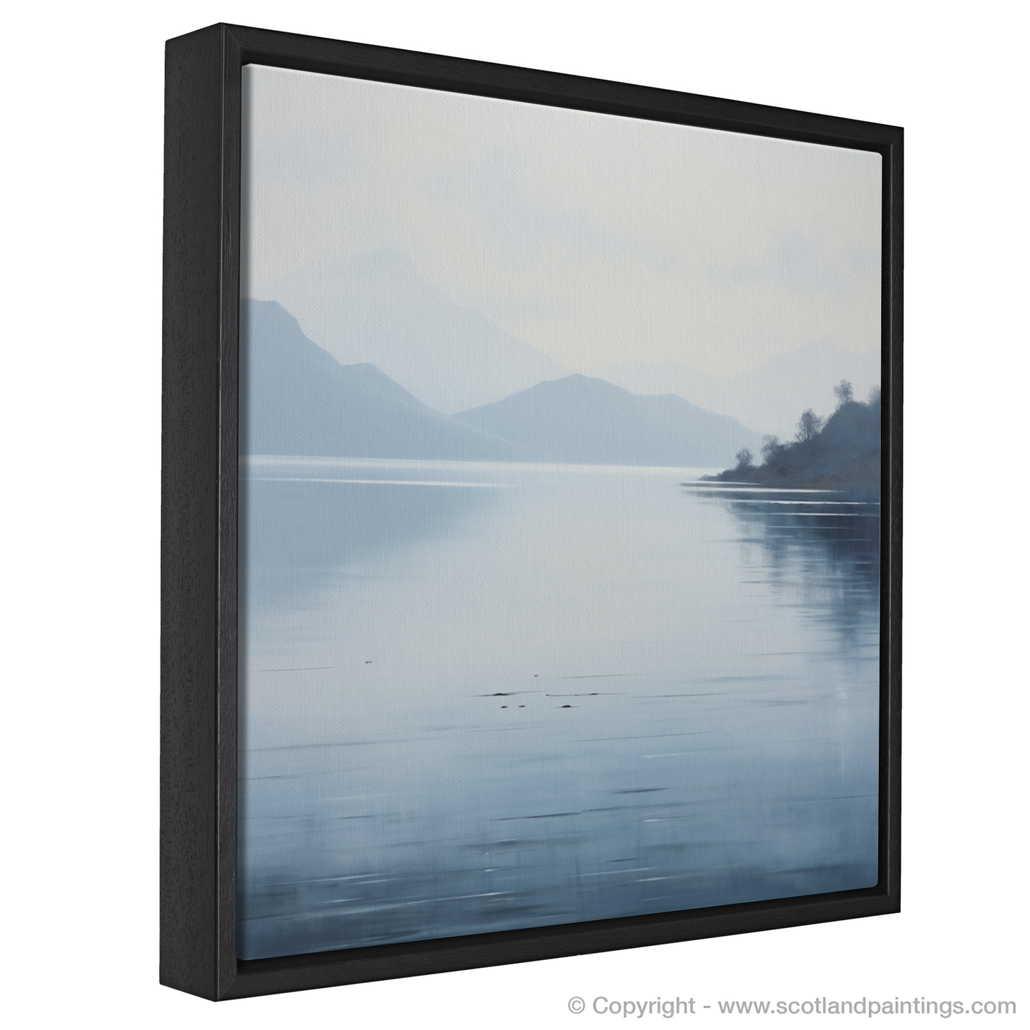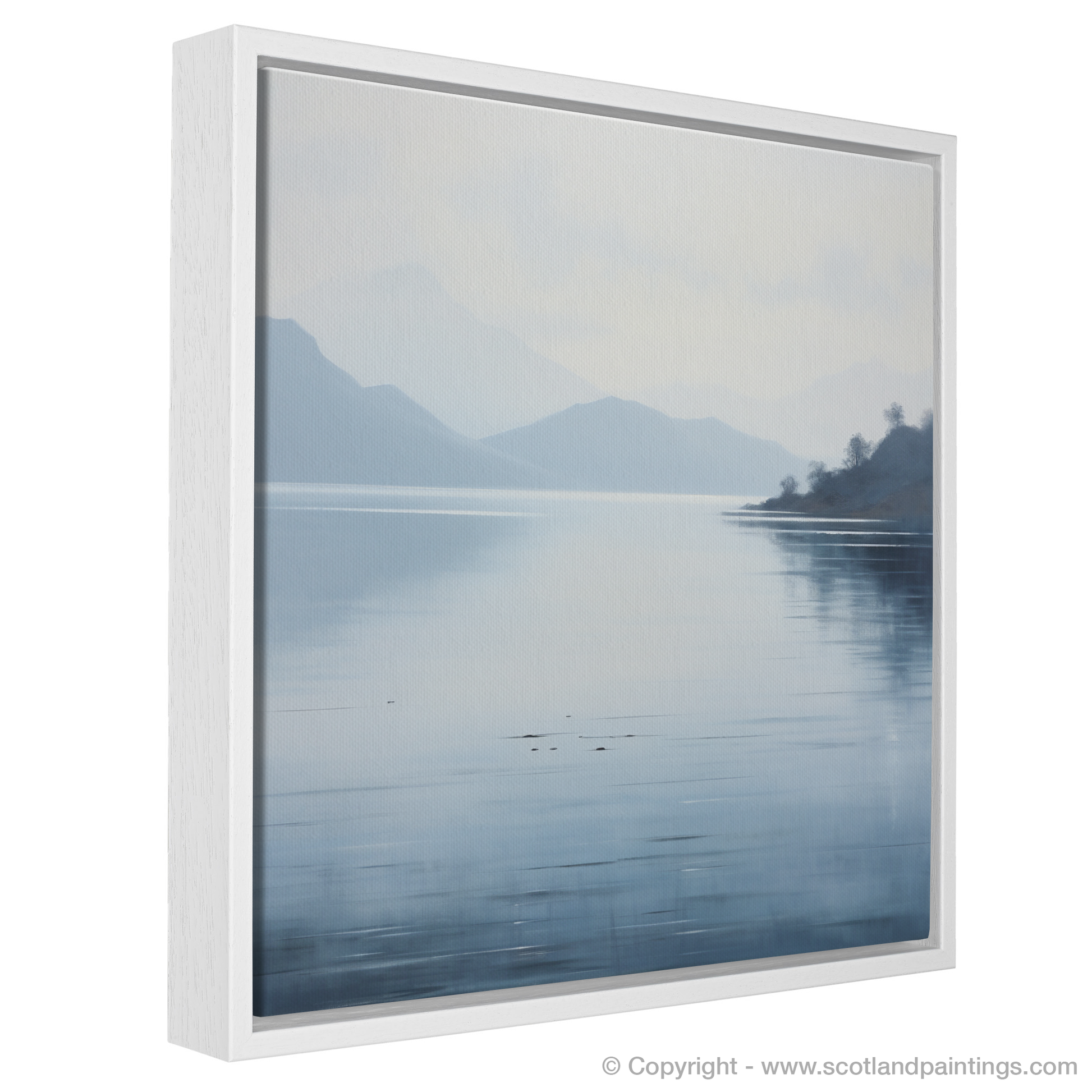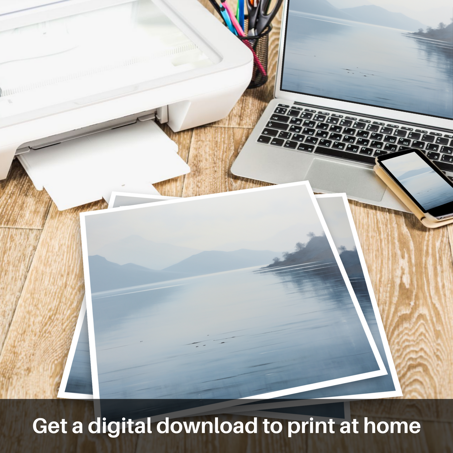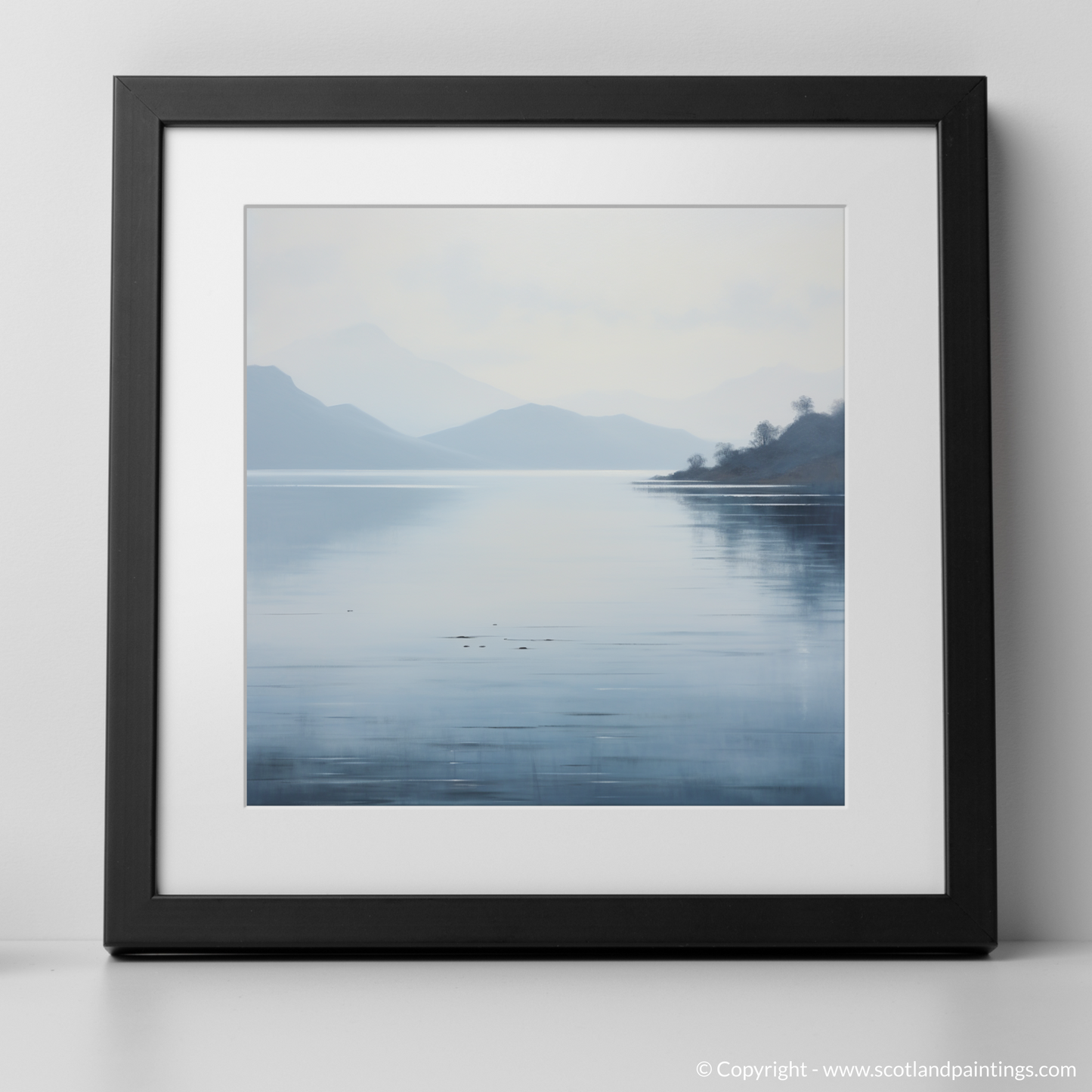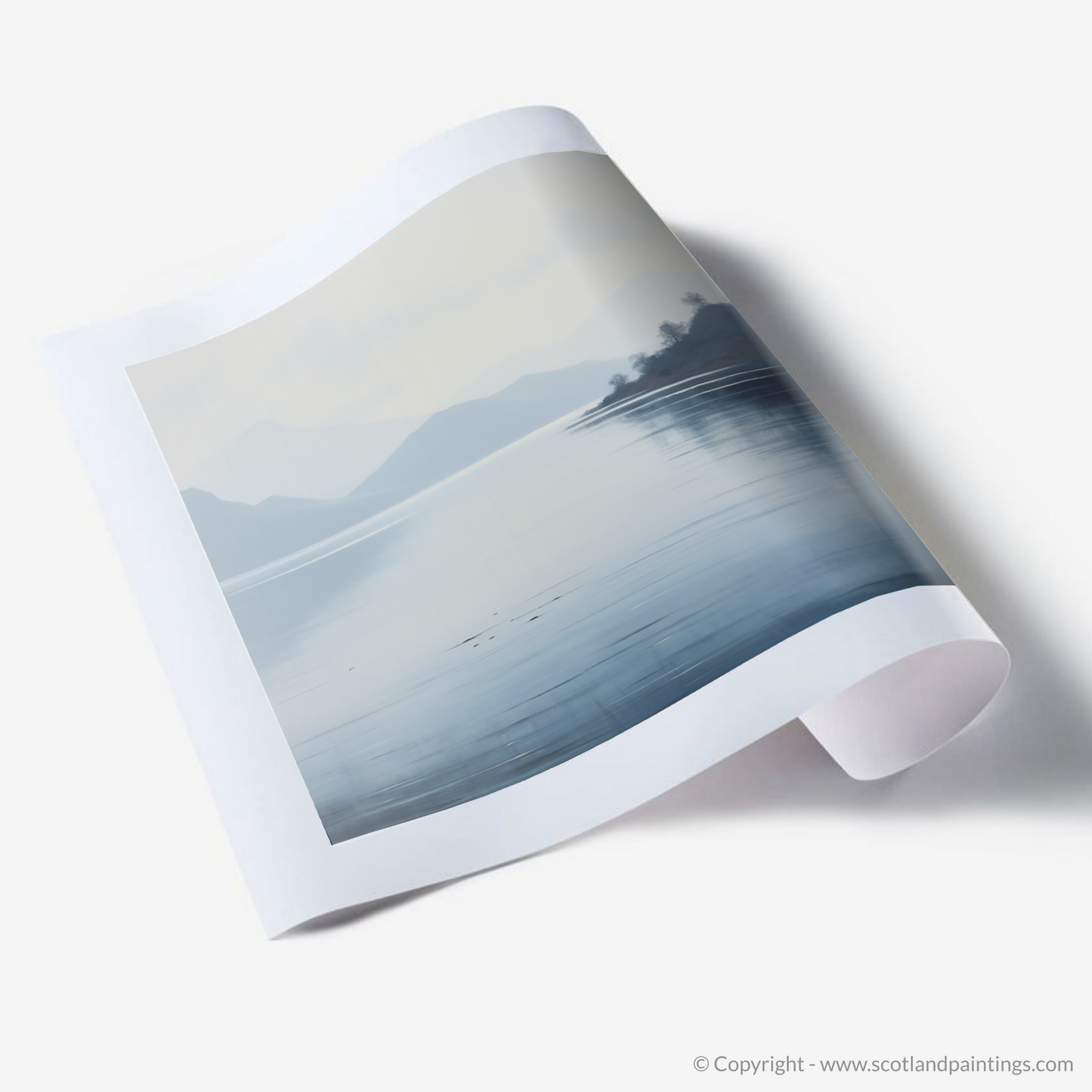 Capturing the serene essence of a misty morning, this evocative print presents the tranquil beauty of Loch Lomond in a minimalist style. The cool colour palette is dominated by soft blues and whites, reflecting the peaceful atmosphere of the loch at dawn. Gentle gradations of colour suggest the quiet lapping of water on the loch's surface and the soft outlines of distant hills shrouded in mist. The composition is one of simplicity and calm, with the fluid interplay of light and reflection drawing the viewer into a moment of contemplation.
