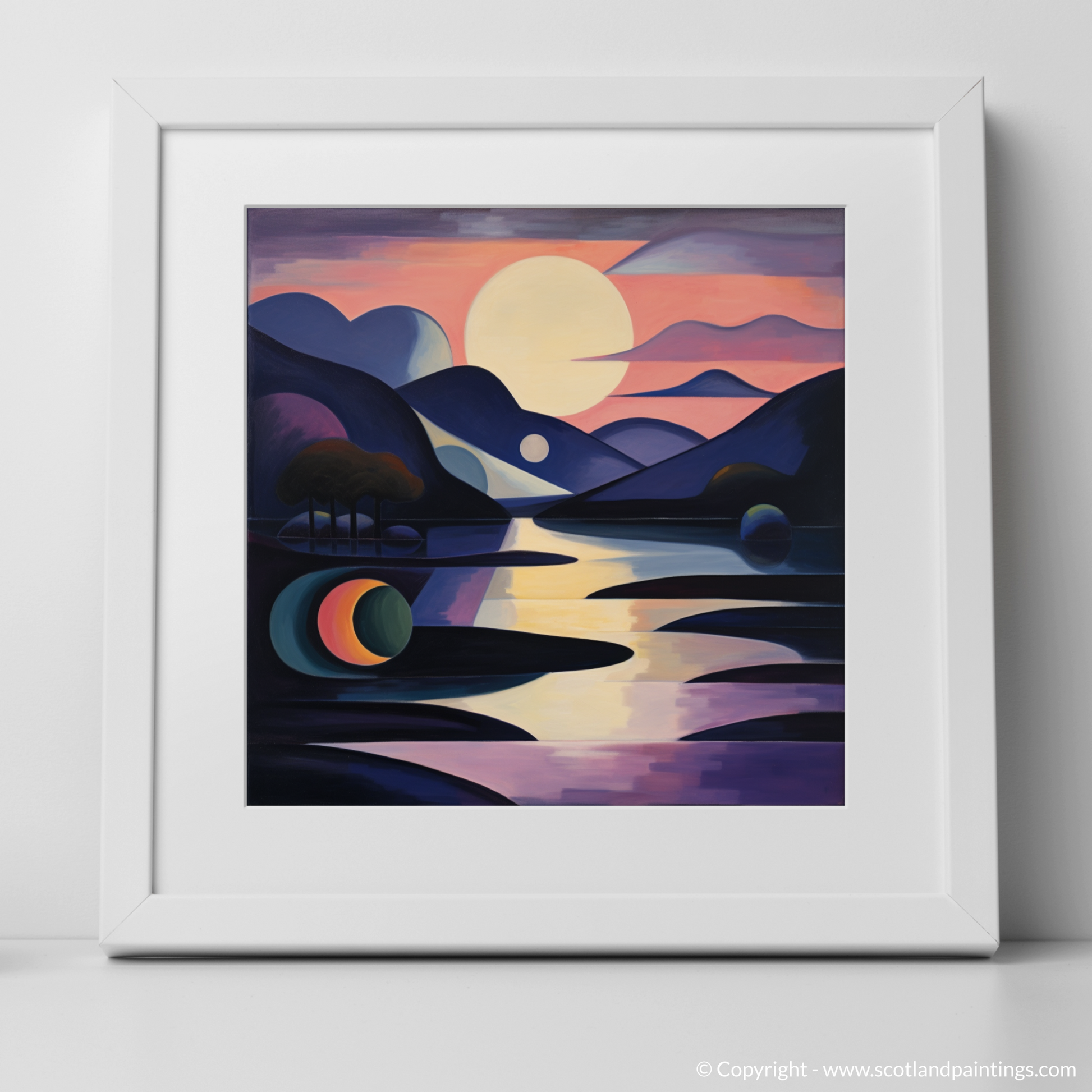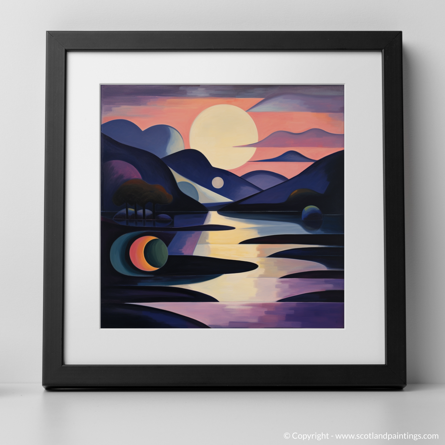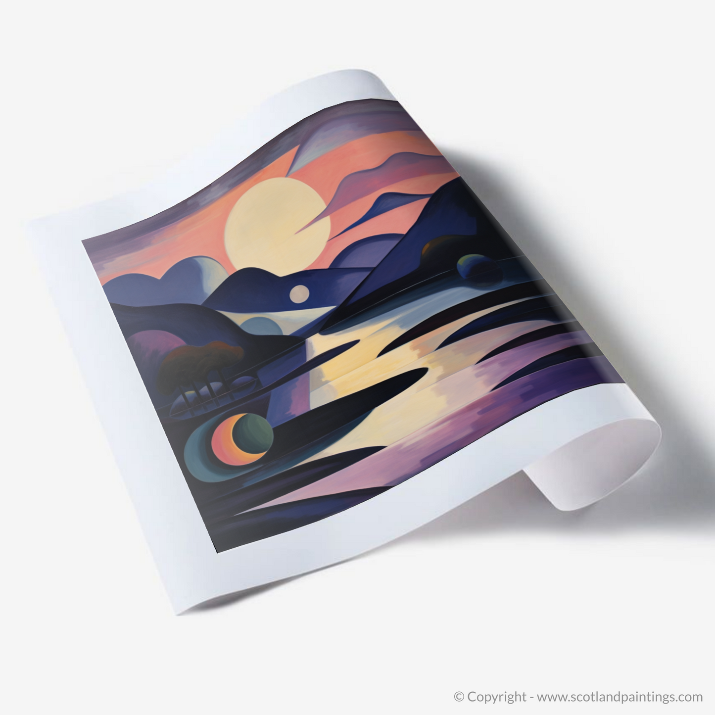 This captivating print is a celebration of the serene and mystical beauty of Loch Lomond, interpreted through the lens of abstract art. The composition captures the essence of twilight as it reflects on the tranquil waters, with a harmonious blend of curved and geometric shapes creating a dynamic yet soothing visual experience.