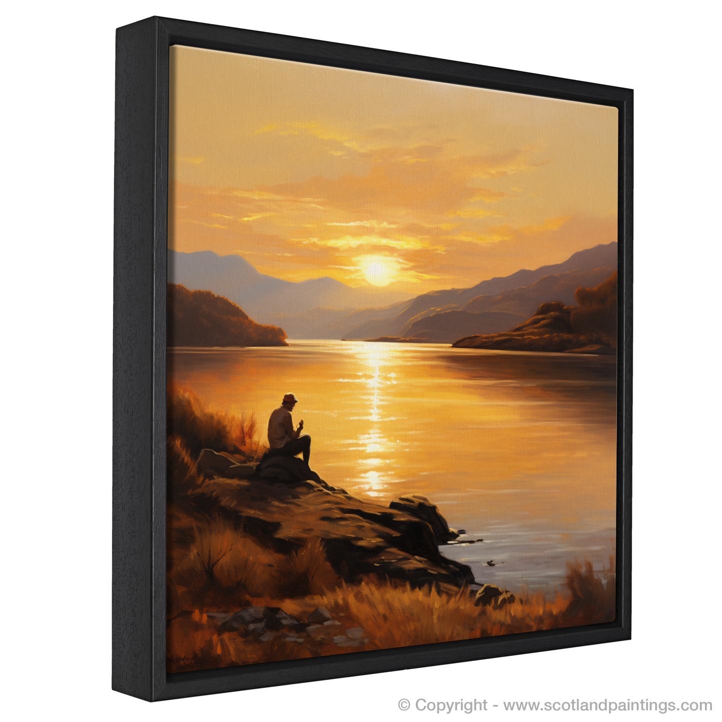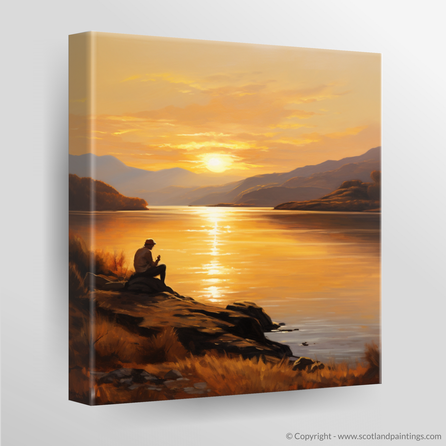The composition places a lone figure at the water's edge, seated on the rugged terrain that gently slopes into the loch. This contemplative individual seems engrossed in the peaceful atmosphere, perhaps lost in thought or simply savouring the majestic sunset. The reflectivity of the water is masterfully rendered, mirroring the golden hues of the sky and enhancing the overall sense of calm.