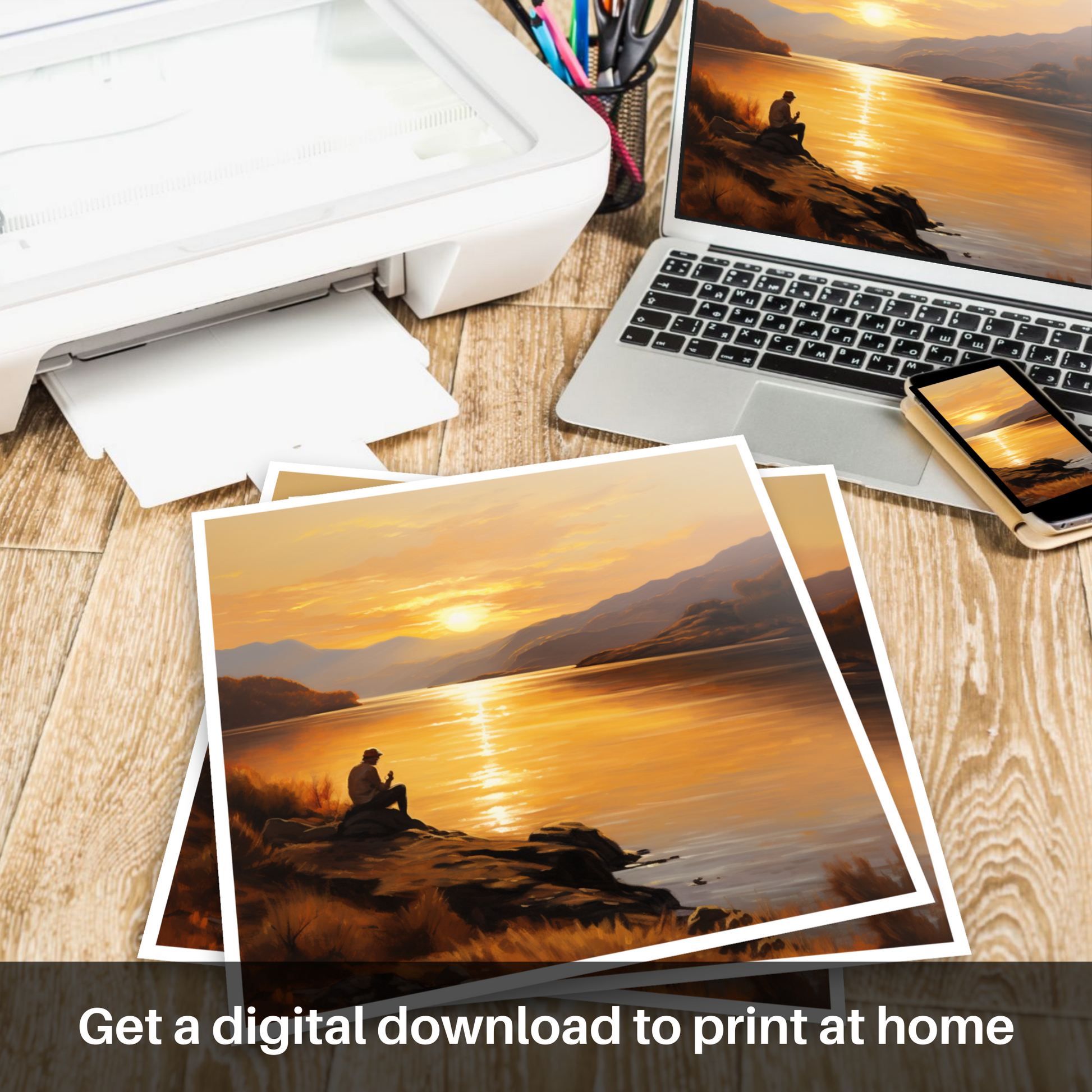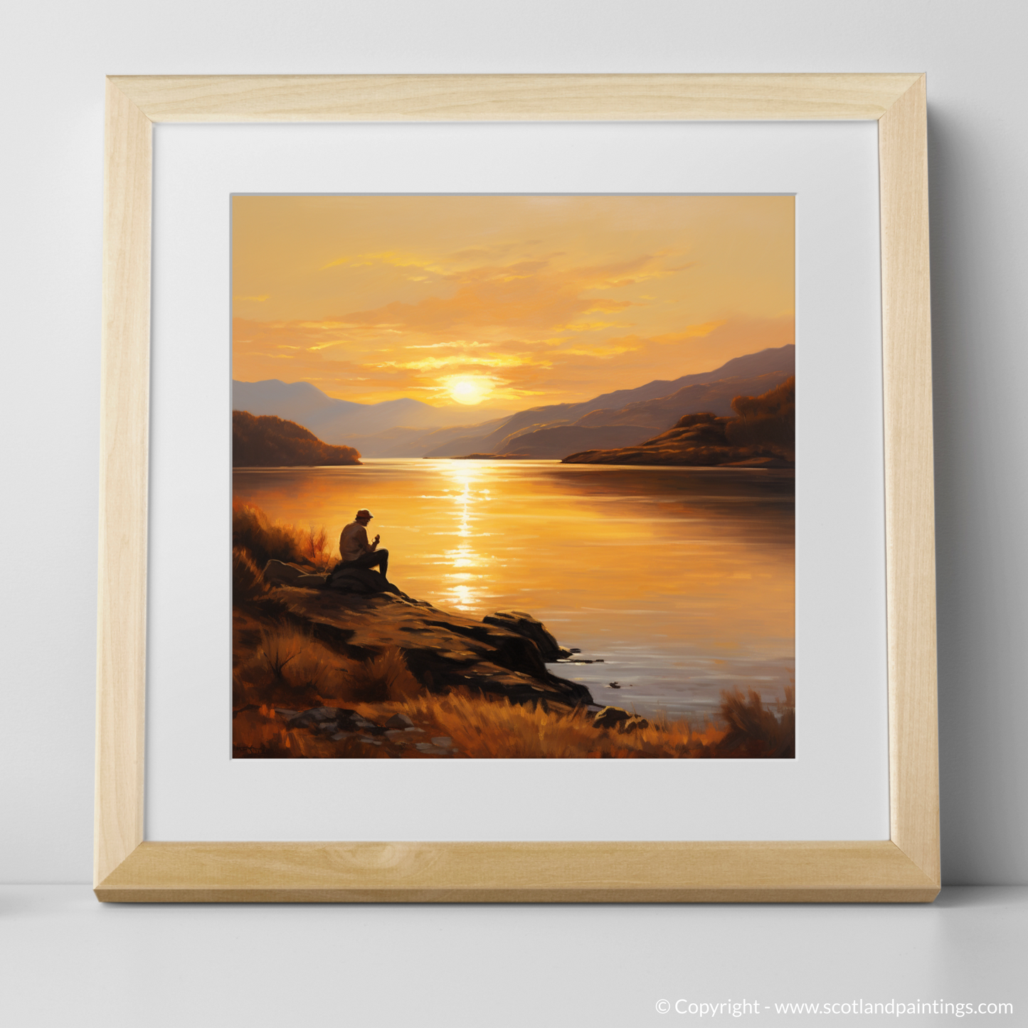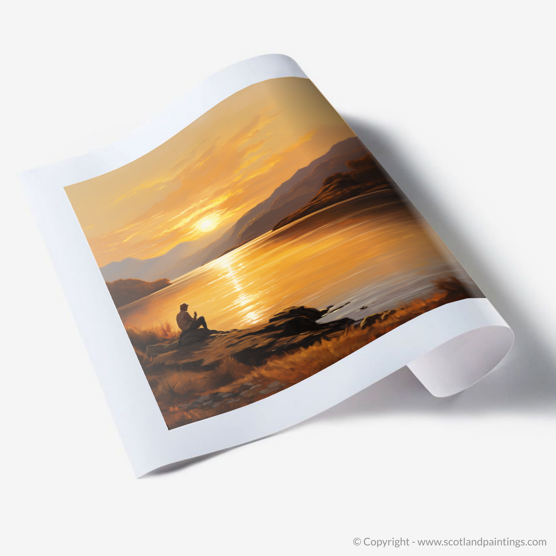 Capturing the serene beauty of Loch Lomond's golden hour, this exquisite print invites viewers into a scene of natural splendour. The artwork, executed with a realist approach, offers a moment of tranquillity as the sun dips towards the horizon, casting a warm glow that illuminates both sky and water with a harmonious palette of oranges and yellows.