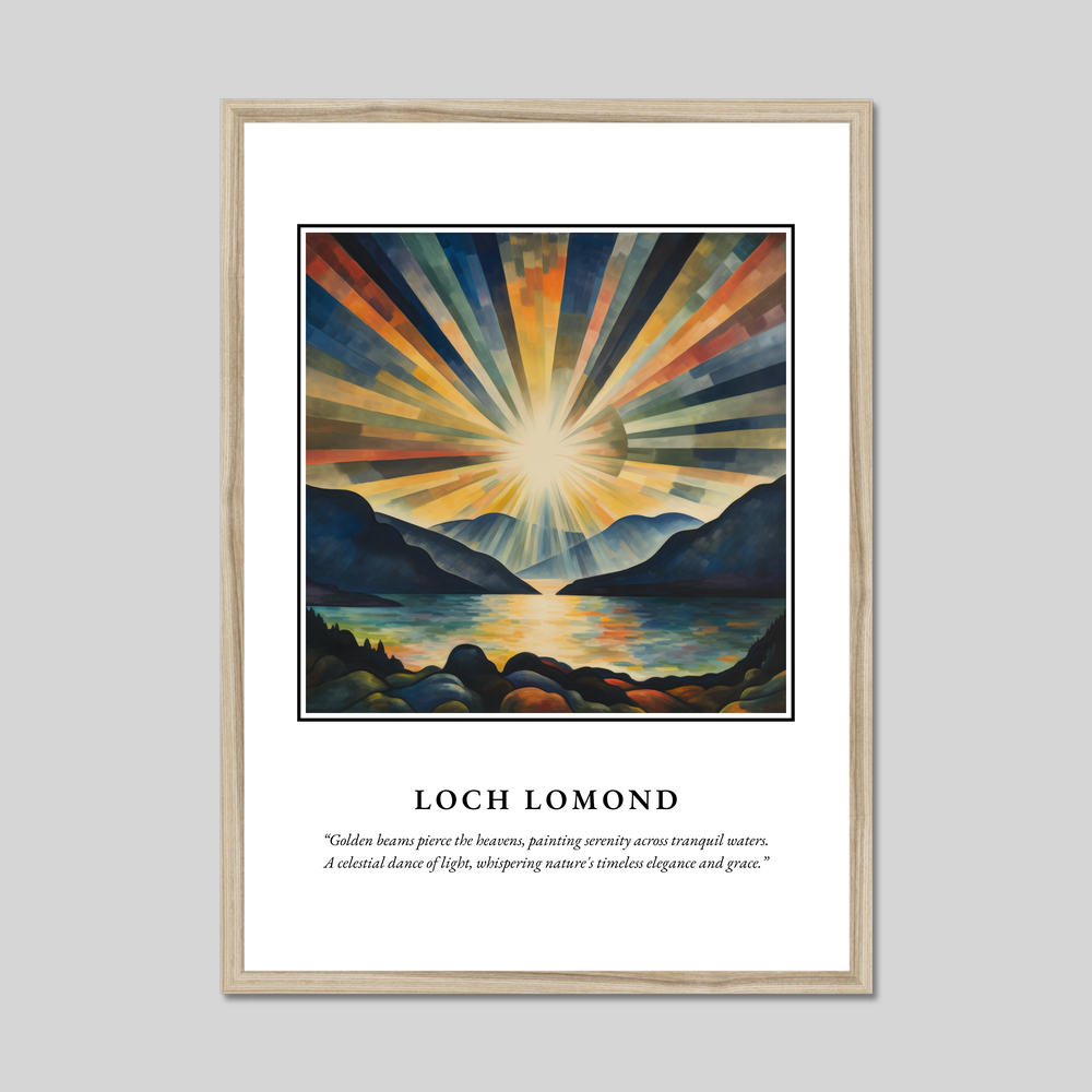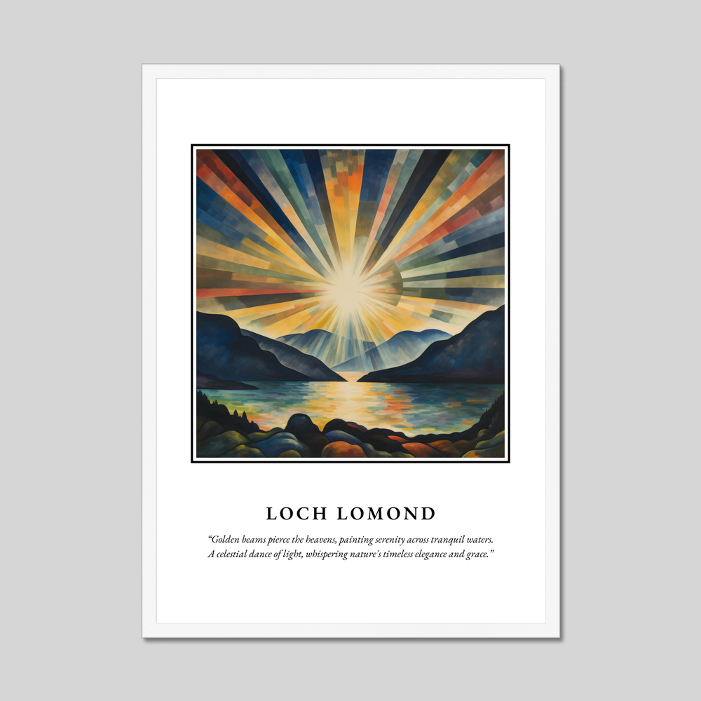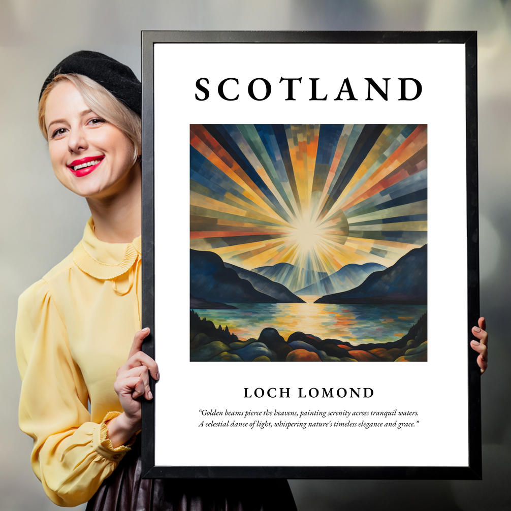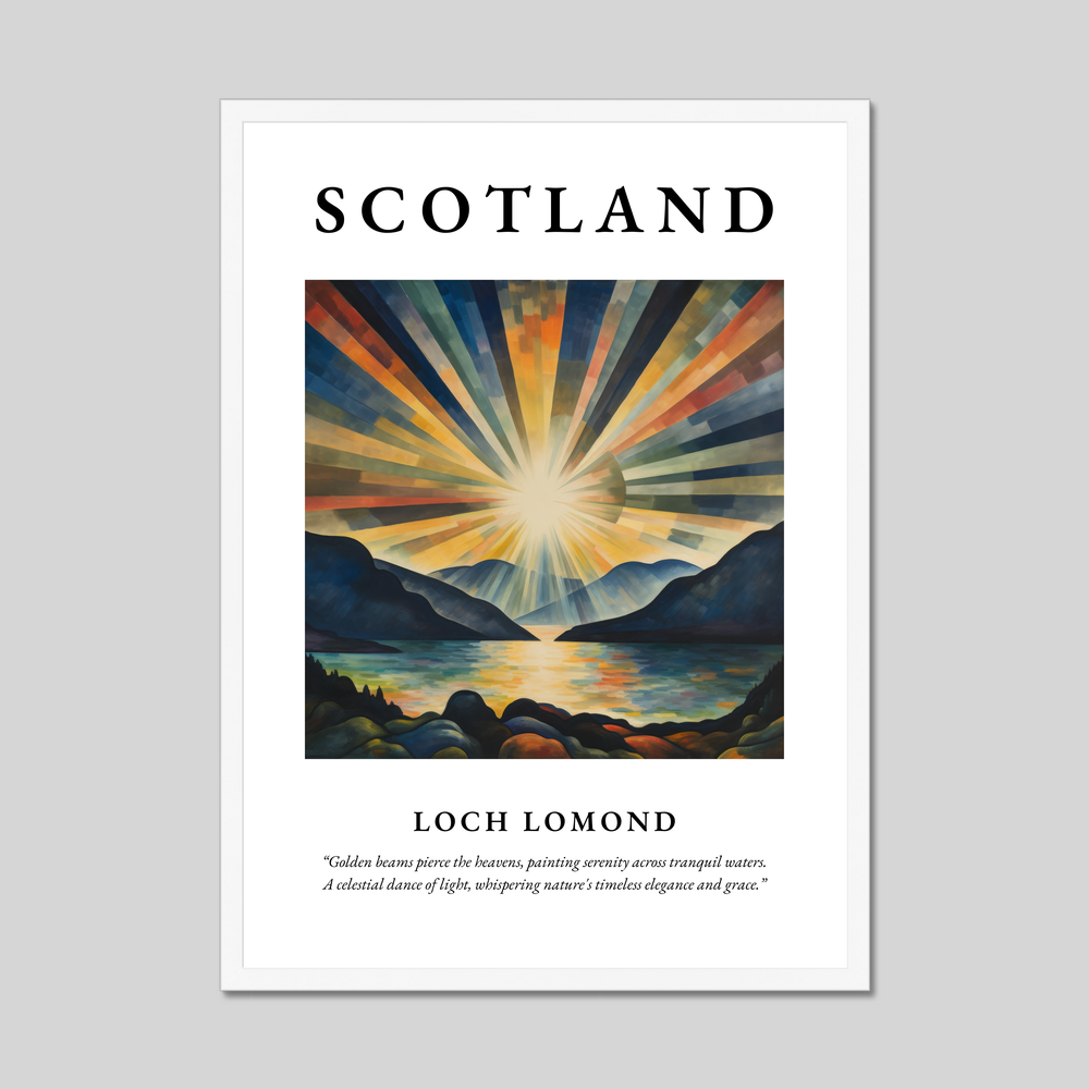 The poster features the word "SCOTLAND" in bold lettering, drawing you into the enchanting scene below. The abstract painting captures the ethereal essence of Loch Lomond, where golden beams of sunlight ripple across serene waters, creating an exquisite tapestry of colour and light. The quote beneath the painting, “Golden beams pierce the heavens, painting serenity across tranquil waters. A celestial dance of light, whispering nature's timeless elegance and grace,” poetically encapsulates the grace and beauty of this remarkable landscape.