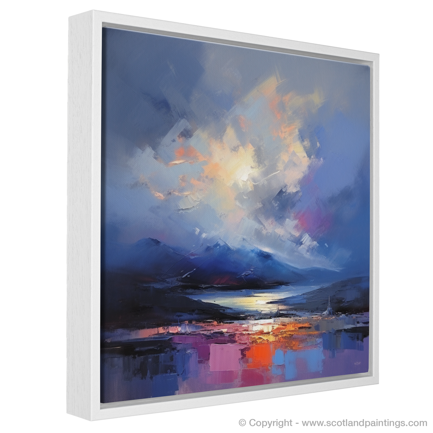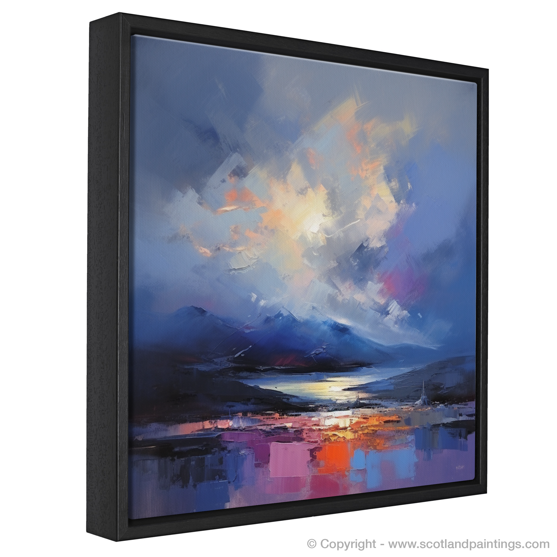Below, the waters of Loch Lomond glimmer with an almost otherworldly quality, mirroring the sky's drama above. The fragmented reflections present a mosaic of colour, with vibrant strokes suggesting the fluid motion of the water as it responds to the gathering winds. Silhouetted mountains rise in the distance, their jagged forms contributing to the overall sense of a landscape both enduring and ephemeral.