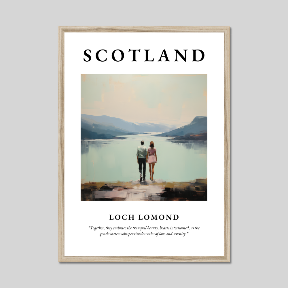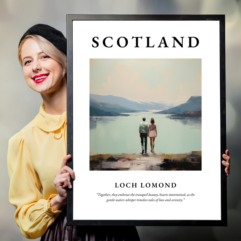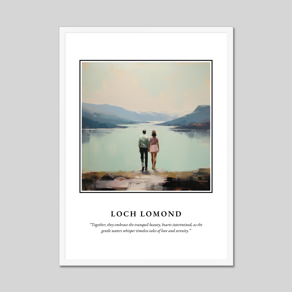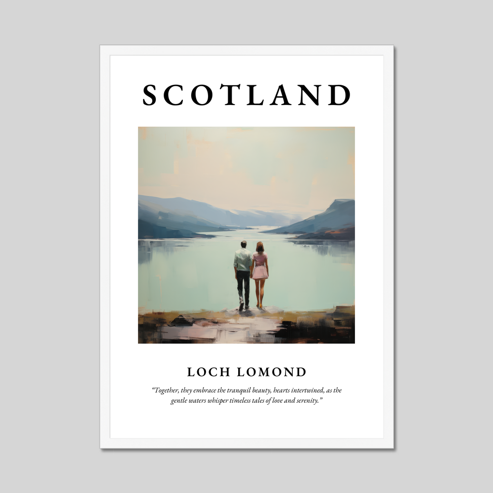 The poster's contemporary painting of Loch Lomond is a true masterpiece, capturing a serene moment where two figures stand hand in hand by the water's edge, immersed in the gentle whispers of nature. The blend of soft hues and bold brush strokes brings the scene to life, evoking feelings of tranquility and connection. Above, the bold lettering of "SCOTLAND" commands attention, while below, the poignant quote, “Together, they embrace the tranquil beauty, hearts intertwined, as the gentle waters whisper timeless tales of love and serenity,” further immerses you in the romance and mystique of this spectacular location.