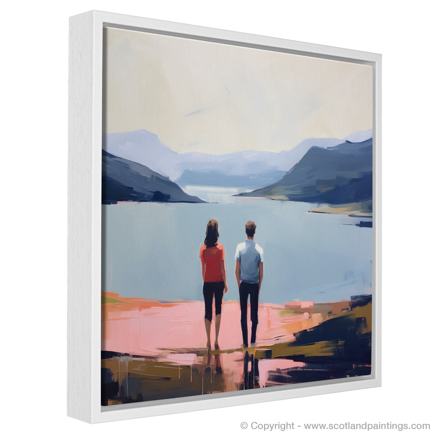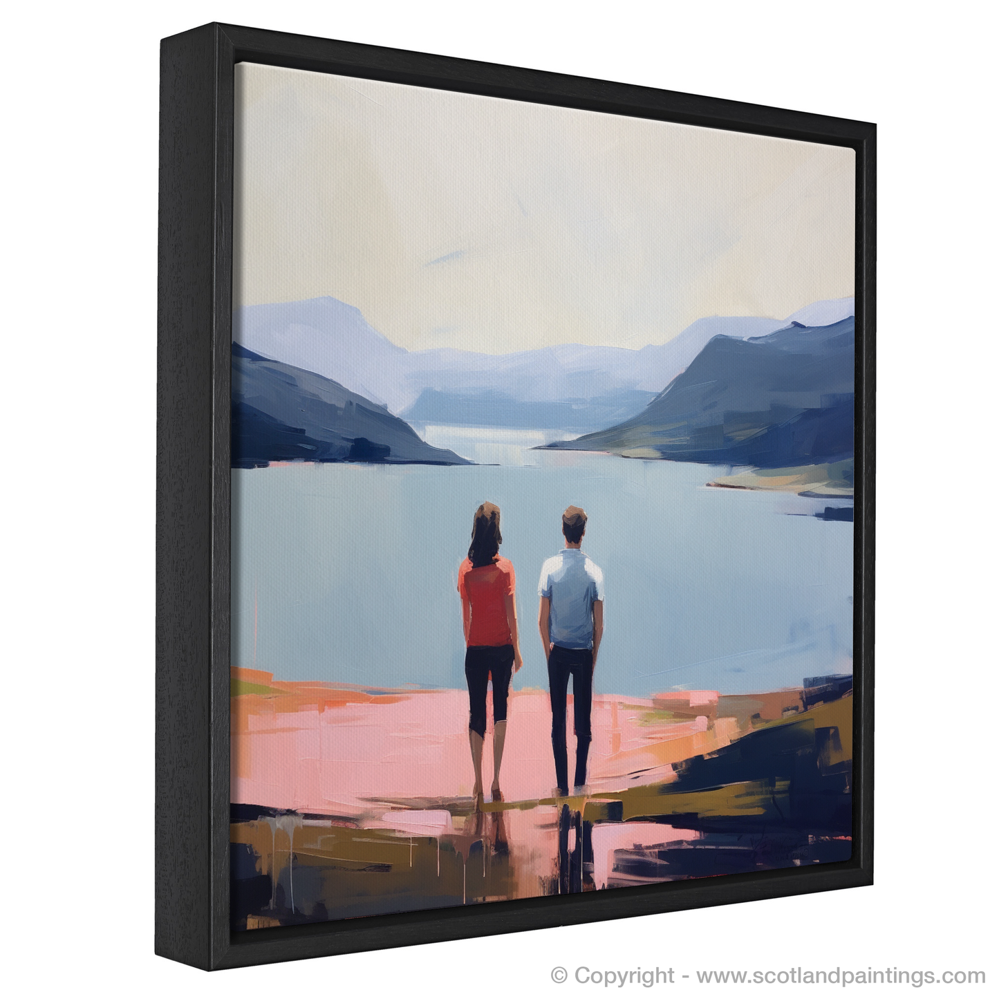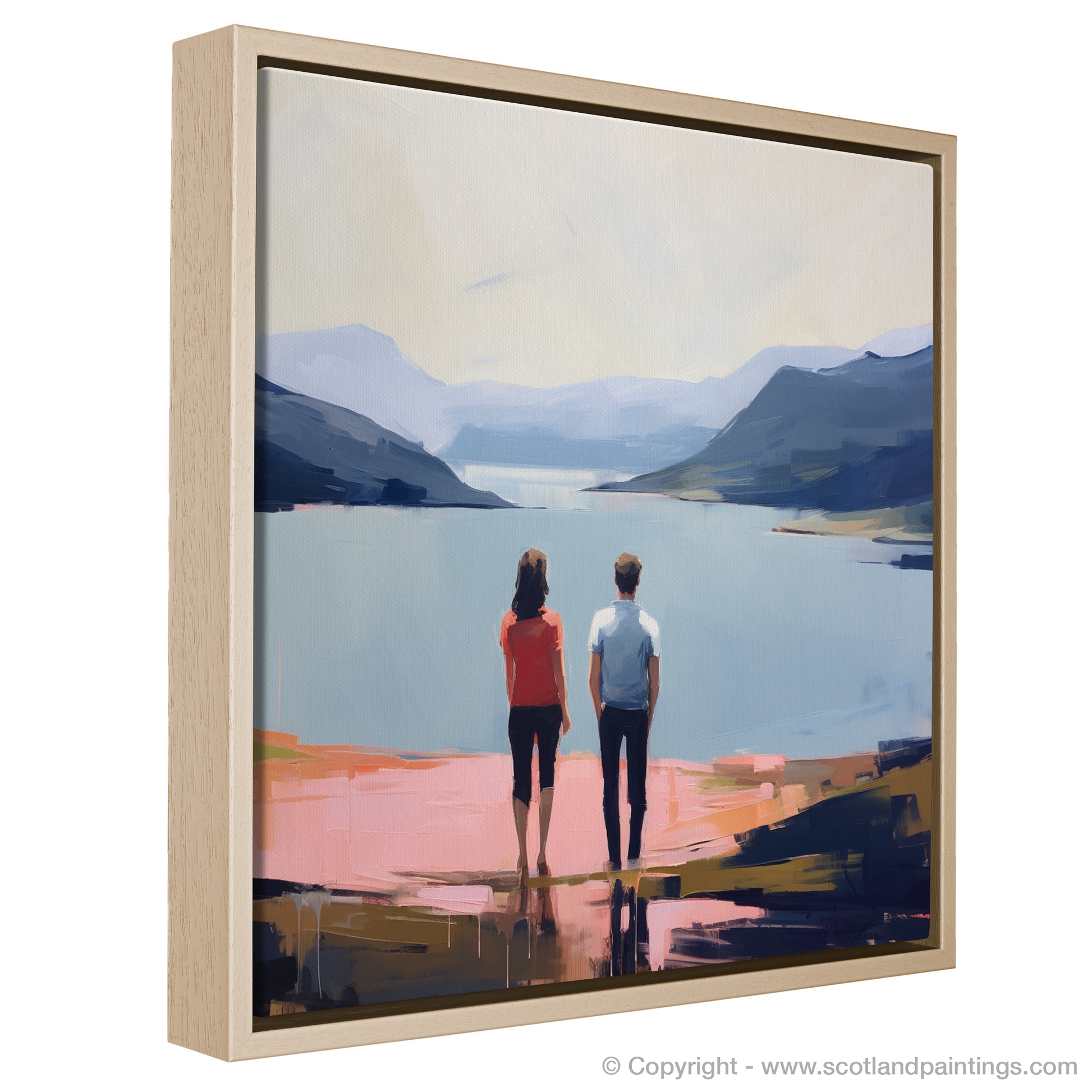 Captured in a striking contemporary style, this enchanting print features a couple in a serene embrace of togetherness, their hands gently interlocked as they gaze out towards the tranquil expanse of Loch Lomond. The stillness of the moment is palpable, underscored by the harmonious blend of natural hues and soft, precise brushstrokes that bring the Scottish landscape to life.
