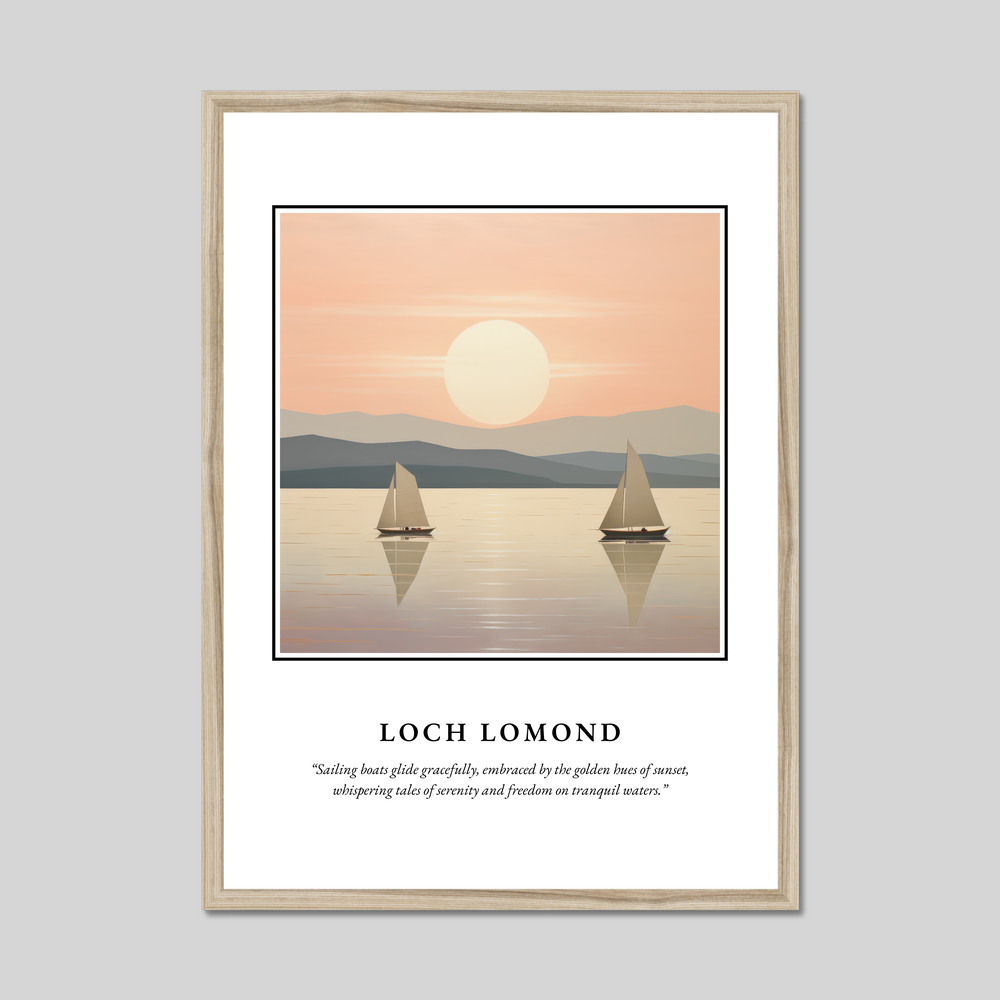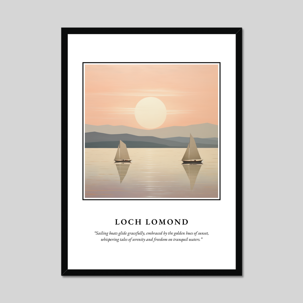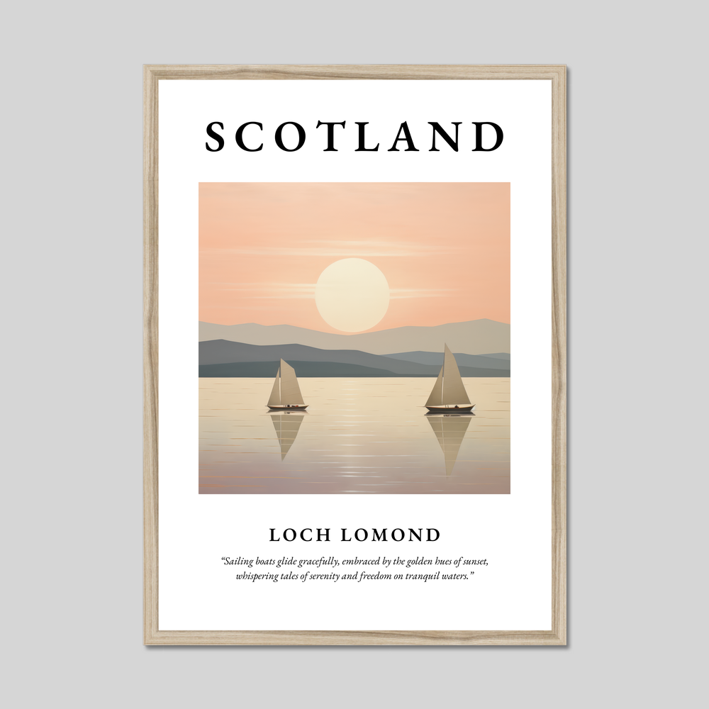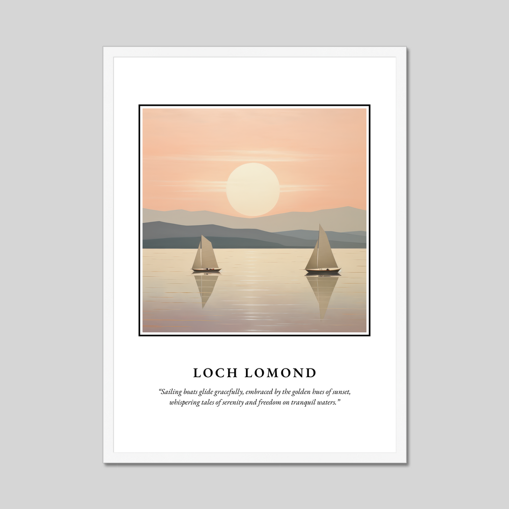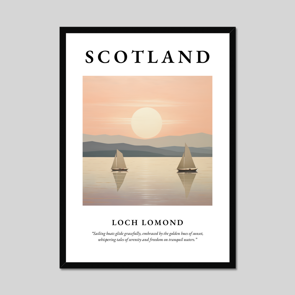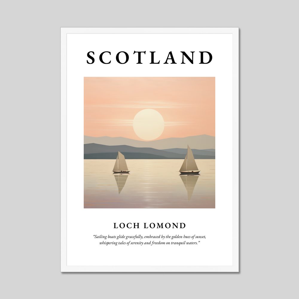 At the heart of the poster is a serene minimalistic painting of Loch Lomond, inviting you into a world where nature and tranquillity blend effortlessly. The bold lettering of "SCOTLAND" at the top commands attention, setting the stage for the stunning visual narrative beneath. The elegant depiction of sailing boats, gently gliding on the loch's mirror-like surface, embraces the warmth of the golden sunset. The accompanying quote, “Sailing boats glide gracefully, embraced by the golden hues of sunset, whispering tales of serenity and freedom on tranquil waters,” captures the essence of peaceful reflection and the promise of adventure.