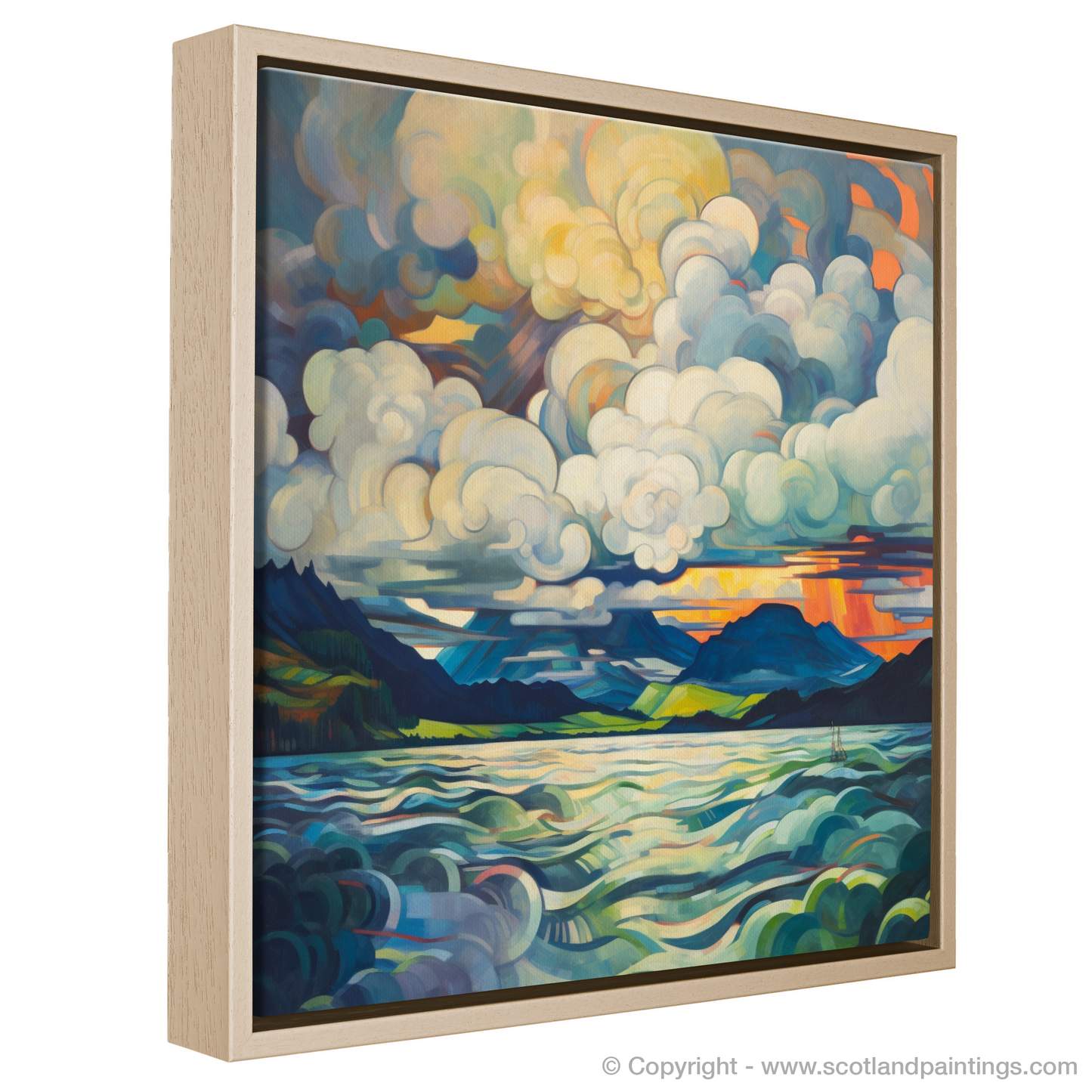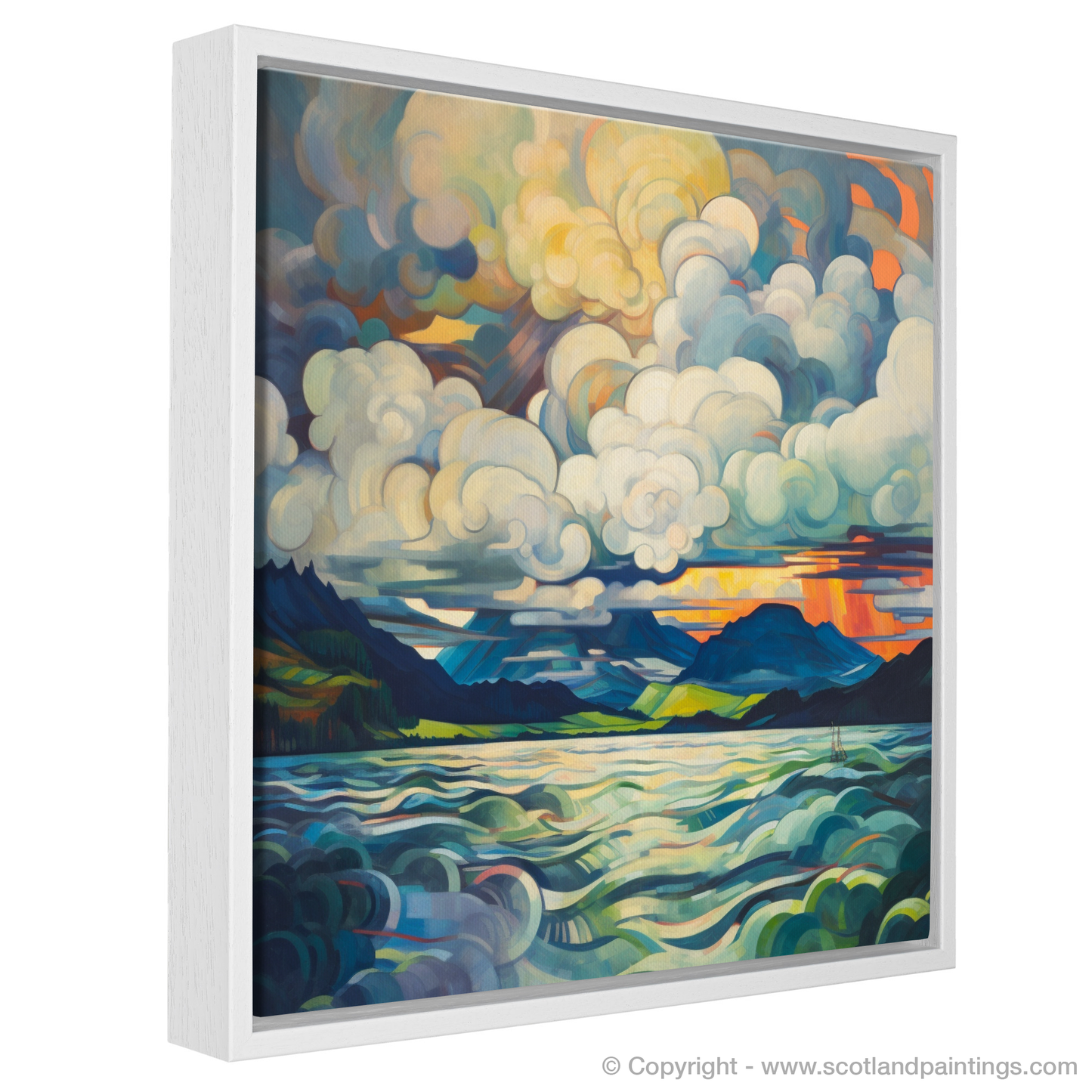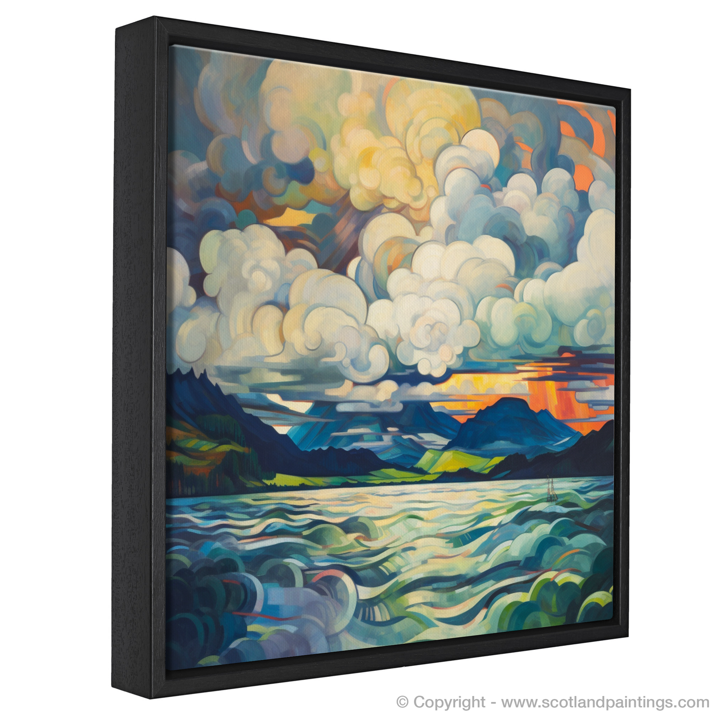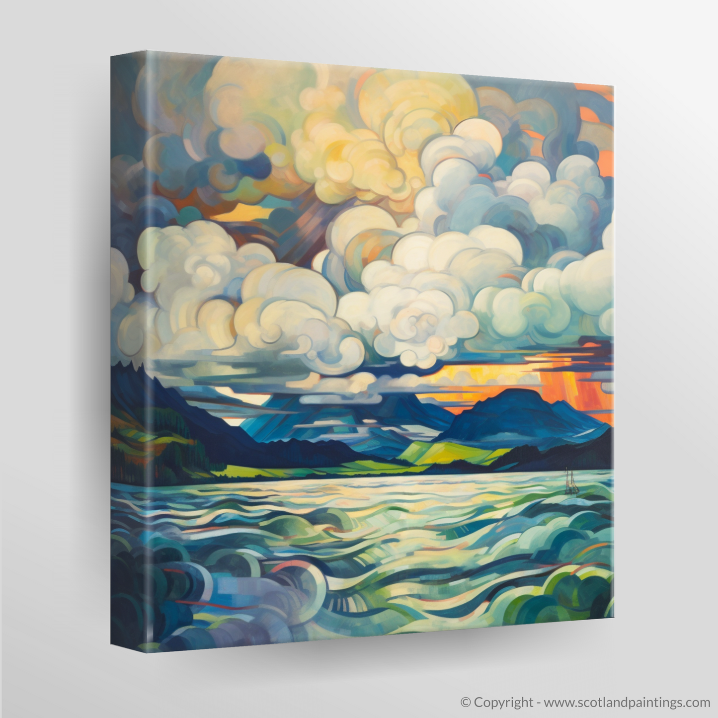 The dynamic composition boasts a palette of contrasting colours, from the cool blues and greens that evoke the loch's liquid expanse, to the warm oranges and reds reflecting the sun's last light as it sets behind the distant, silhouetted mountains. The clouds are rendered with a sense of depth and movement, their voluptuous forms appearing almost tactile, as if one could reach out and feel their billowing softness.