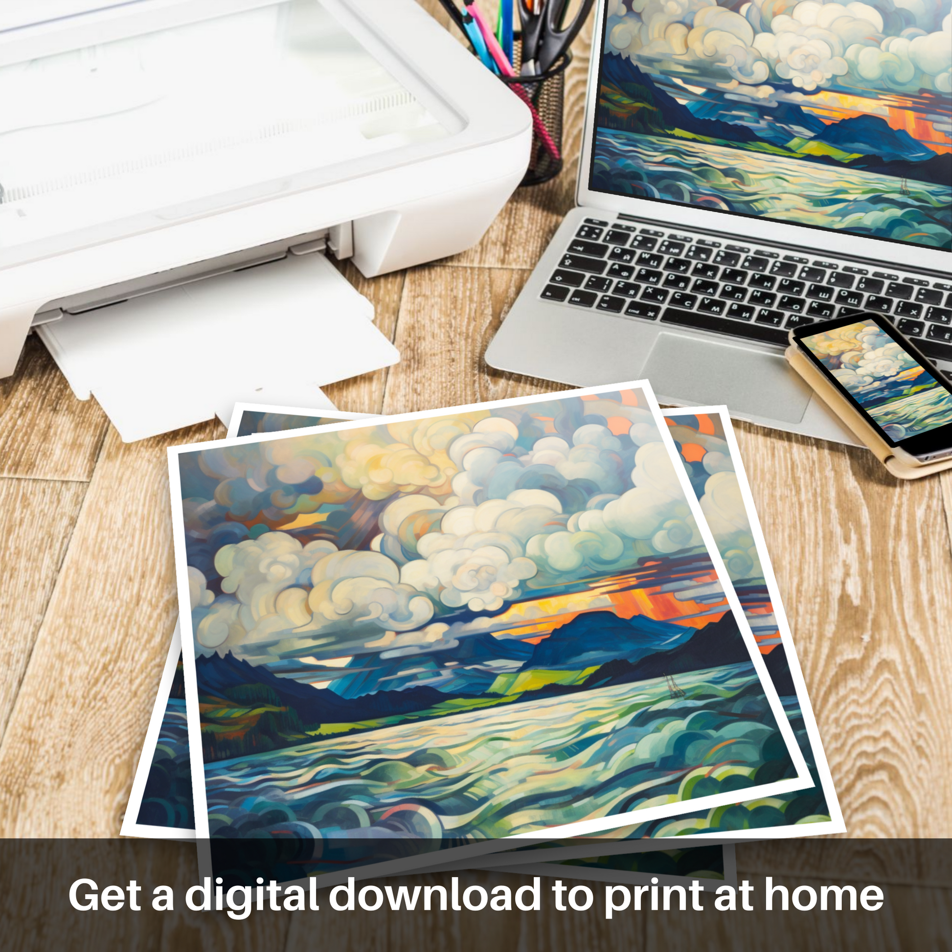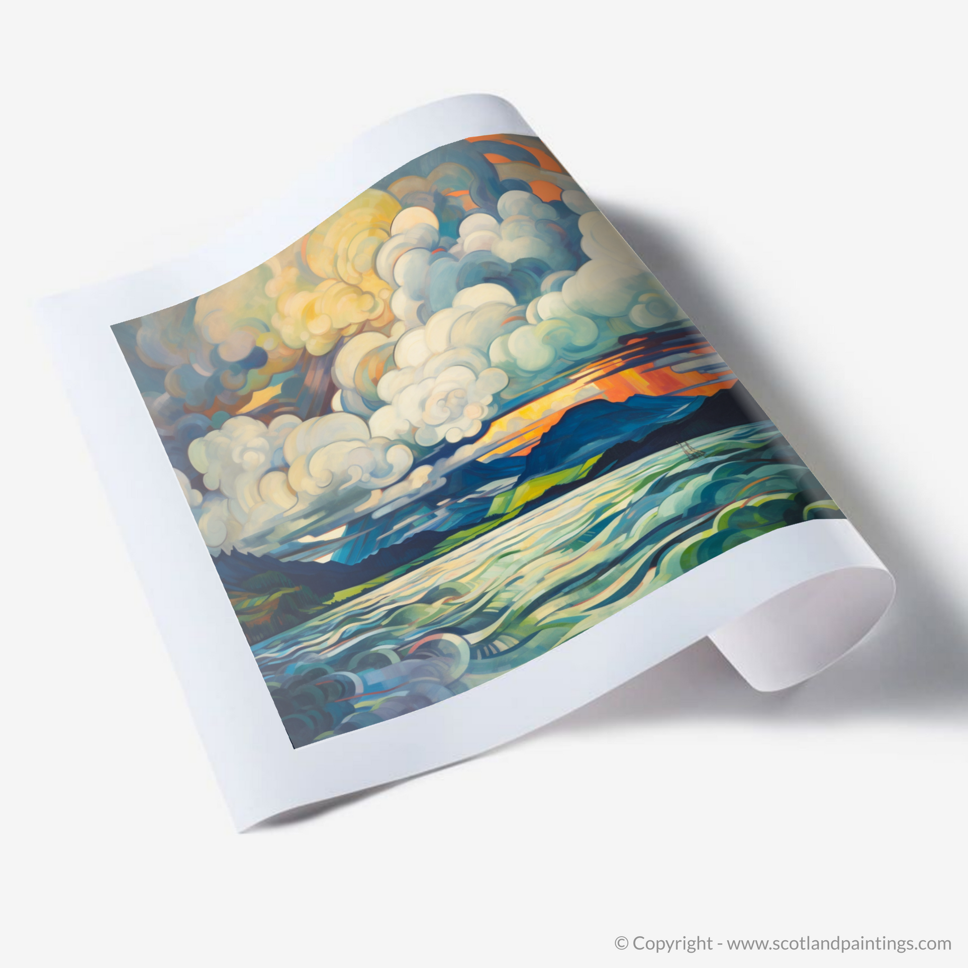 Capturing the essence of Scotland's rugged natural beauty, this striking print presents a stylised interpretation of storm clouds gathering over the serene Loch Lomond. Swirling patterns and bold, abstract shapes come together to depict the churning waters below and the tumultuous sky above.