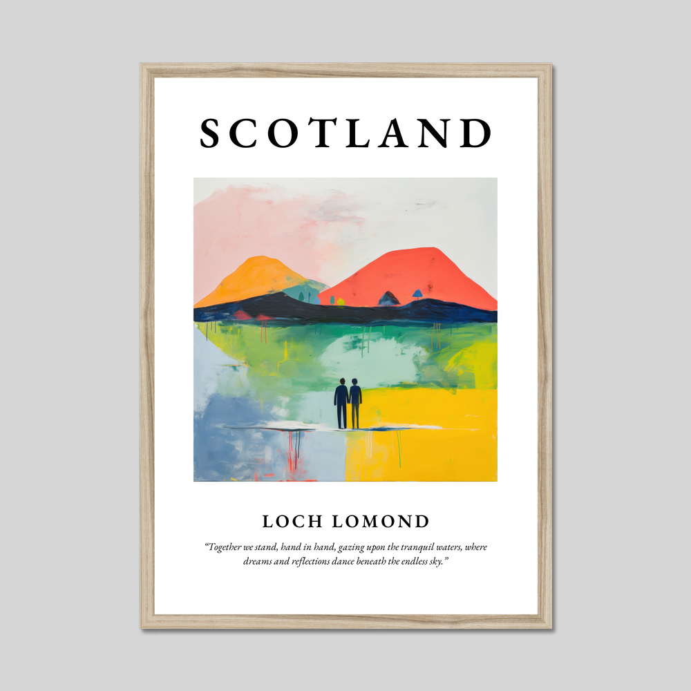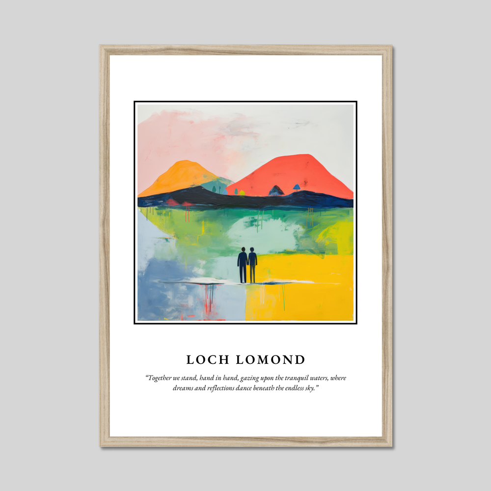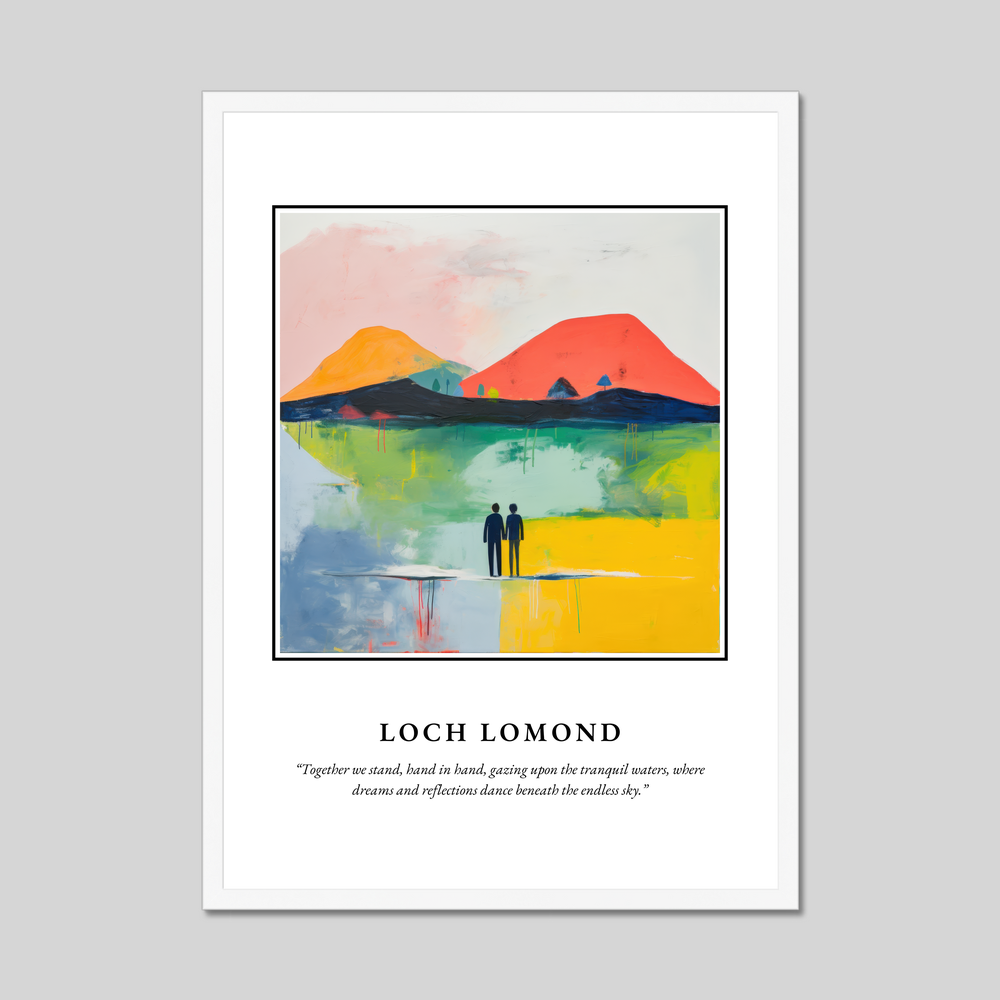 In the heart of the poster lies a vibrant abstract painting of Loch Lomond. Colours swirl and shift in a dance of artistic interpretation, evoking the ever-changing moods of the Scottish landscape. The gentle silhouettes of two figures stand hand in hand, a testament to companionship as they admire the expansive view—a masterful representation that resonates with anyone who cherishes the enduring beauty of nature or has personal ties to this iconic locale.