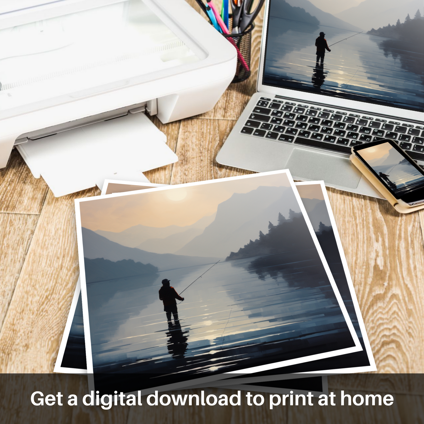 Capturing the serene beauty of Loch Lomond, this evocative print showcases the tranquil majesty of nature intertwined with human quietude. A lone fisherman stands in stark silhouette against the glassy waters, his form reflected with a painterly gentleness that ripples beneath him. The composition bathes in the warm glow of a setting or rising sun, hovering low in the mist-softened sky, casting a tapestry of amber and gold across the scene.