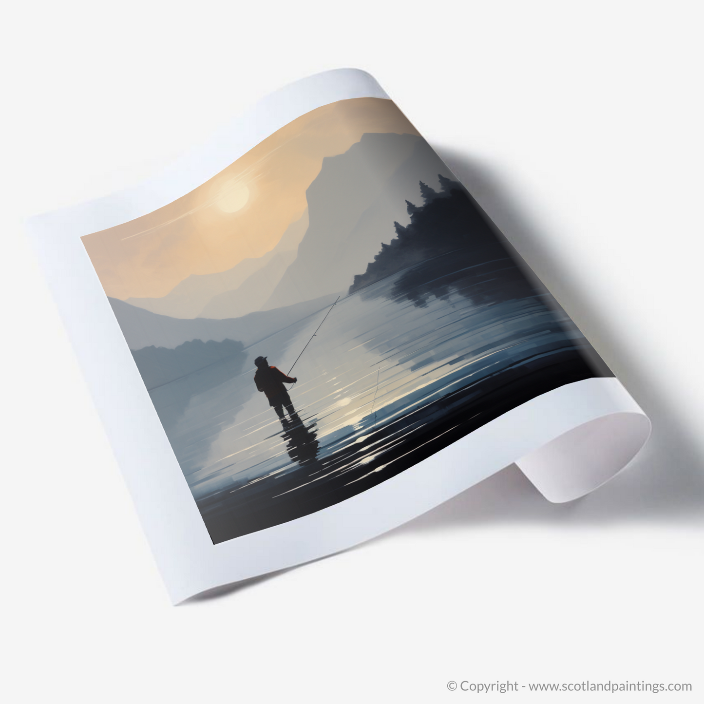 The water is a masterpiece in itself, with its mirror-like quality achieved through a symphony of smooth brush strokes, reflecting both the fisherman and the subtle gradations of light that dance upon its surface. This artwork does not merely depict a moment on Loch Lomond; it invites the viewer to feel the stillness, to hear the soft lapping of water against the shore, and to become lost in a moment of profound peace. A testament to the timeless allure of Scotland’s landscapes, this print is an homage to the subtleties of light, the elegance of nature's silhouettes, and the soulful connection between man and the environment.
