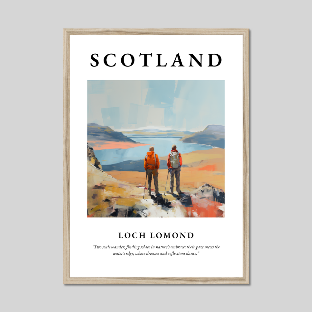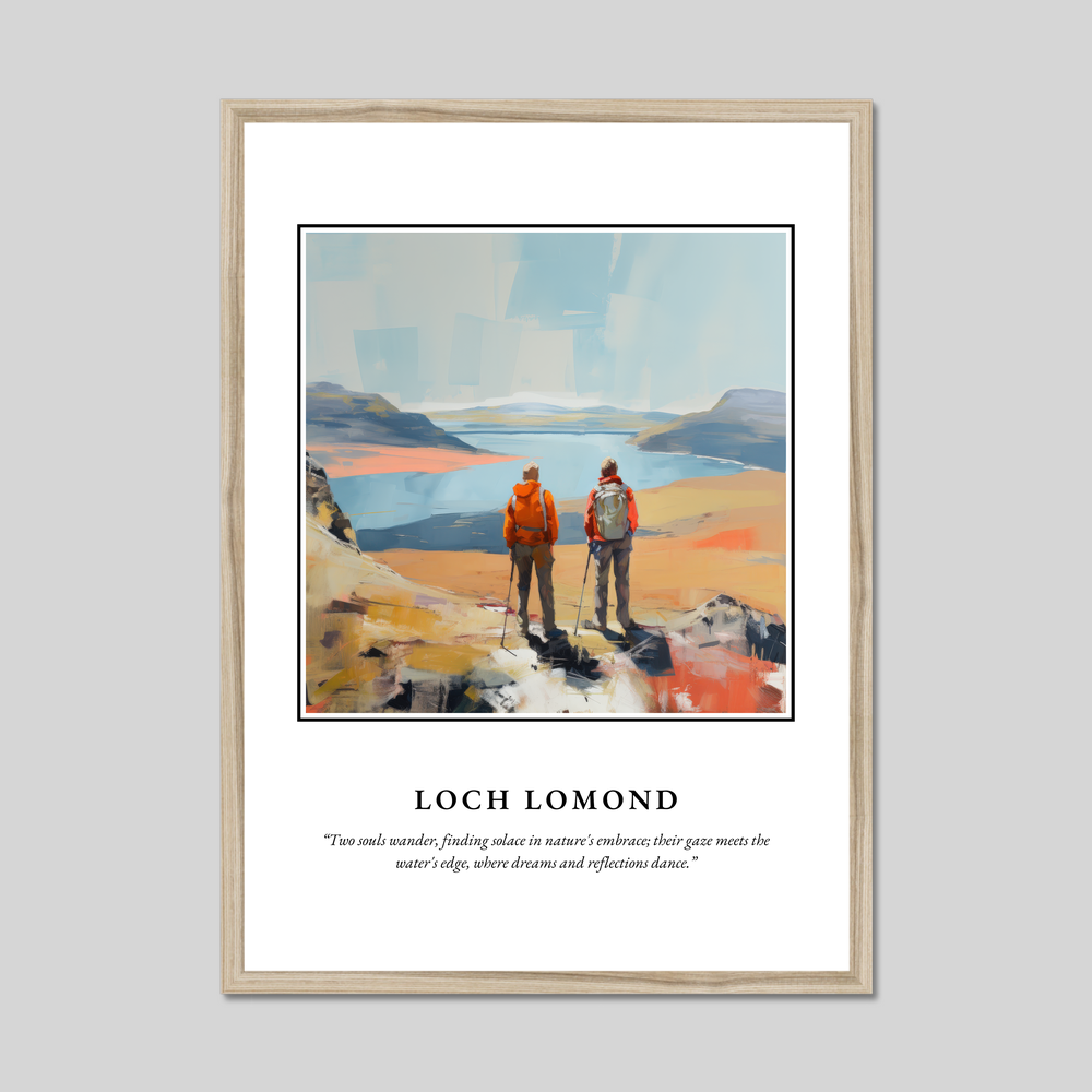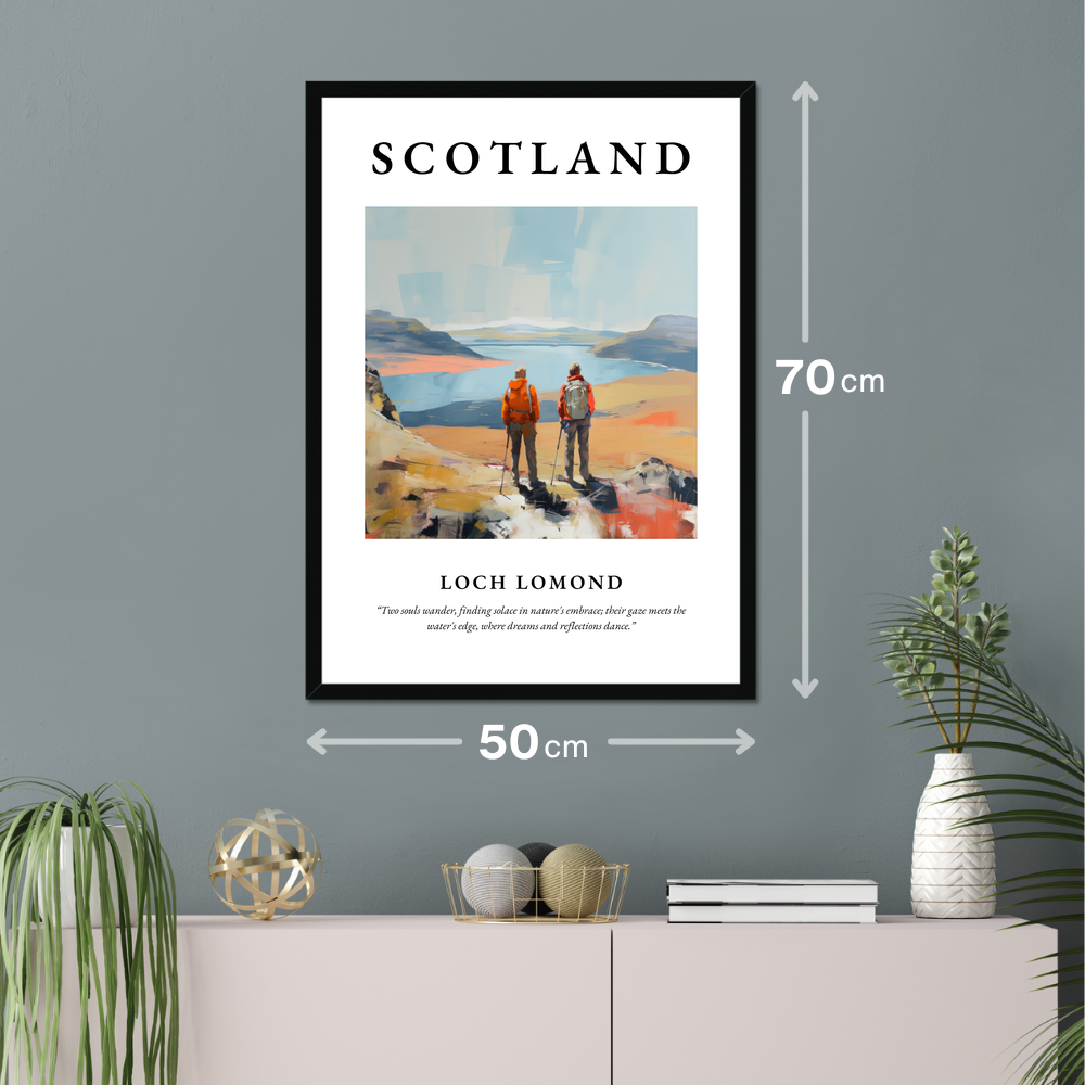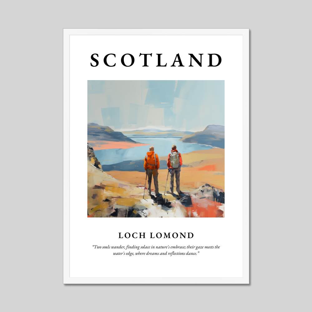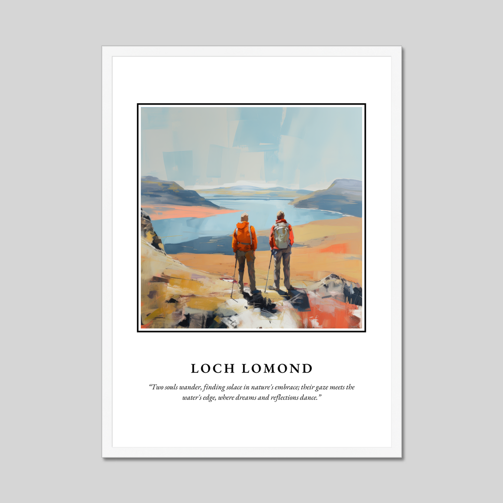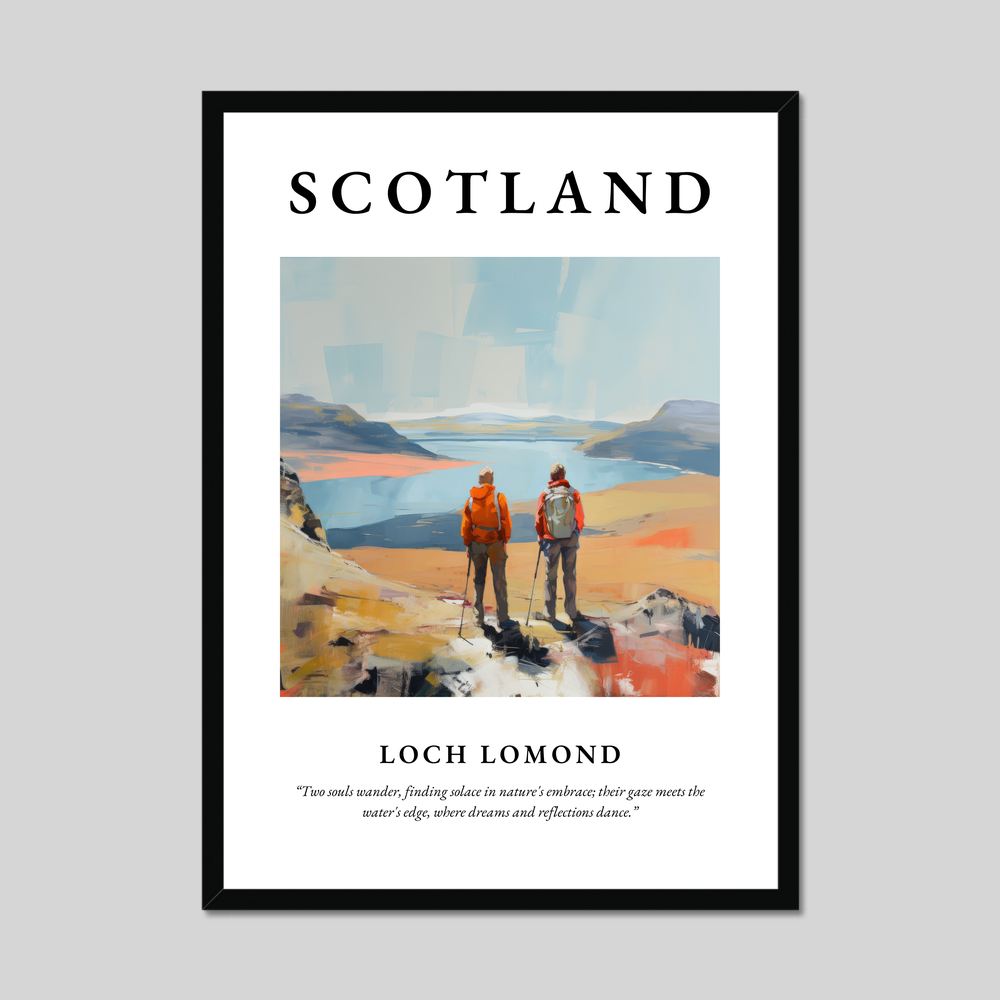 Capture the essence of Scotland's natural beauty with our stunning framed poster print, measuring an impressive 50cm x 70cm. Perfect for those who have visited or dream of visiting Loch Lomond, or for anyone who simply appreciates the tranquillity of contemporary art. This piece showcases the breathtaking expanse of Loch Lomond, paired with the evocative quote: “Two souls wander, finding solace in nature's embrace; their gaze meets the water's edge, where dreams and reflections dance.” The harmonious blend of modern brushstrokes with a classic landscape will captivate art lovers and collectors alike.