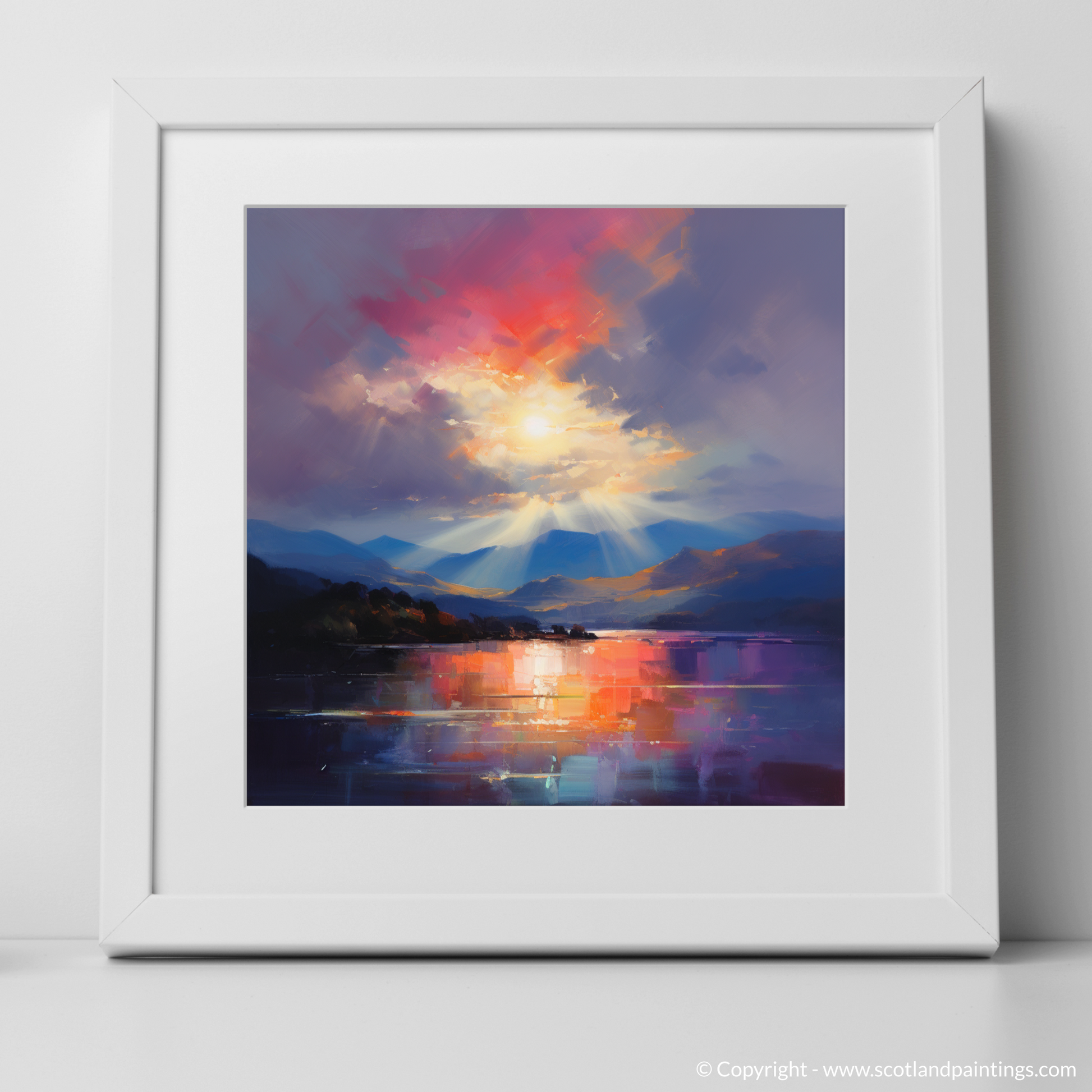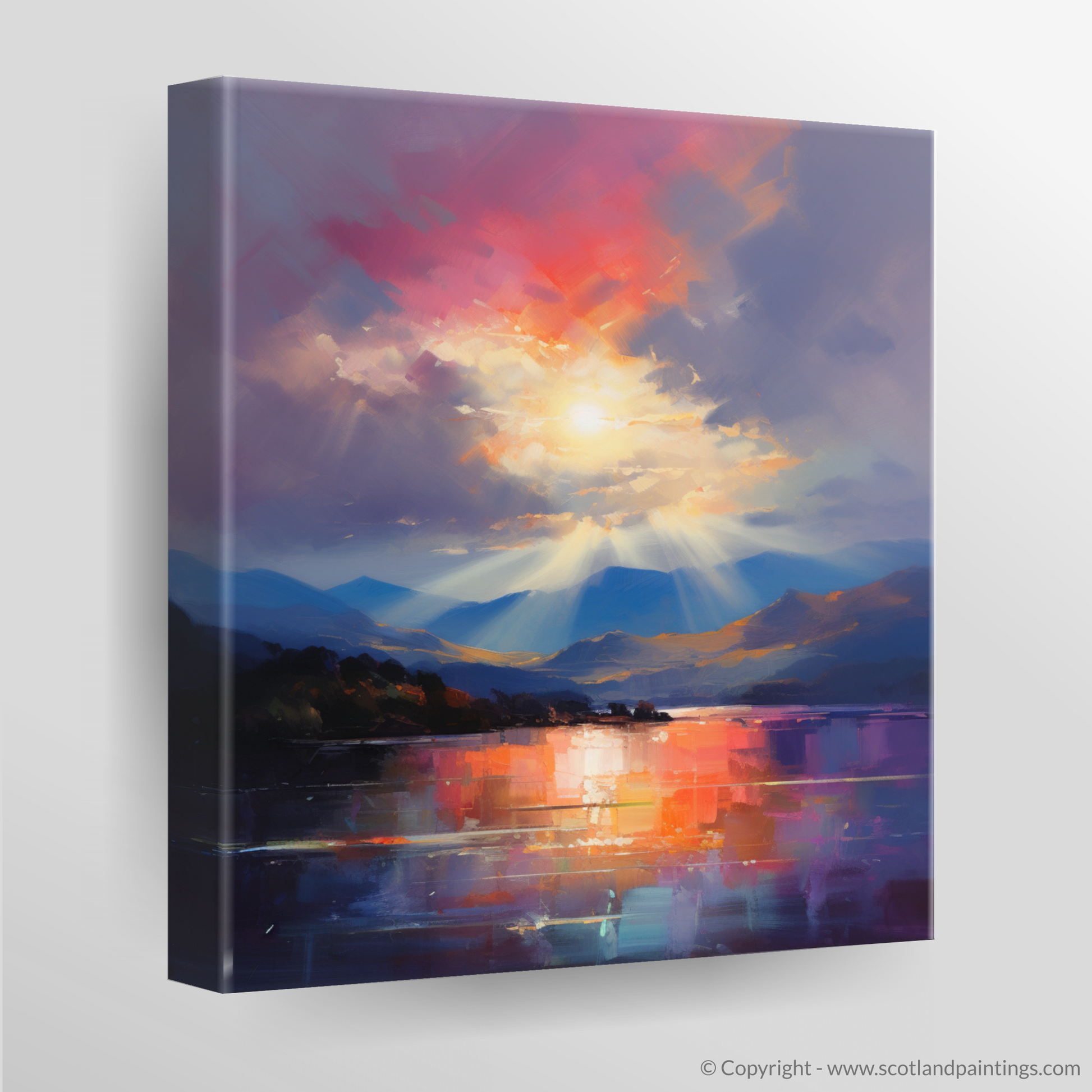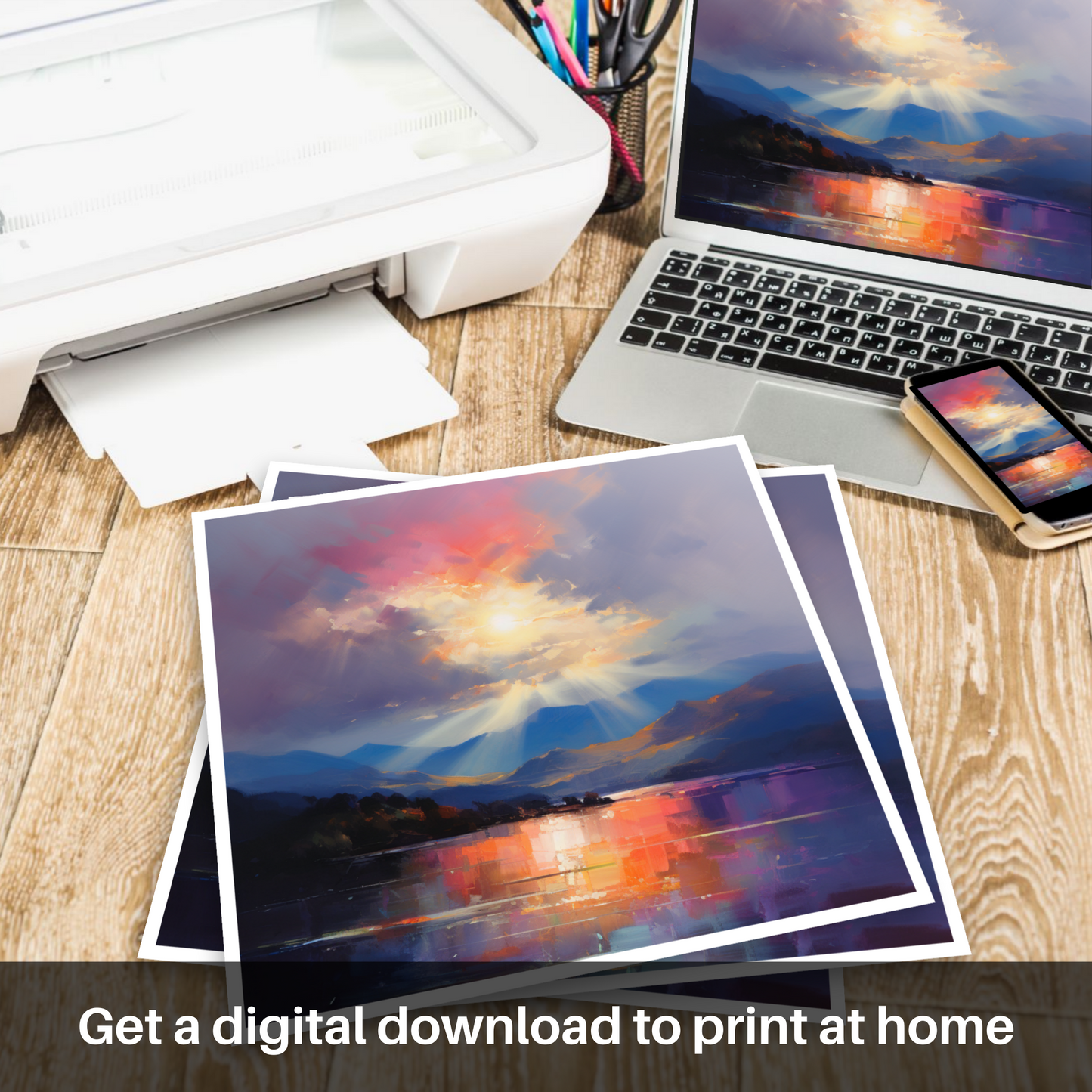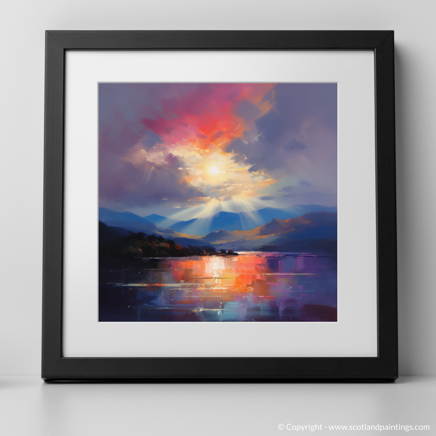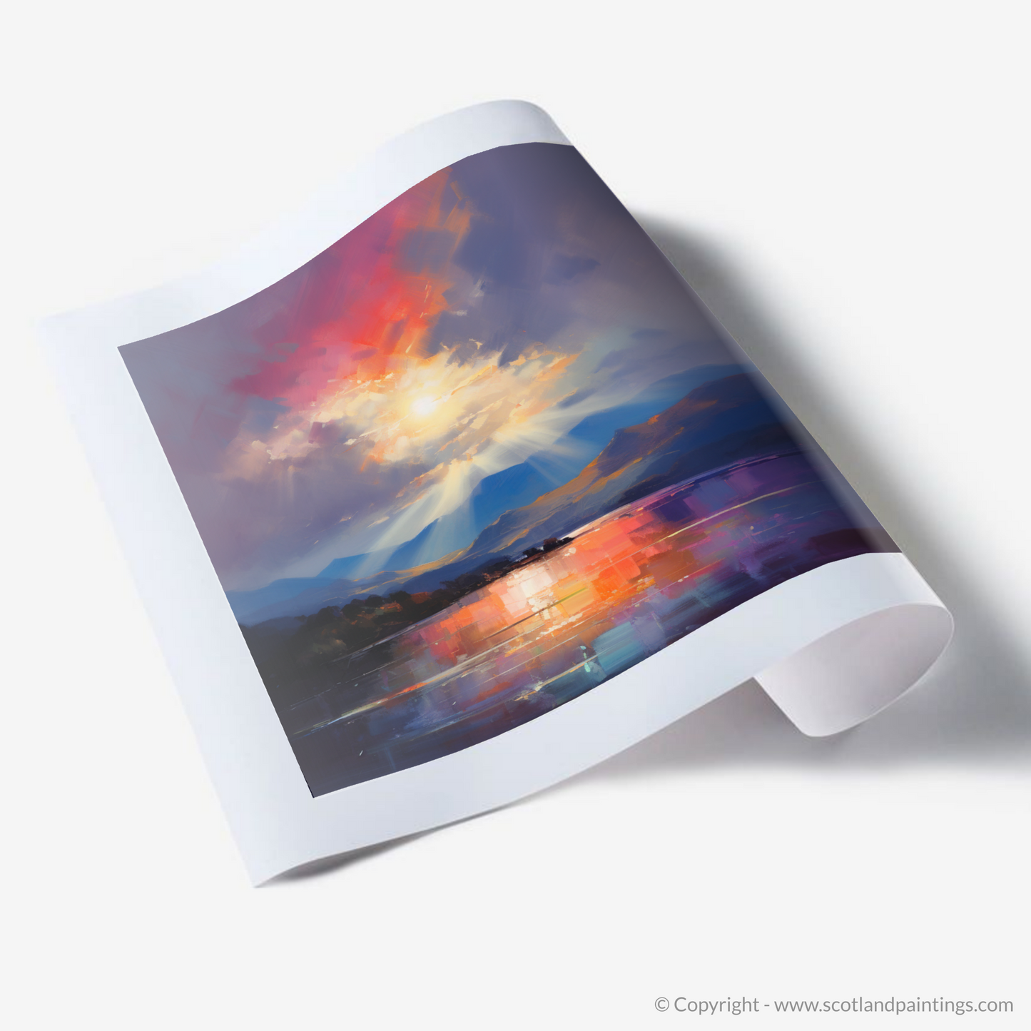 Capture the essence of Scotland's natural beauty with this evocative print, a vibrant homage to Loch Lomond bathed in the ethereal light of Crepuscular rays. The vivacious brushstrokes and bold colour palette characteristic of Expressionism breathe life into this scene, creating a dynamic interplay between light and shadow that dances across the canvas.