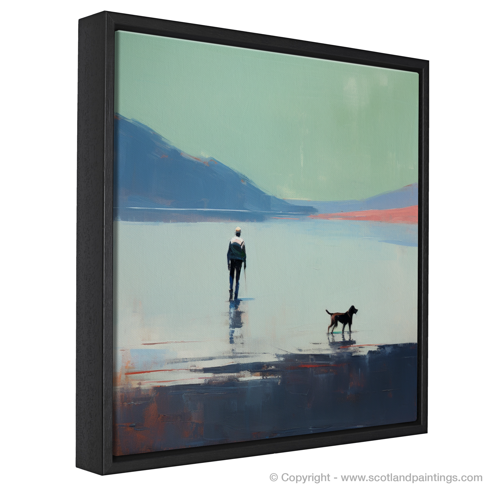 Captivate your senses with this evocative print, a tranquil scene capturing the essence of a peaceful stroll beside the iconic Loch Lomond. The main subject is a solitary figure, presumably a man, accompanied by his faithful canine companion, both rendered in deft strokes of a contemporary style that brings a sense of movement and life to the piece.