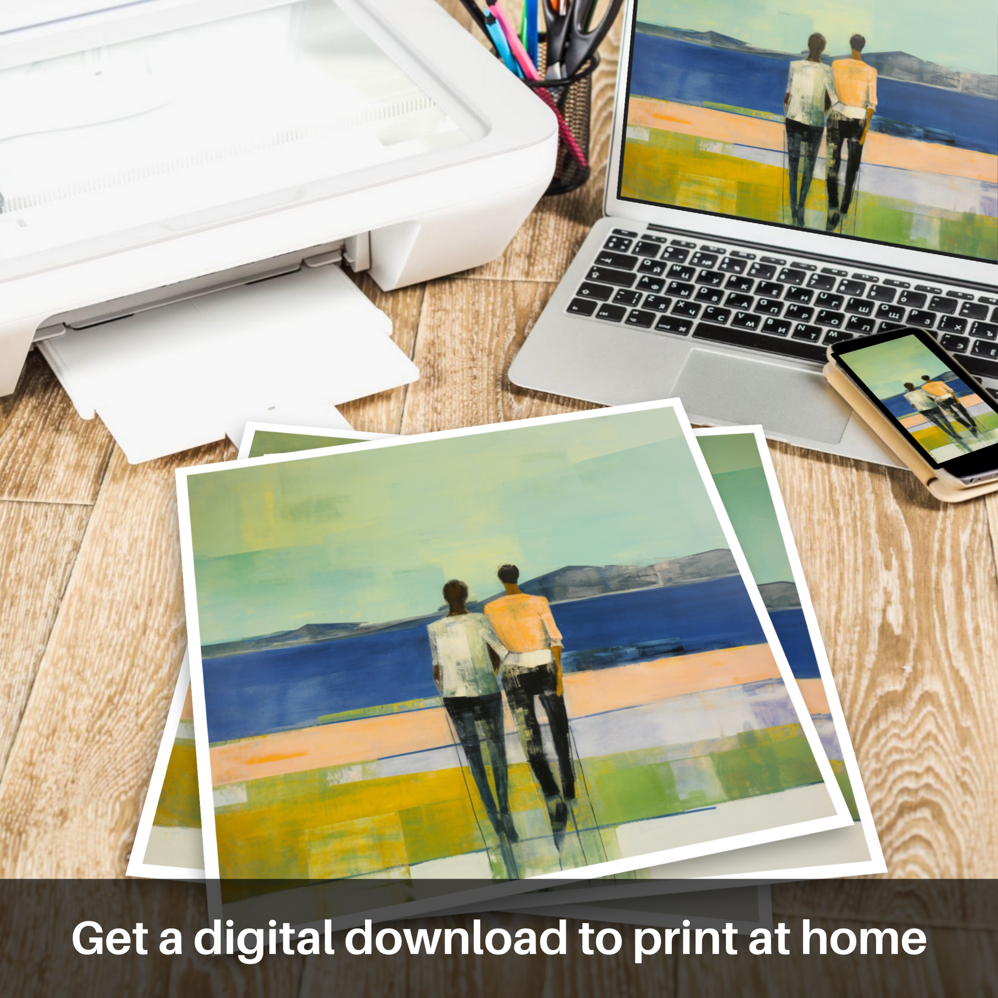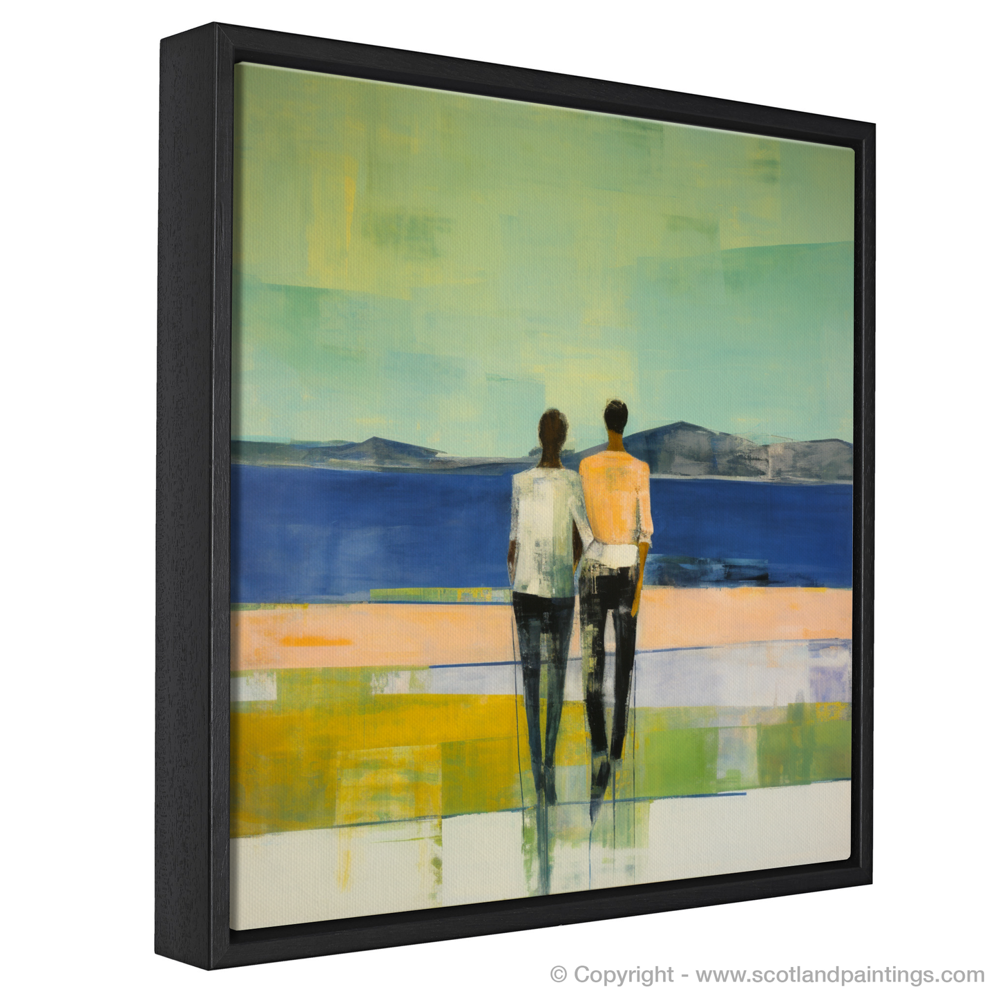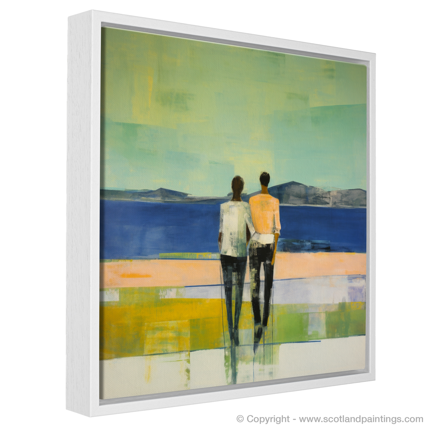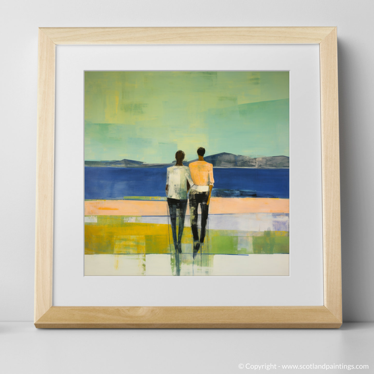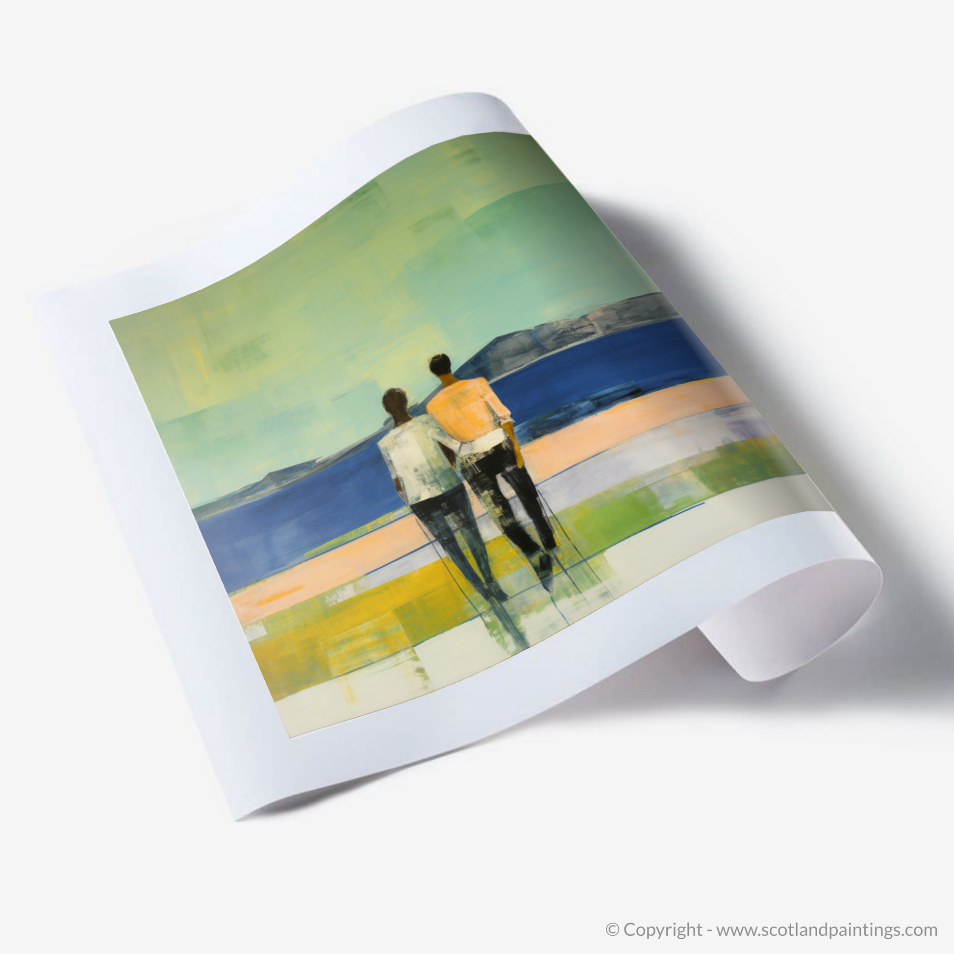 Capturing the serene essence of Loch Lomond's picturesque landscape, this evocative print presents viewers with a poignant moment shared between two figures. The couple, rendered in a harmonious amalgamation of soft edges and fluid forms, stand intimately hand-in-hand. Their backs to the observer, they gaze out towards the distant, rolling hills that rise gently from the horizon, a testament to the timelessness of Scotland's natural grandeur.