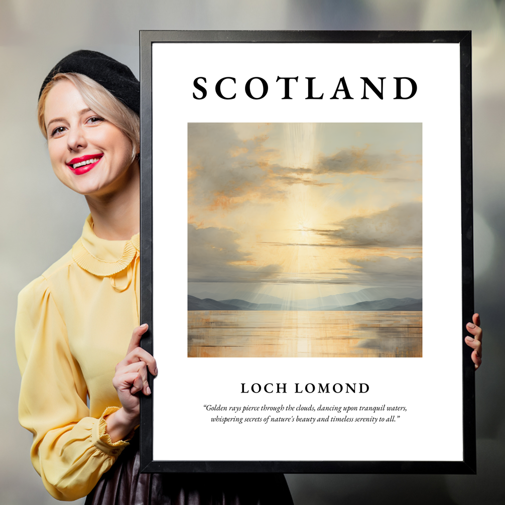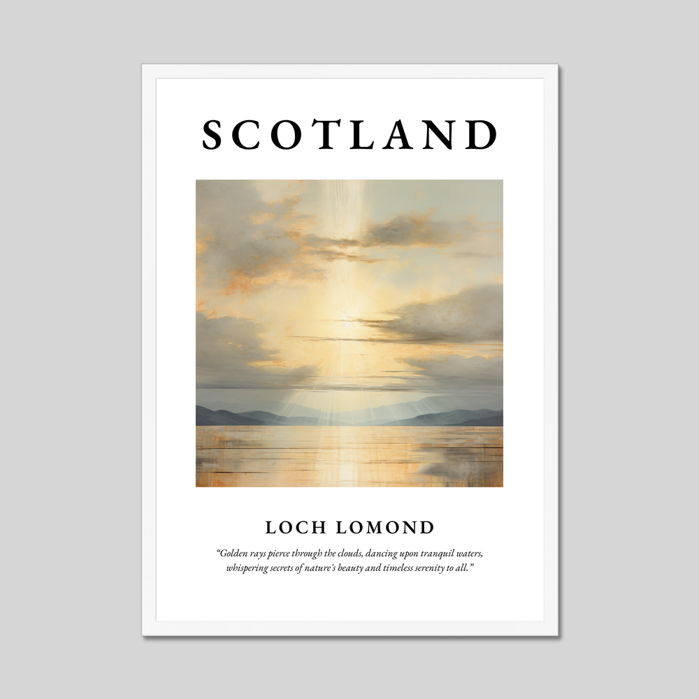At the top, “SCOTLAND” is boldly declared, setting the stage for the tranquil depiction beneath. The minimalist interpretation of Loch Lomond highlights the golden rays piercing through lush clouds, their light dancing delicately upon the tranquil waters. The scene whispers the timeless secrets of nature’s beauty, captured evocatively in the quote below: “Golden rays pierce through the clouds, dancing upon tranquil waters, whispering secrets of nature's beauty and timeless serenity to all.”