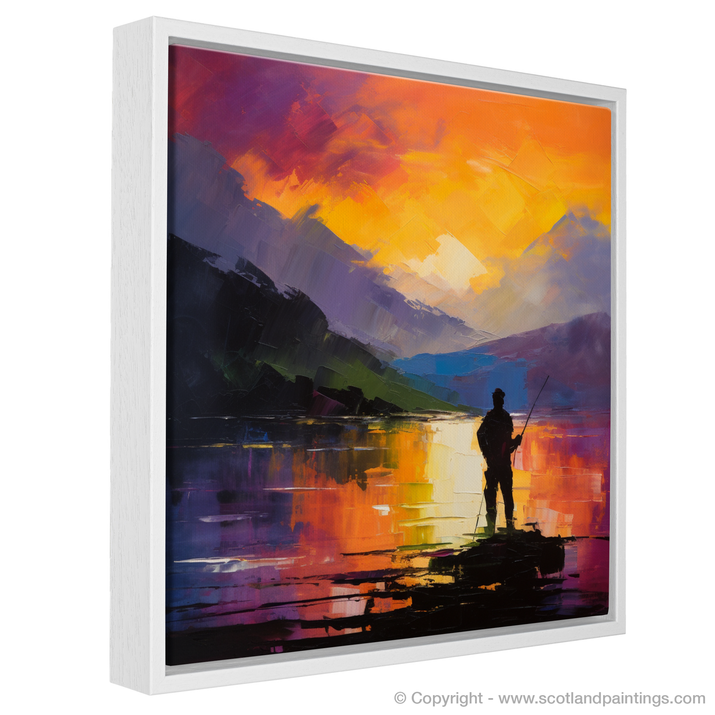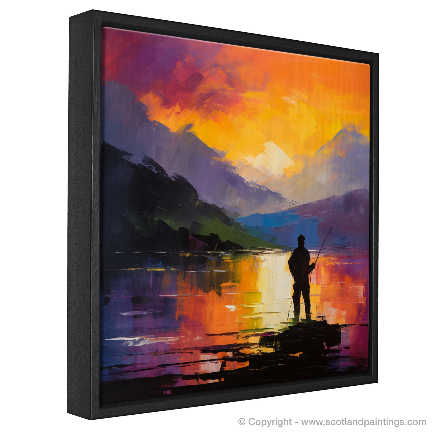 Painting and Art Print of Silhouetted fisherman on Loch Lomond. Silhouetted Fisherman at Twilight: An Abstract Expressionist Tribute to Loch Lomond.