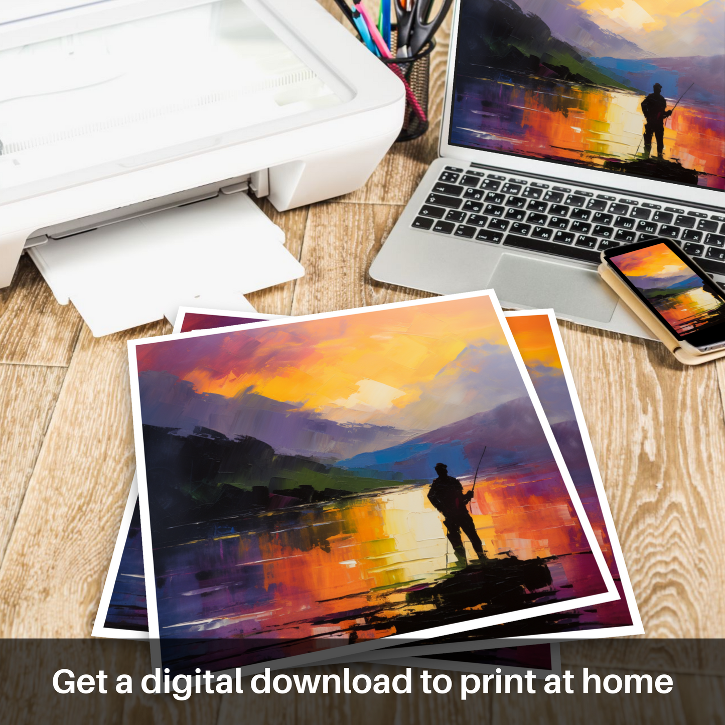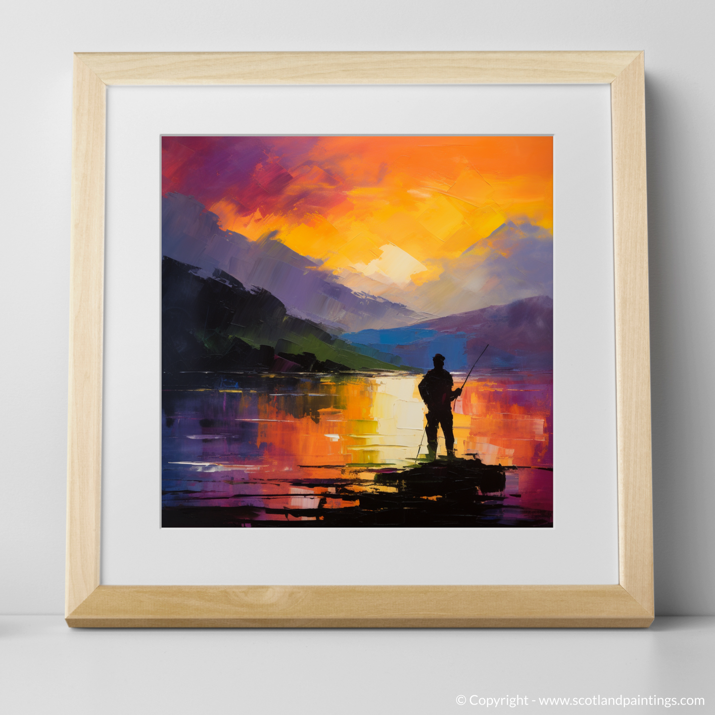 Captivate your senses with our evocative print that celebrates the serene beauty of Loch Lomond, interpreted through the passionate strokes of Abstract Expressionism. The composition is anchored by a contemplative fisherman, silhouetted against the vibrant reflections on the water's surface. Vivid hues of orange, red, and yellow dance across the sky, suggesting the splendour of a setting sun melting into the horizon. These warm colours cascade into the loch, creating a mesmerising mirror effect that blurs the boundary between sky and water.