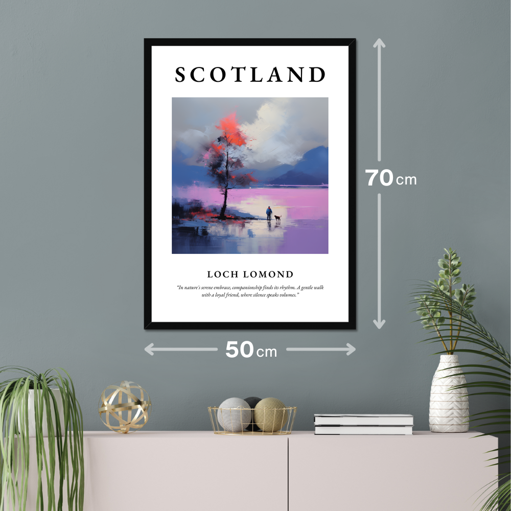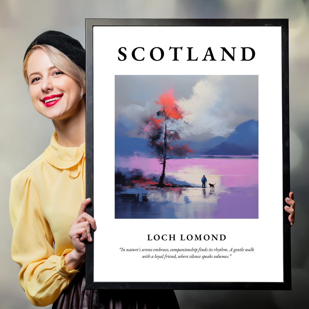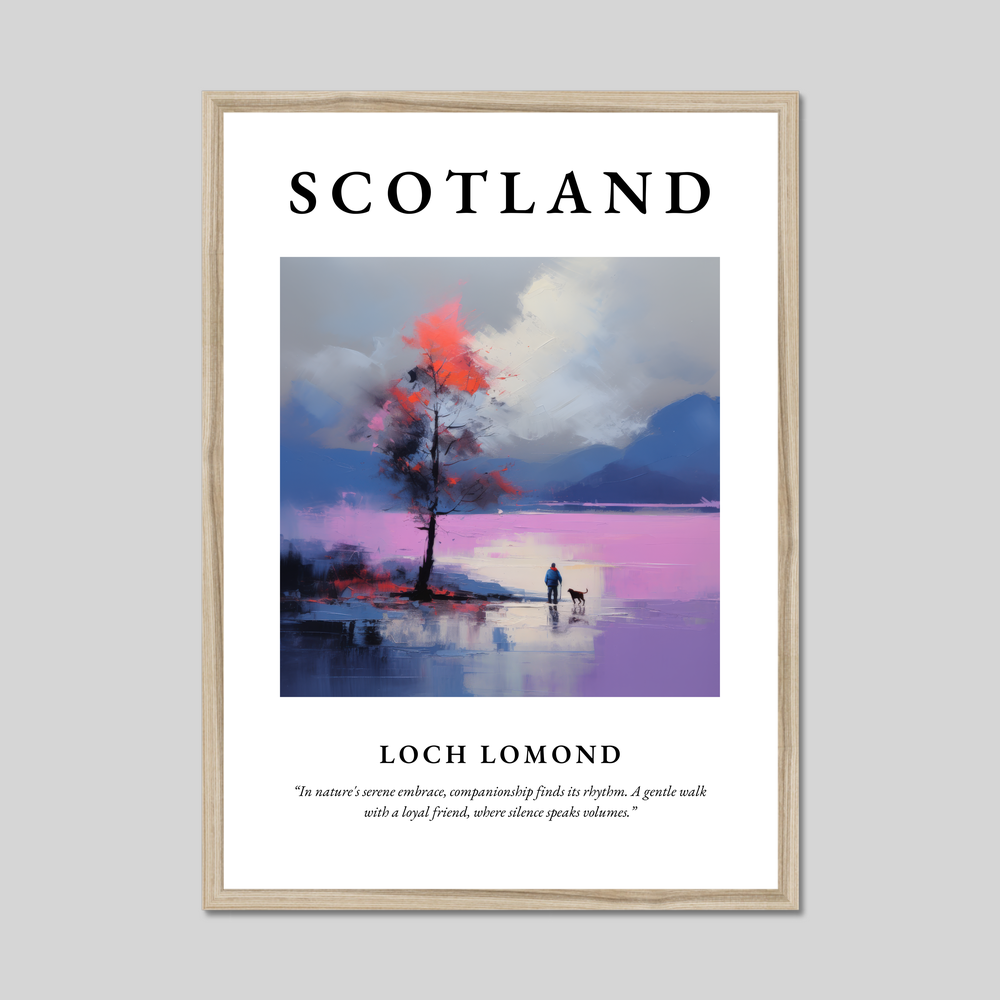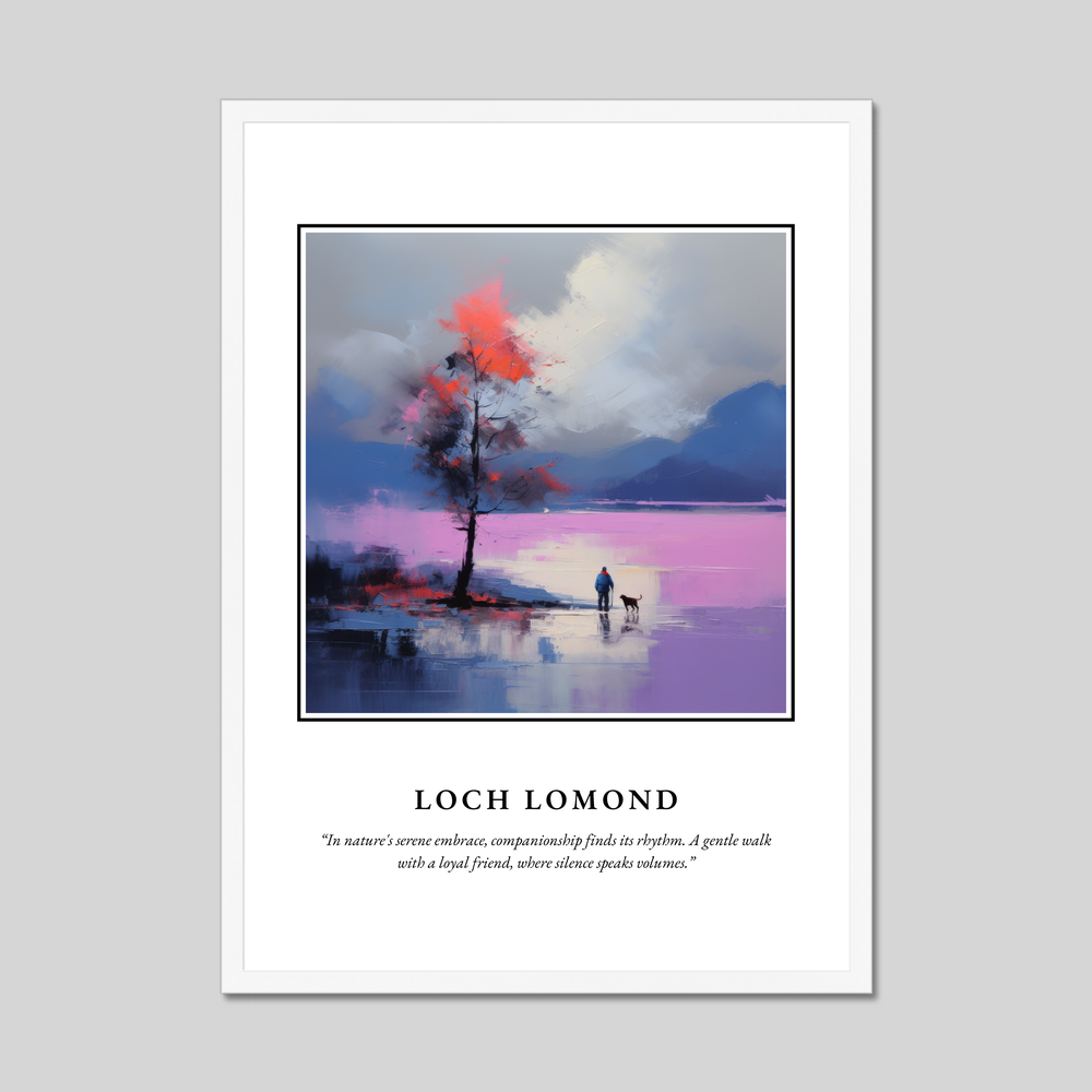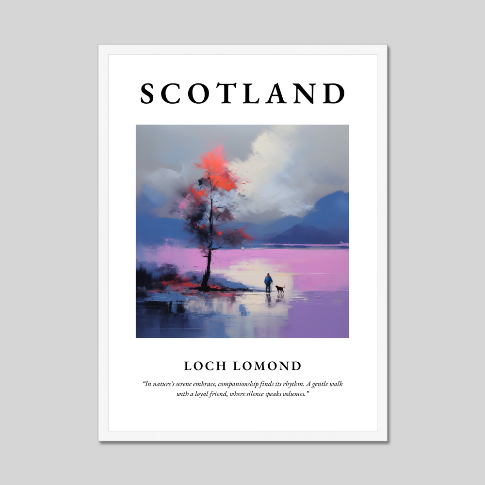 The centrepiece of the poster is a vivid Expressionist interpretation of Loch Lomond. Bold hues and dynamic brushstrokes capture the tranquil yet vibrant scene—a lone figure and their loyal companion walk in harmonious silence along the water's edge. The sky reflects an array of colours, echoing the changing moods of the lake, while a solitary tree stands as a sentinel, its leaves a fiery contrast to the cool serenity of the landscape. This artwork invites viewers to find beauty in solitude and introspection, making it an ideal piece for art lovers and those who cherish the serene Scottish lochs.