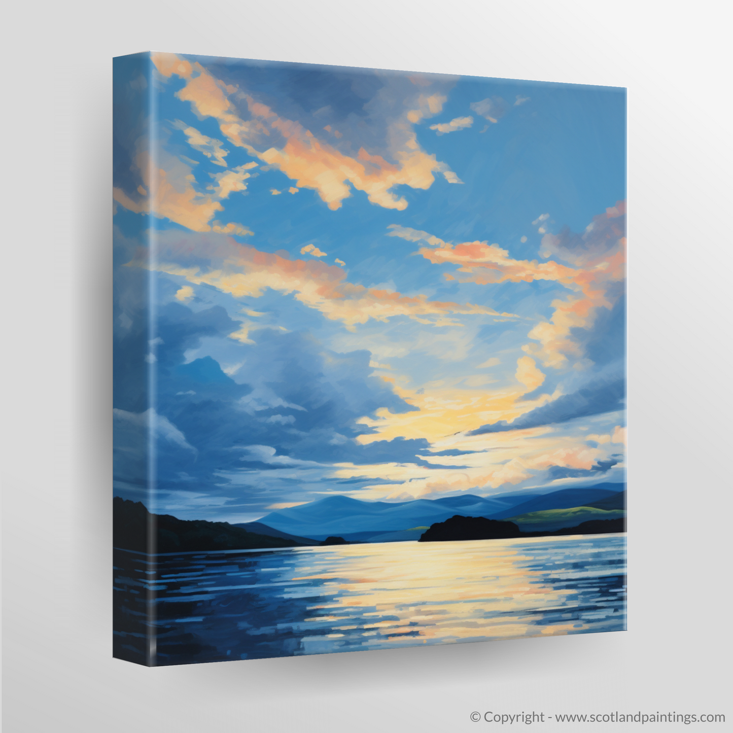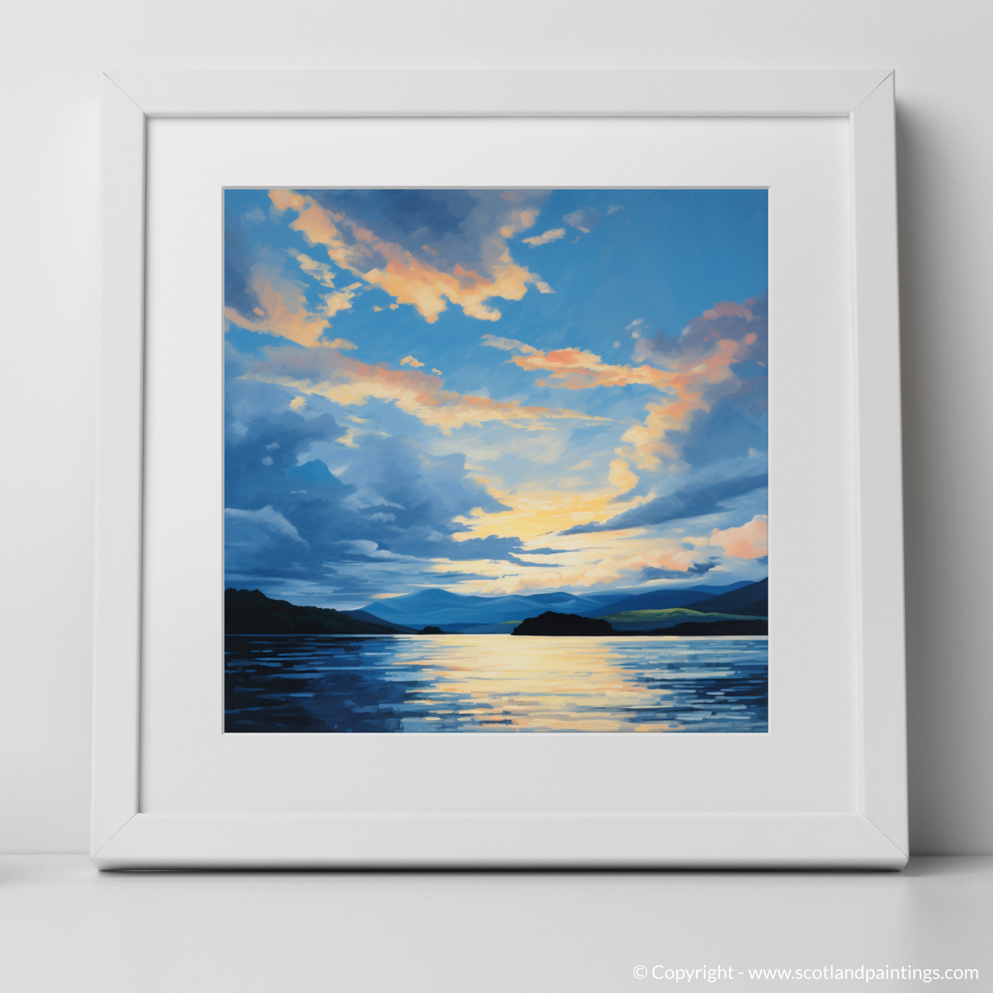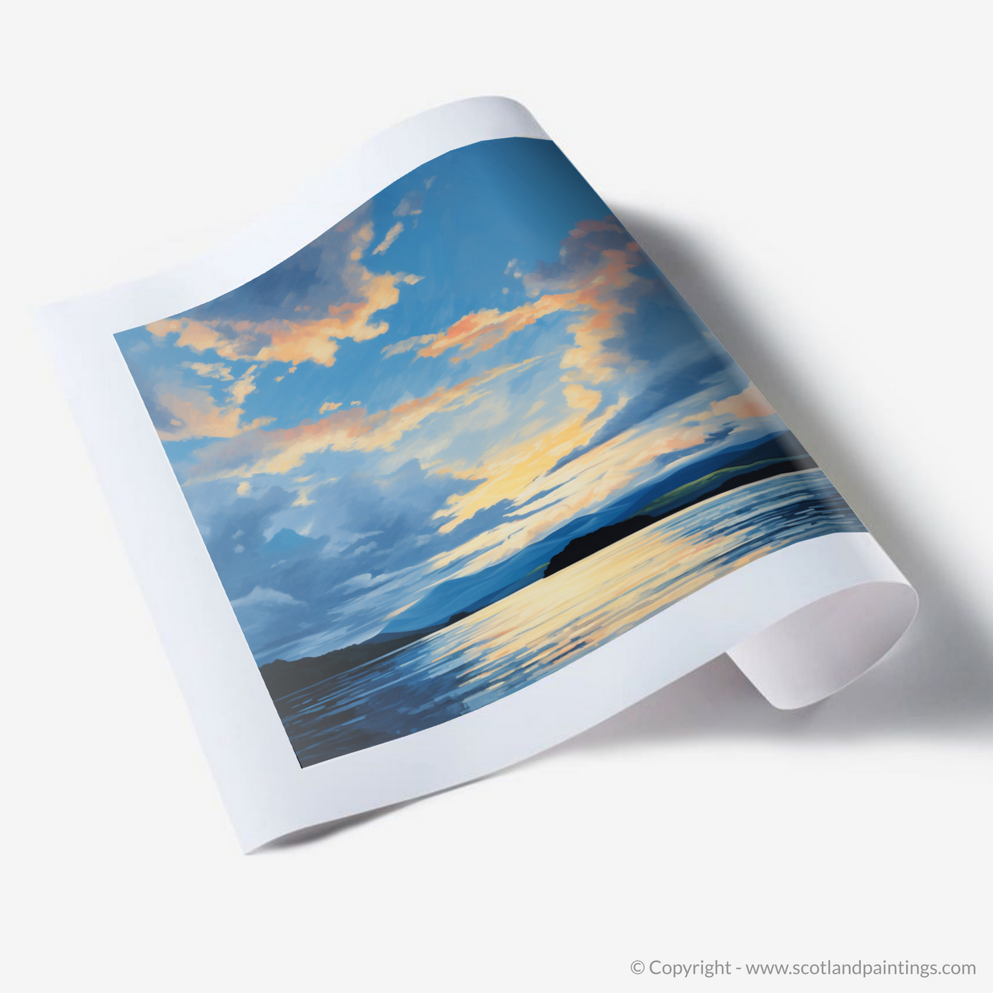 This captivating print captures the serene majesty of Loch Lomond with a strikingly vivid sky sprawling above. The tranquil waters of the loch perfectly mirror the dance of the sunset's warm hues, ranging from soft peaches to deep fiery oranges, as they contrast against the cool blues and purples of the evening sky. The clouds are rendered with an exceptional attention to detail, their soft edges and voluminous shapes lending depth and dimension to the vast sky.