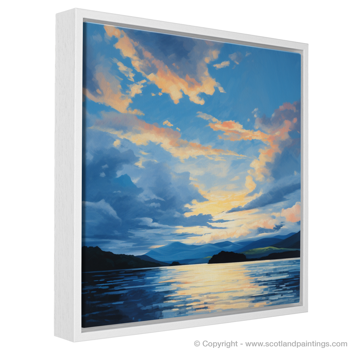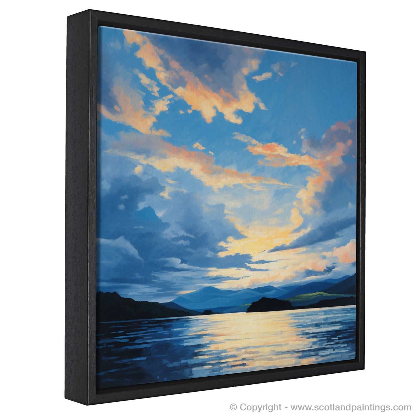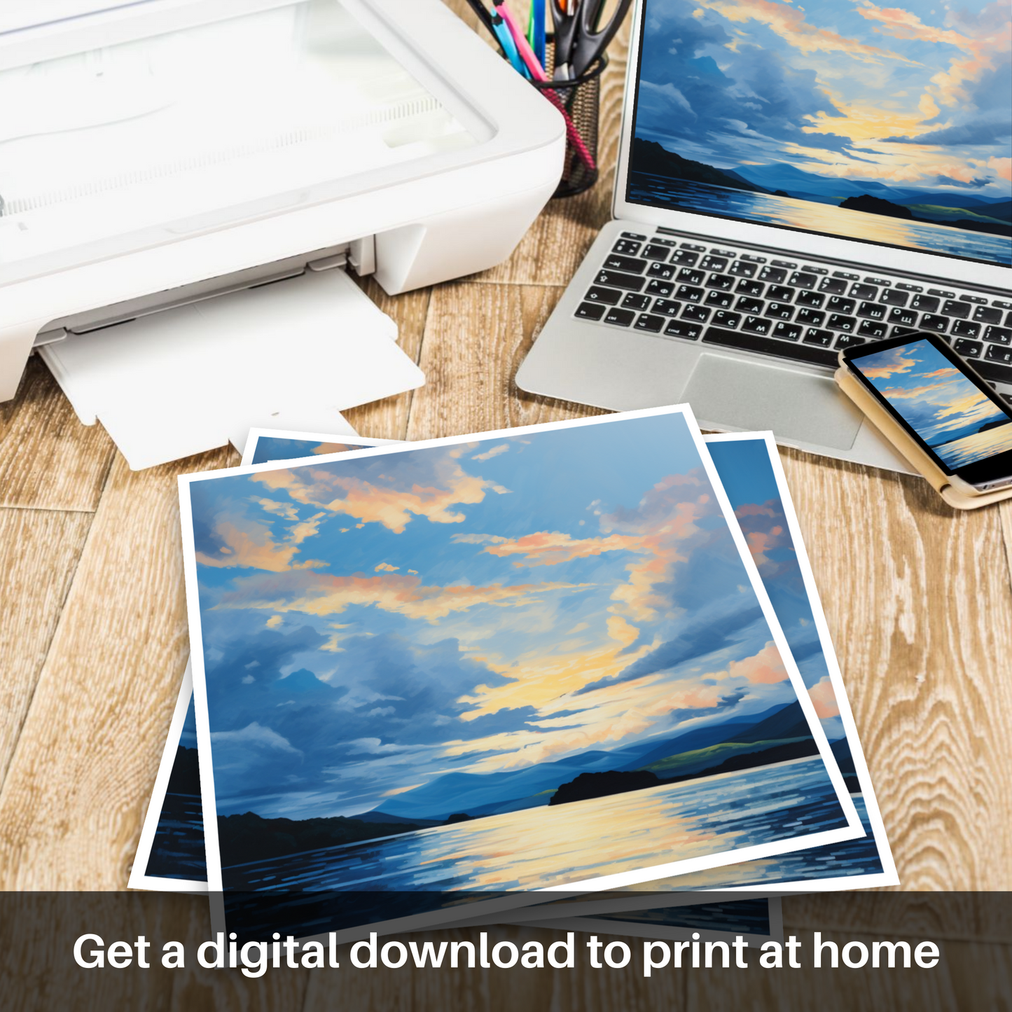 This captivating print captures the serene majesty of Loch Lomond with a strikingly vivid sky sprawling above. The tranquil waters of the loch perfectly mirror the dance of the sunset's warm hues, ranging from soft peaches to deep fiery oranges, as they contrast against the cool blues and purples of the evening sky. The clouds are rendered with an exceptional attention to detail, their soft edges and voluminous shapes lending depth and dimension to the vast sky.