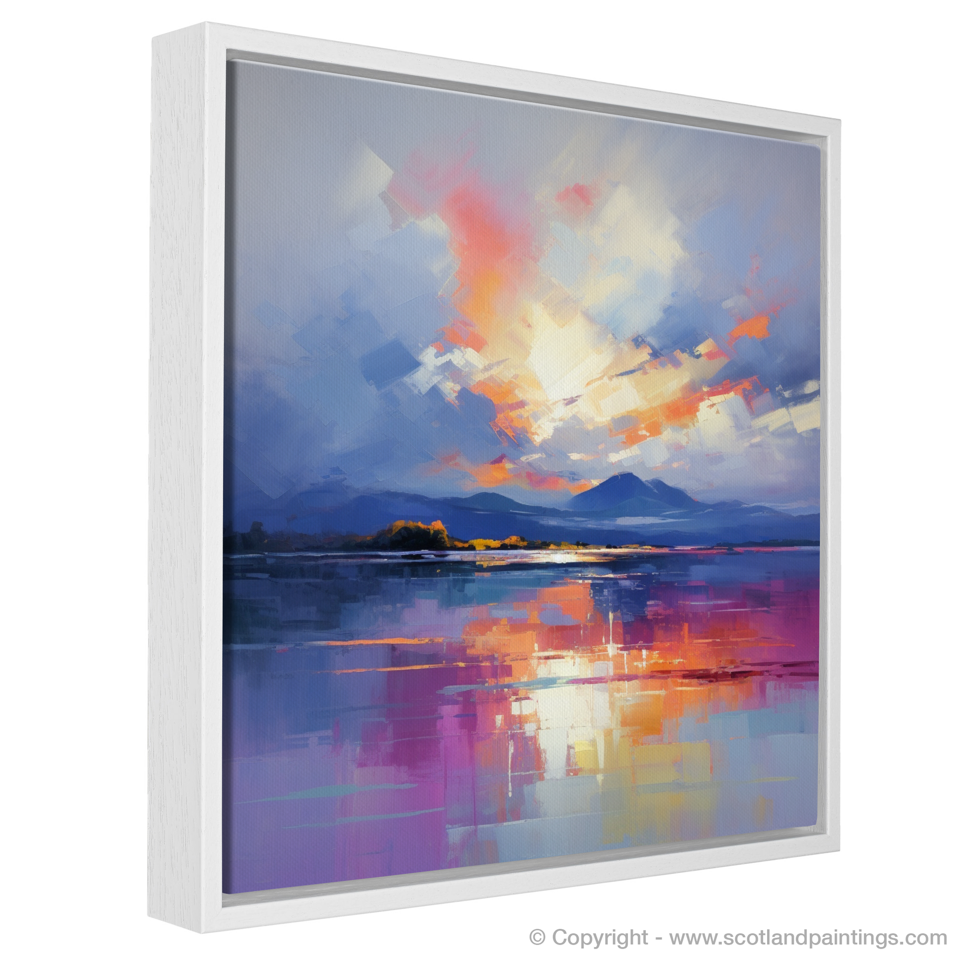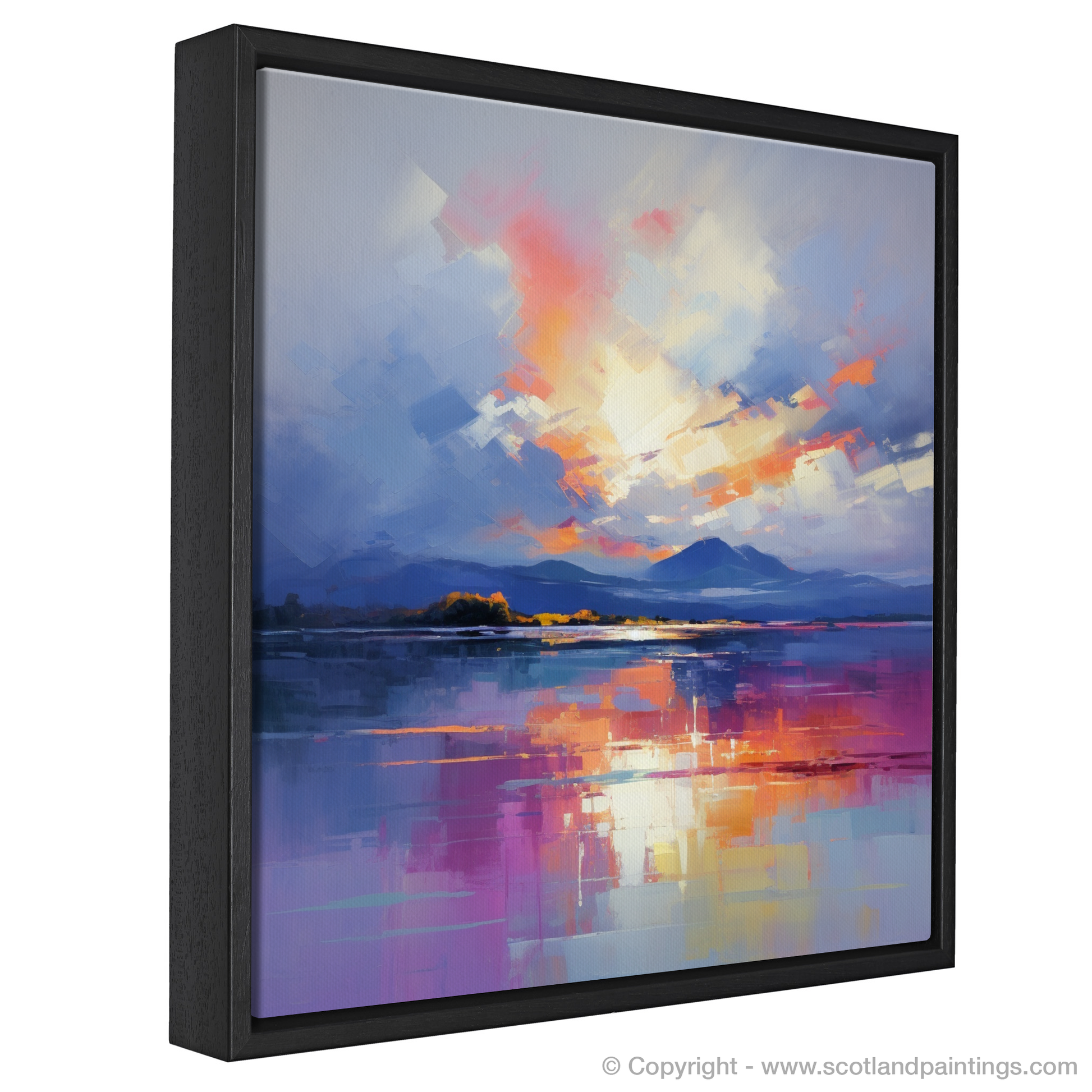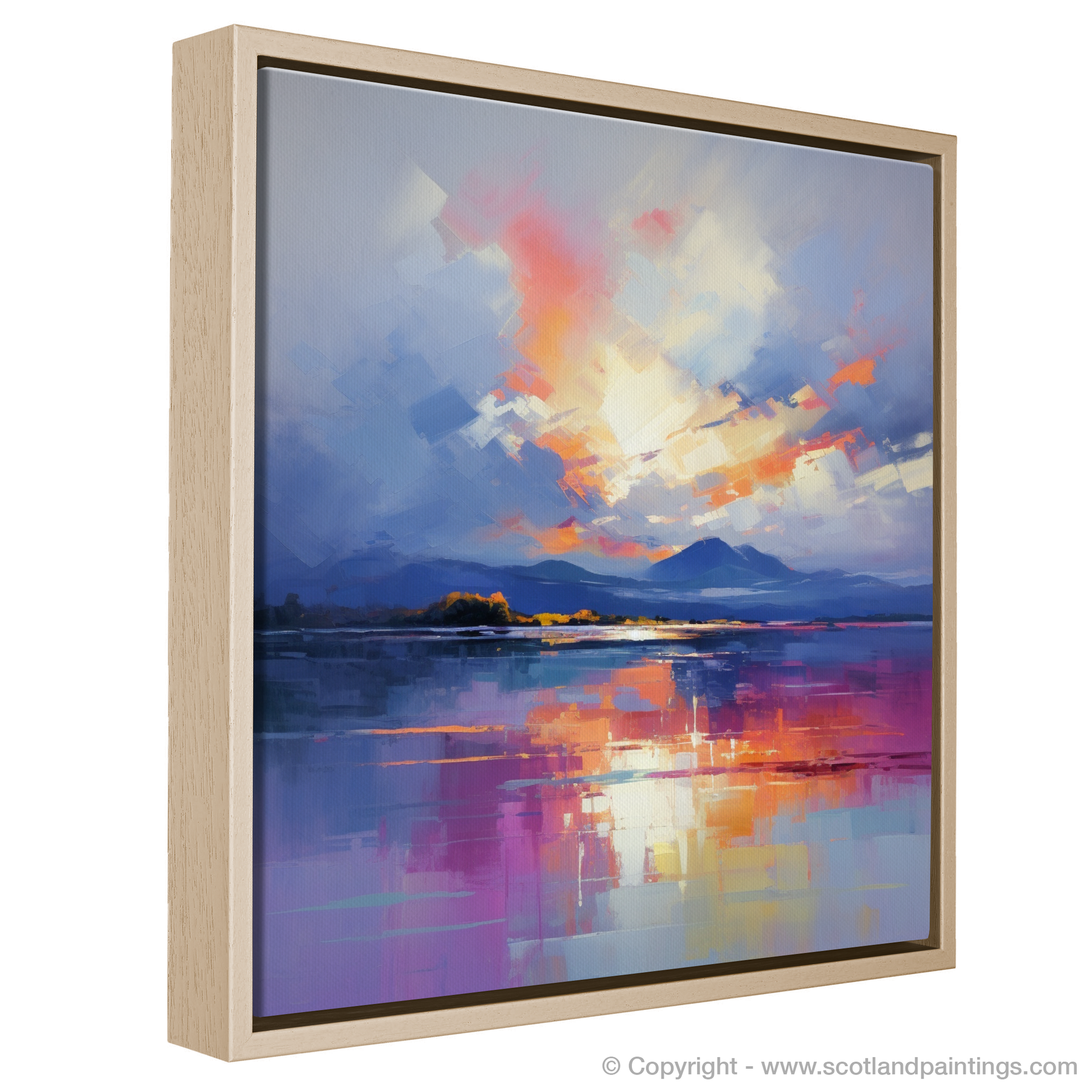 Captured within this expressive print is the essence of Loch Lomond's grandeur, where the vastness of the sky meets the tranquility of the water. The artwork envelops the viewer in a dance of vibrant hues, with the sunset bleeding fiery shades of orange, crimson and soft whispers of pink into the canvas. Majestic strokes convey the movement of cloud and light, as they interplay to create a spectacle of nature's fleeting beauty.