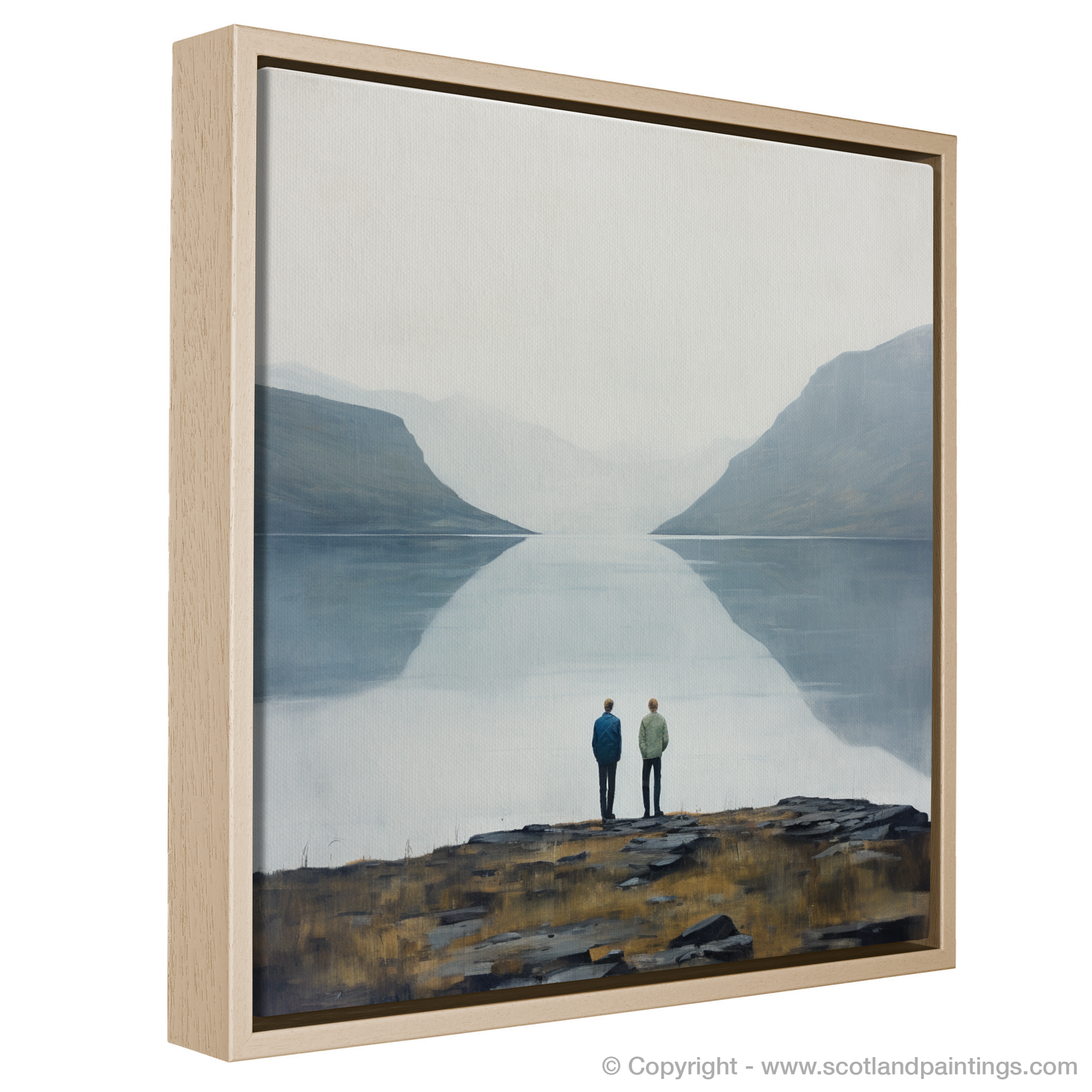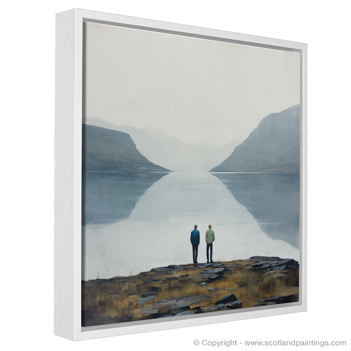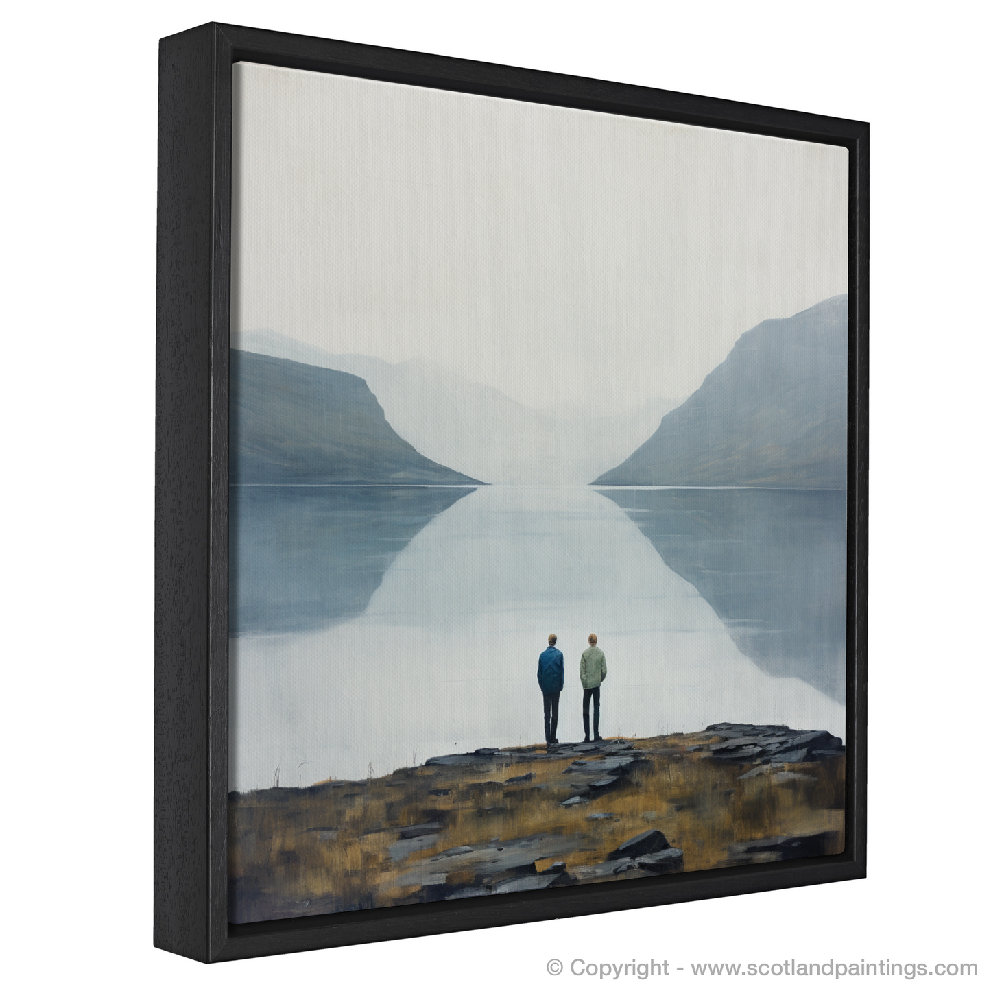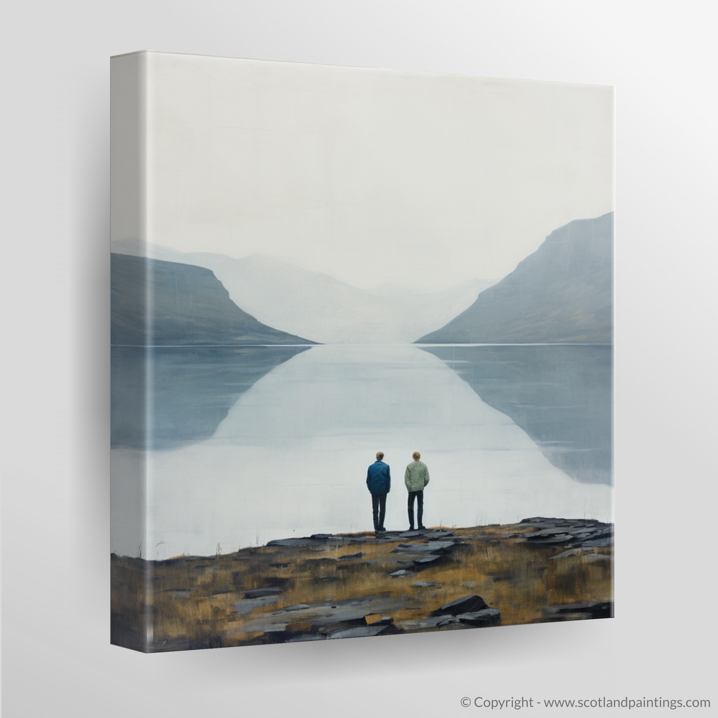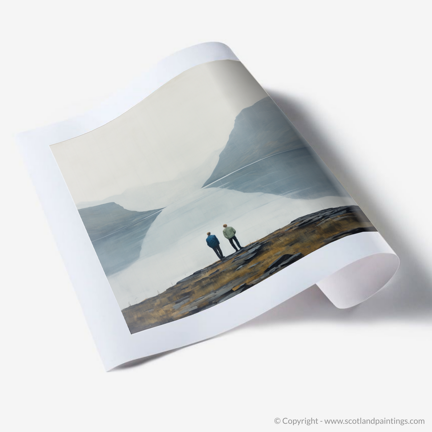 Capturing a serene moment, this evocative print showcases the majestic beauty of Loch Lomond, enveloped in the tranquility of minimalism. Two silhouetted hikers stand side by side, perched on the rugged terrain at the water's edge, gazing out onto the glassy loch that mirrors the softened outlines of the distant hills.