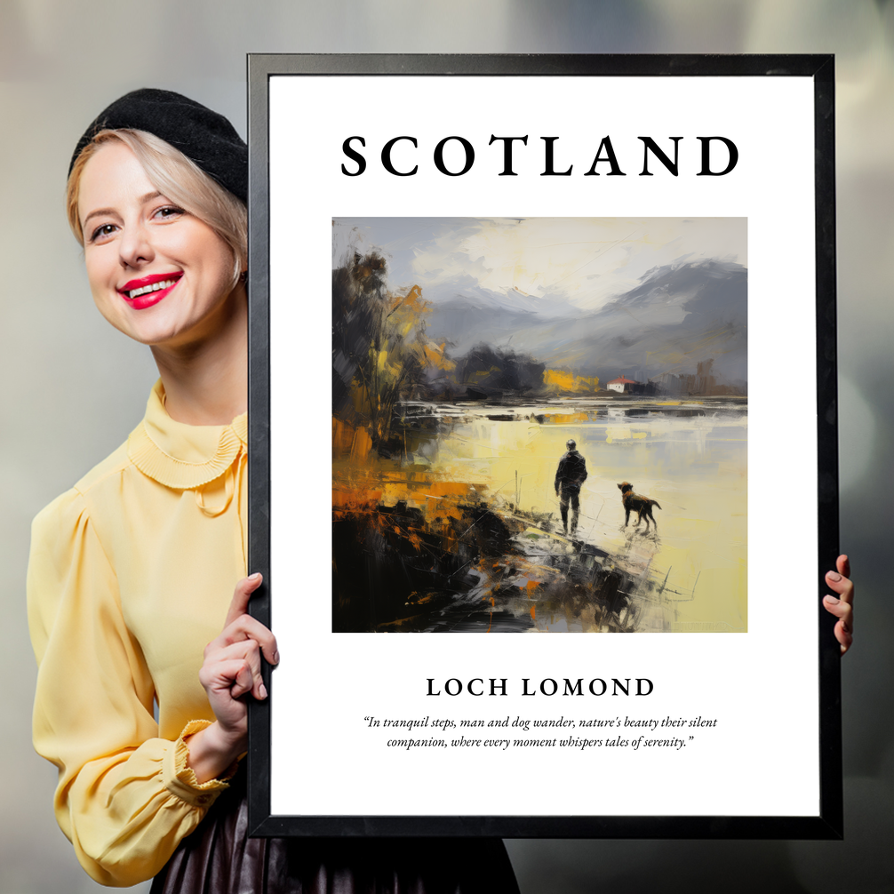 At the top, the bold word “SCOTLAND” sets the tone, drawing the viewer into the heart of the Highlands. Below, the abstract painting of Loch Lomond captures a tranquil scene where a man and his dog wander along the water’s edge. The painting’s swirling, textured strokes evoke the ever-changing Scottish skies and the serene landscape. The peacefulness of the scene is further echoed in the quote beneath: “In tranquil steps, man and dog wander, nature's beauty their silent companion, where every moment whispers tales of serenity.”
