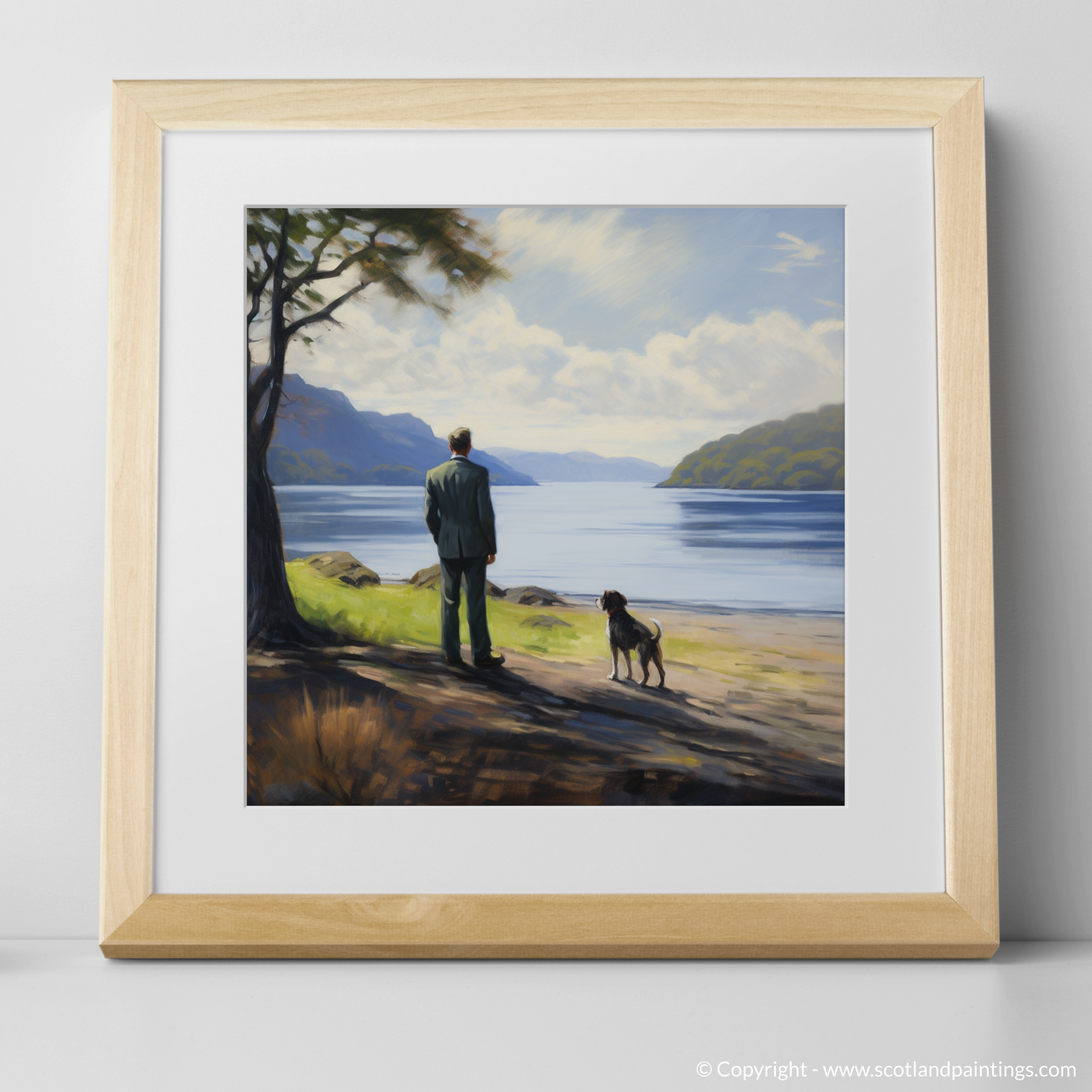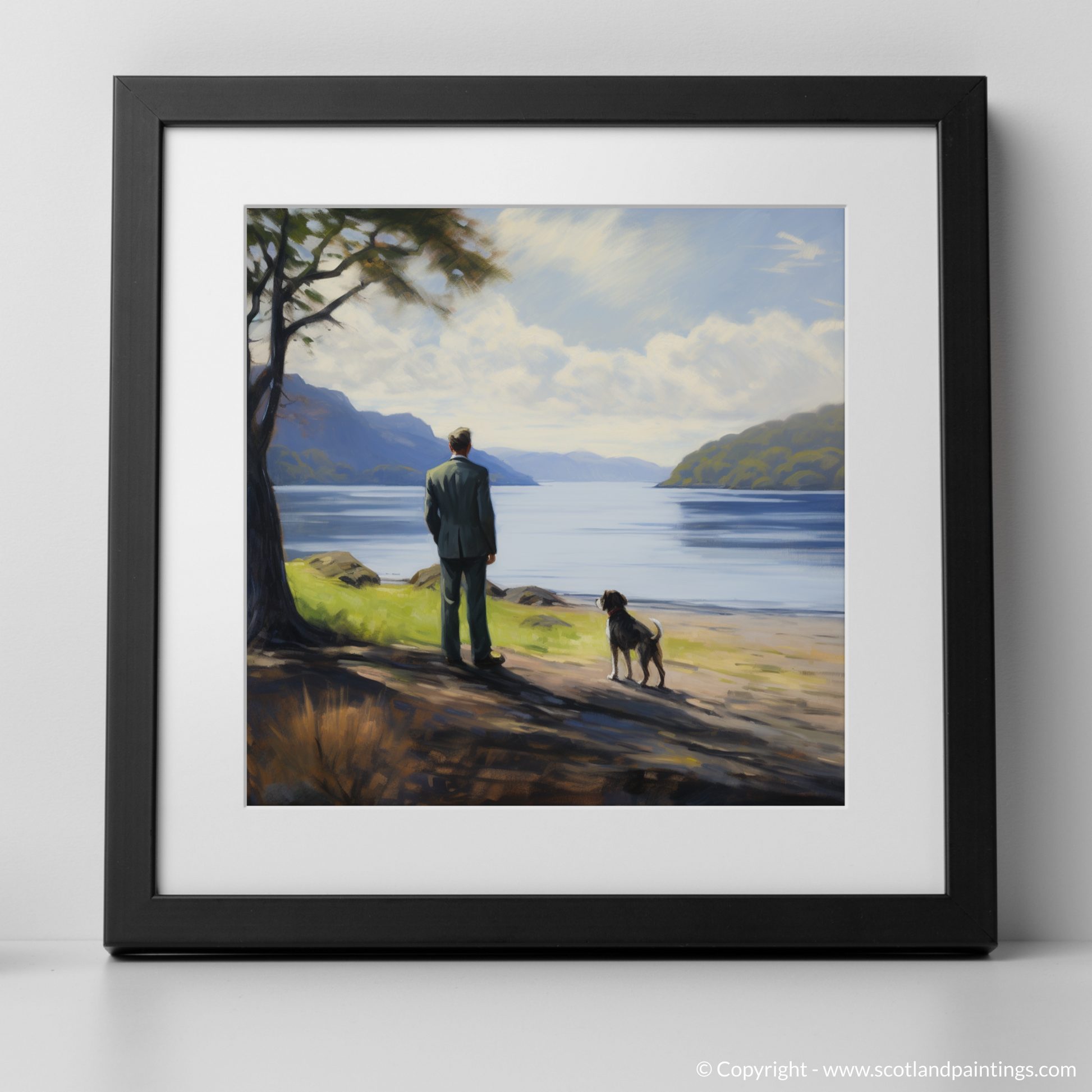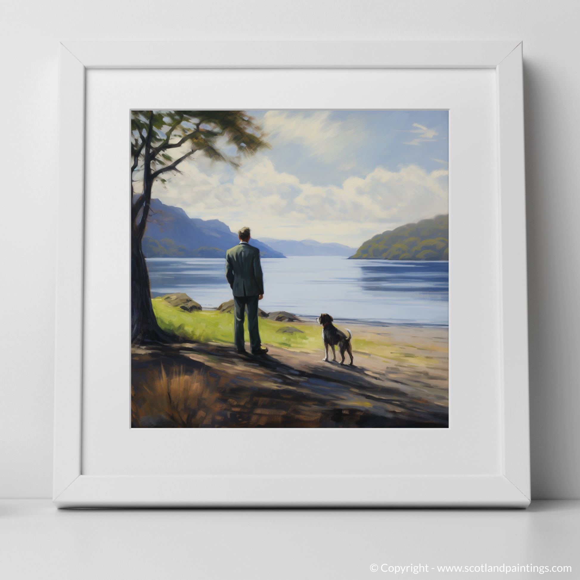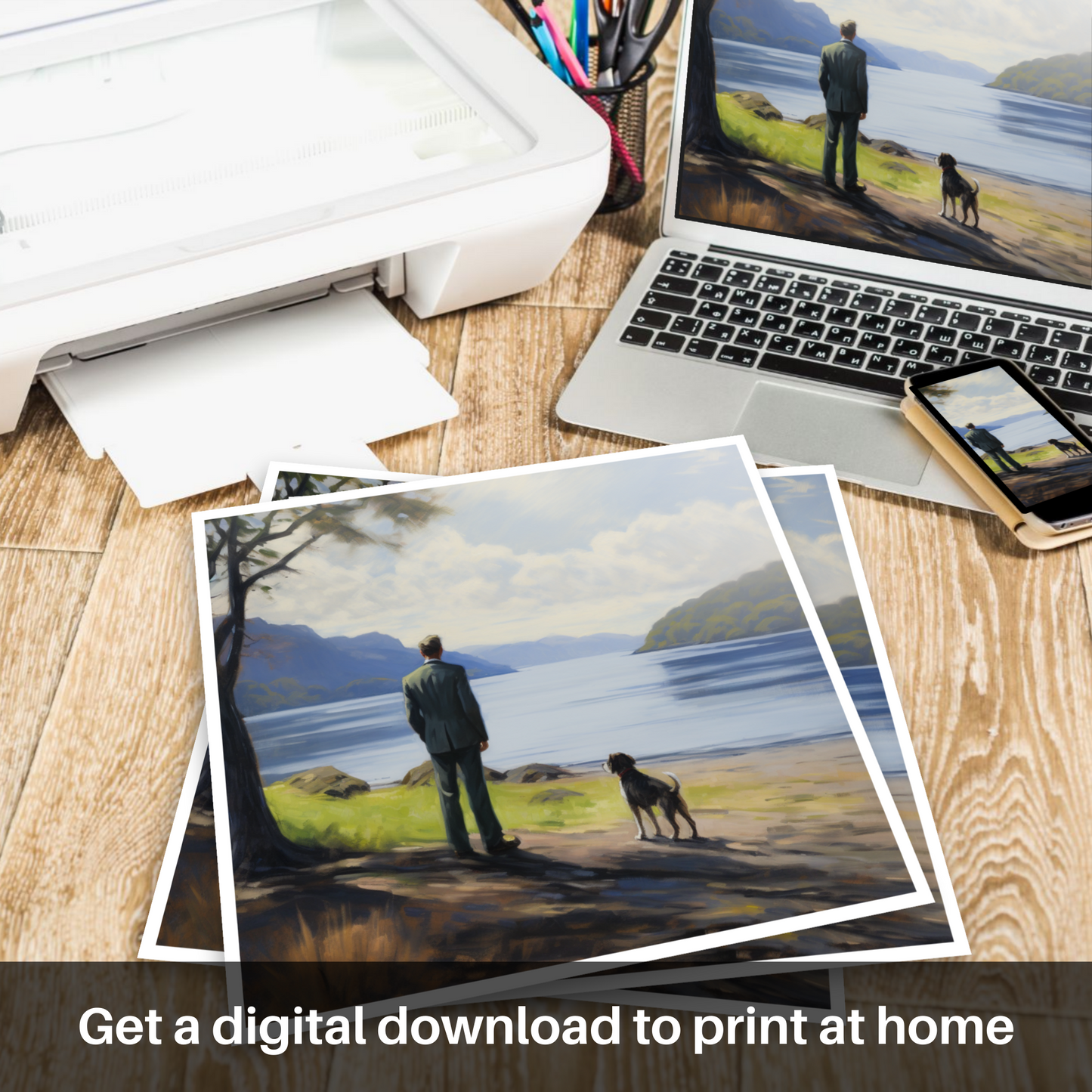Capture the serene beauty of Loch Lomond with this exquisite print, where the tranquil waters meet the rugged beauty of the Scottish Highlands. The work depicts a moment of peaceful reflection as a man, clad in a classic green suit, stands alongside his faithful canine companion, gazing out over the still expanse of the loch.