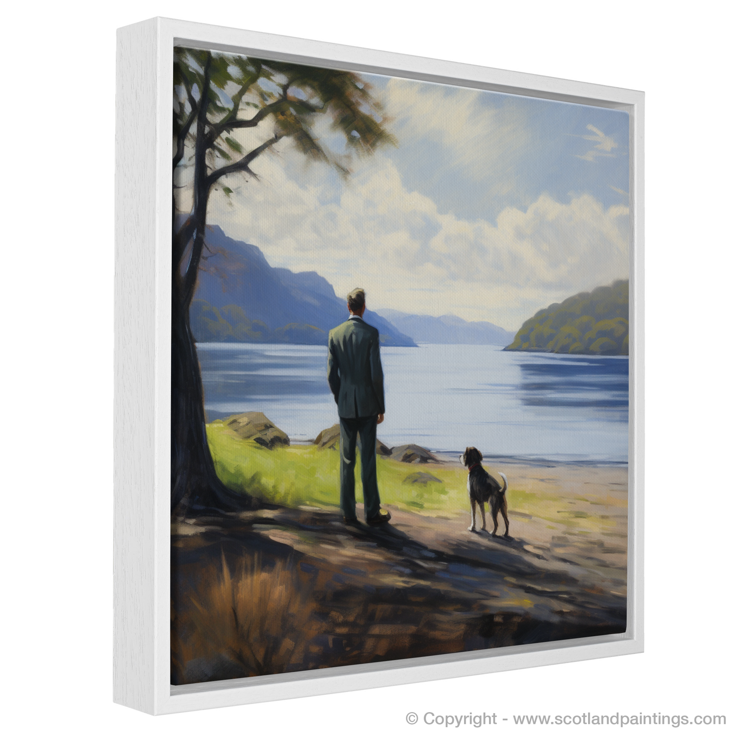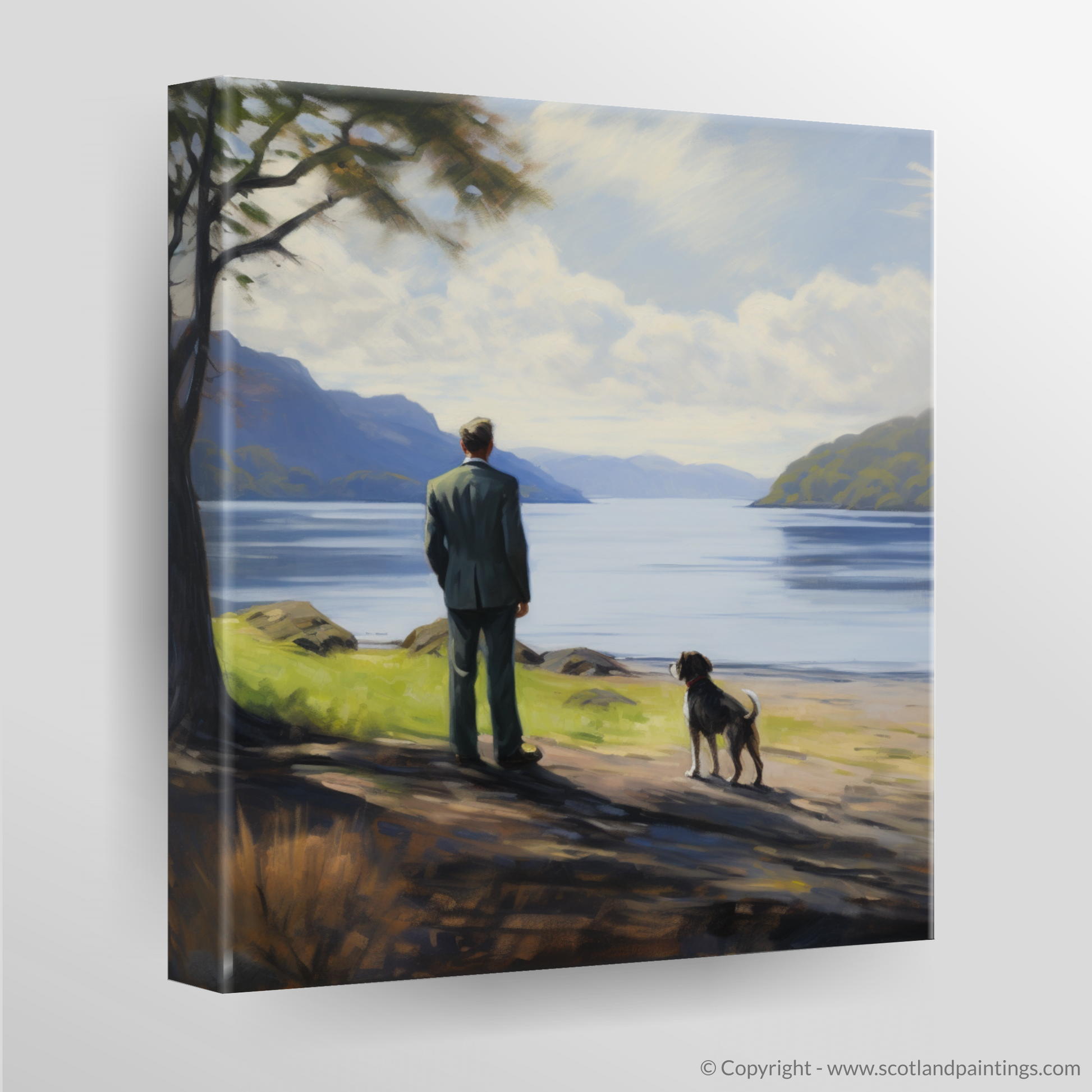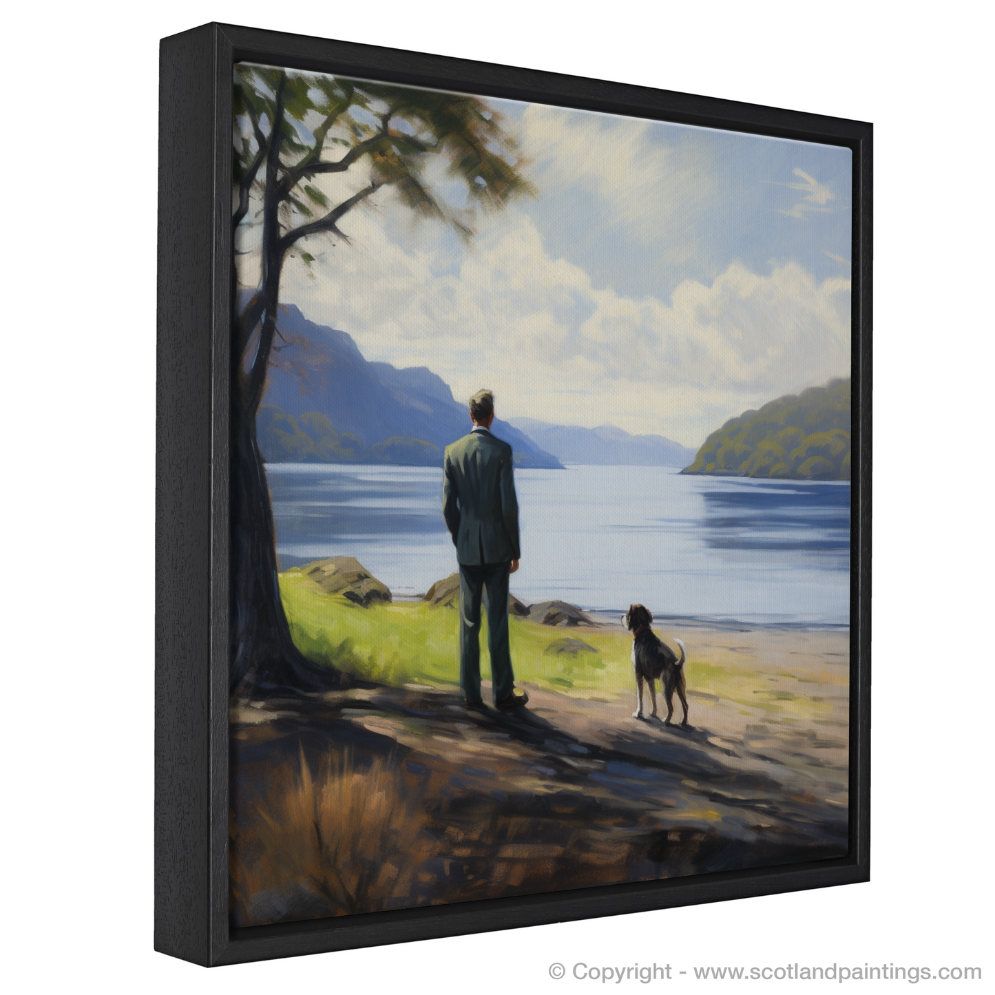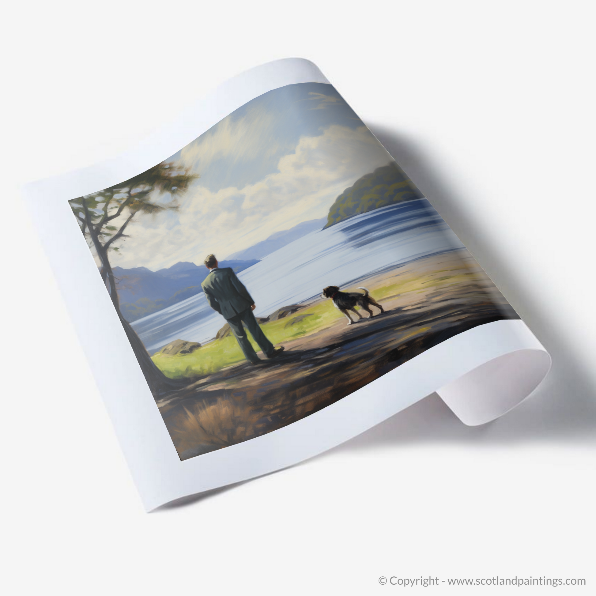 Capture the serene beauty of Loch Lomond with this exquisite print, where the tranquil waters meet the rugged beauty of the Scottish Highlands. The work depicts a moment of peaceful reflection as a man, clad in a classic green suit, stands alongside his faithful canine companion, gazing out over the still expanse of the loch.
