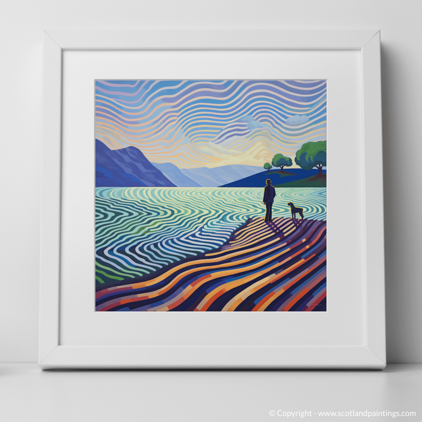This print, with its abstract depiction of Loch Lomond, transcendental curves, and flowing lines, invites viewers into a world where nature's beauty is distilled into its most elemental forms. It is an homage to the simple joys of solitude, the bond between human and animal, and the timeless allure of Scotland's landscapes.