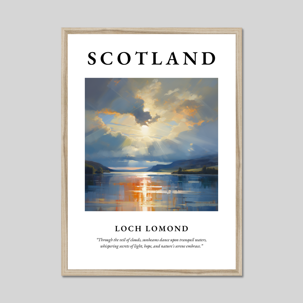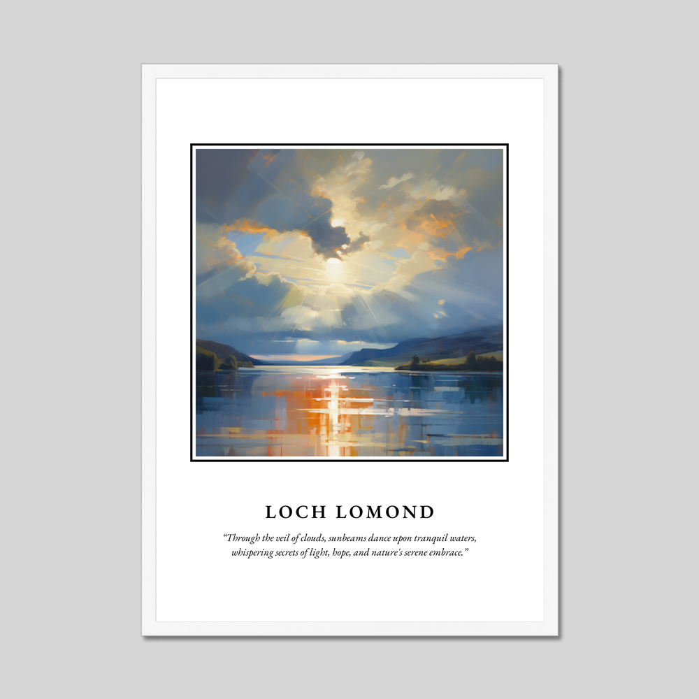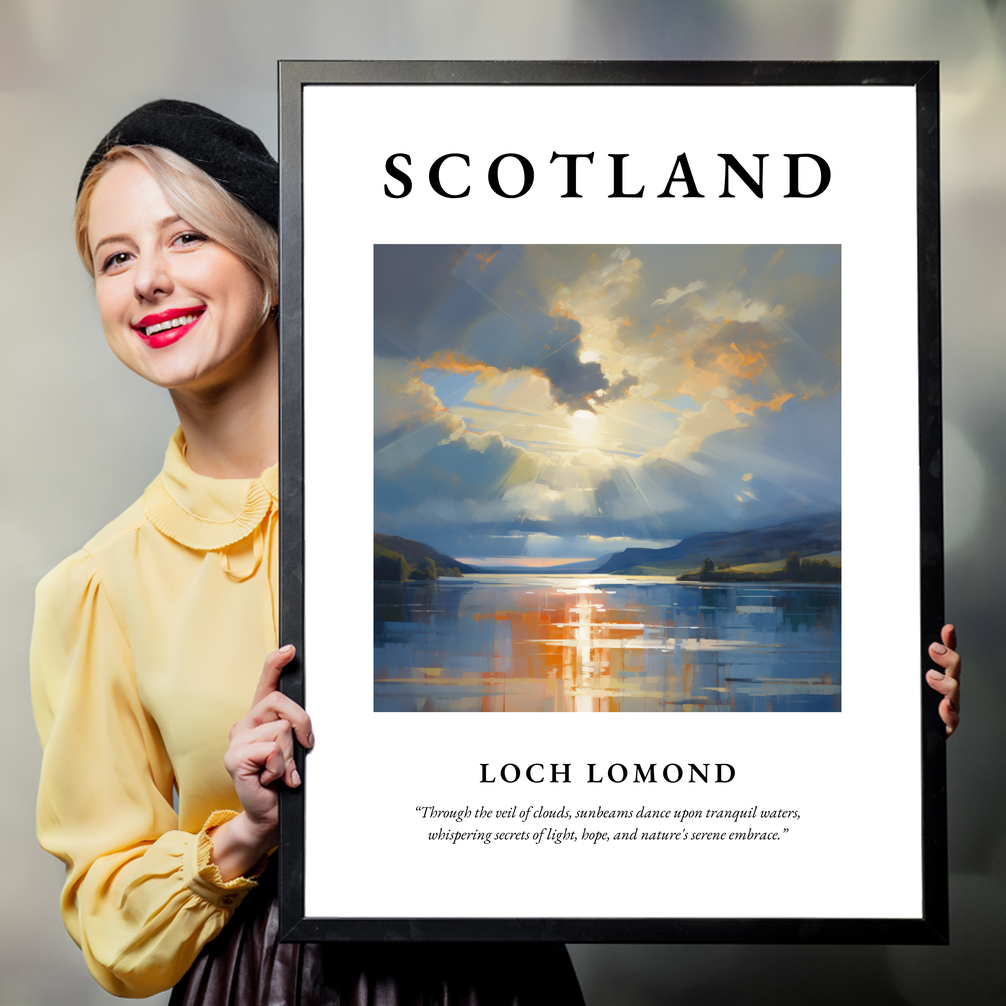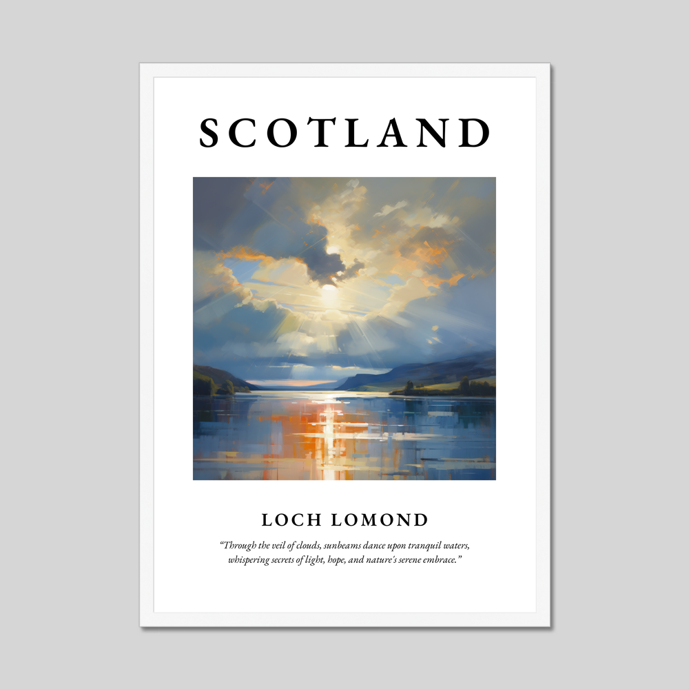 At the top, “SCOTLAND” is proudly displayed in bold lettering, beckoning those with a connection to this enigmatic land. Central to the piece is a mesmerizing painting of Loch Lomond, illustrating a vivid portrayal of sunlight piercing through dynamic clouds, casting shimmering reflections upon serene waters. This captivating imagery is underscored by the quote, “Through the veil of clouds, sunbeams dance upon tranquil waters, whispering secrets of light, hope, and nature's serene embrace,” encapsulating the magical allure of this enchanting landscape.