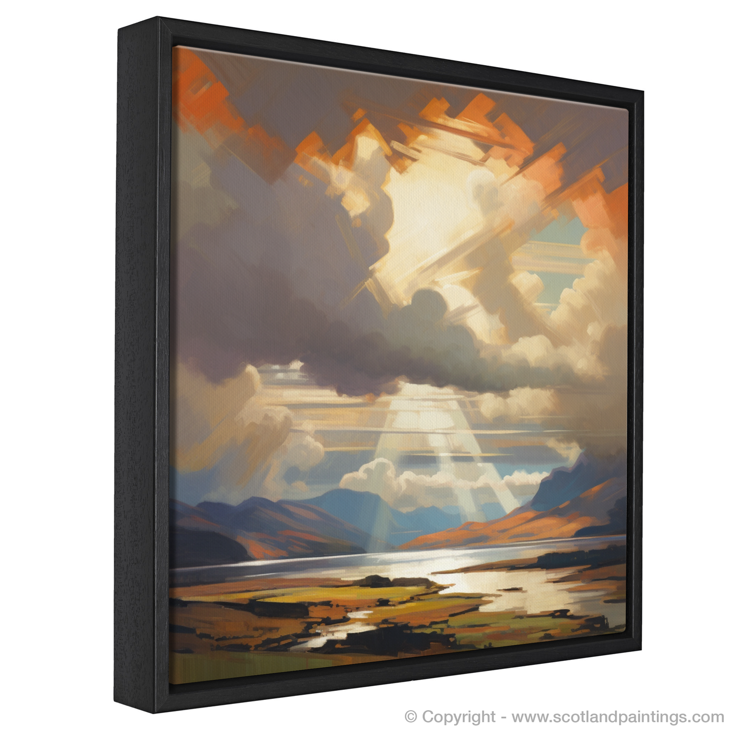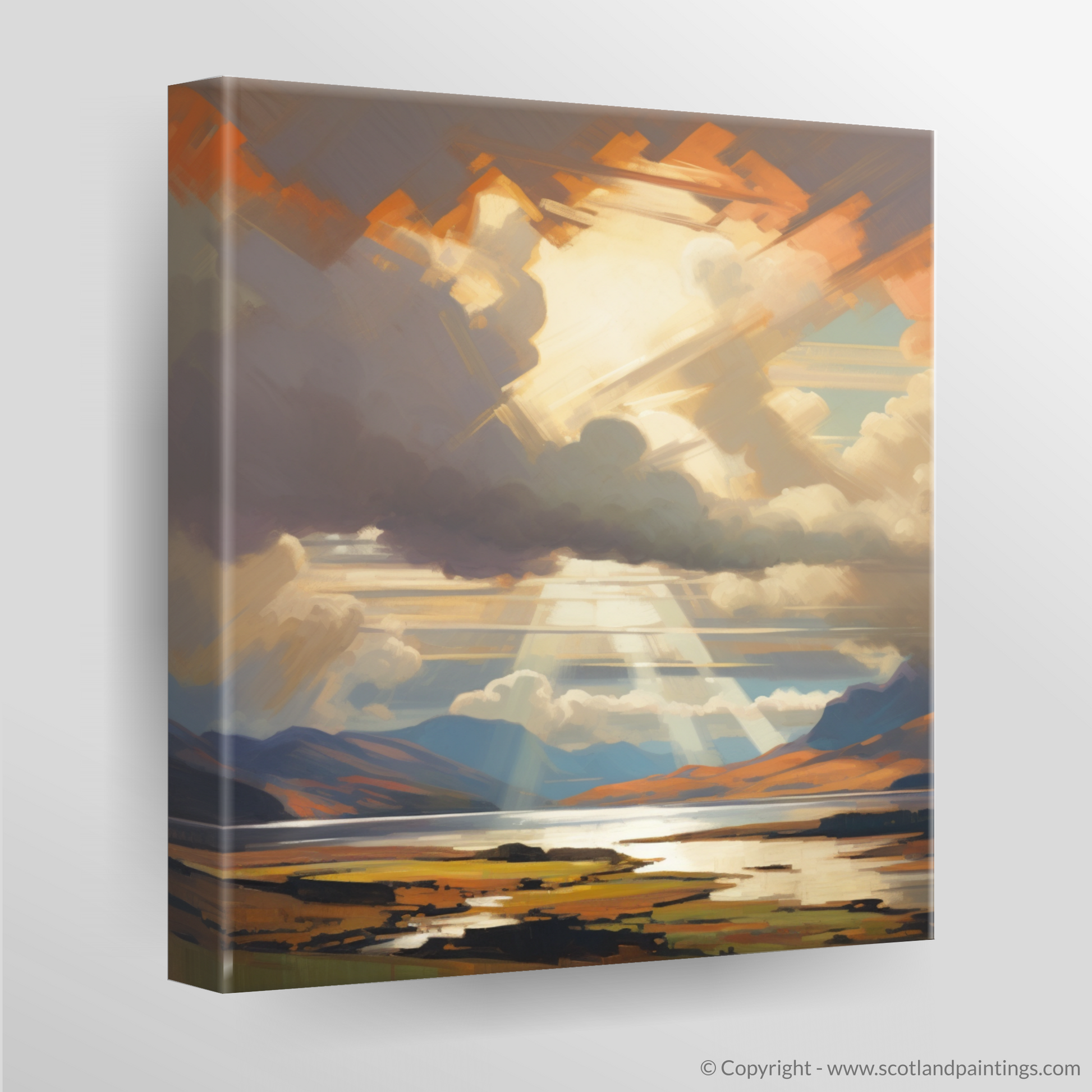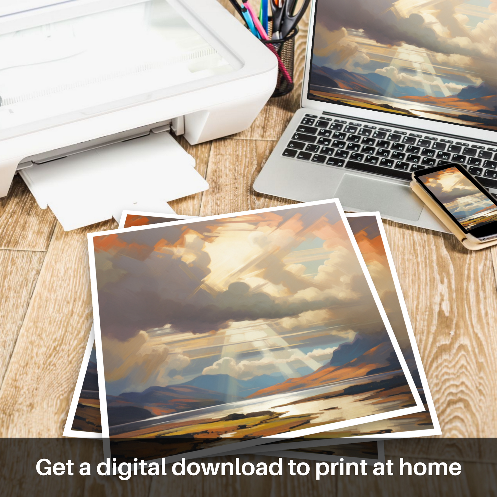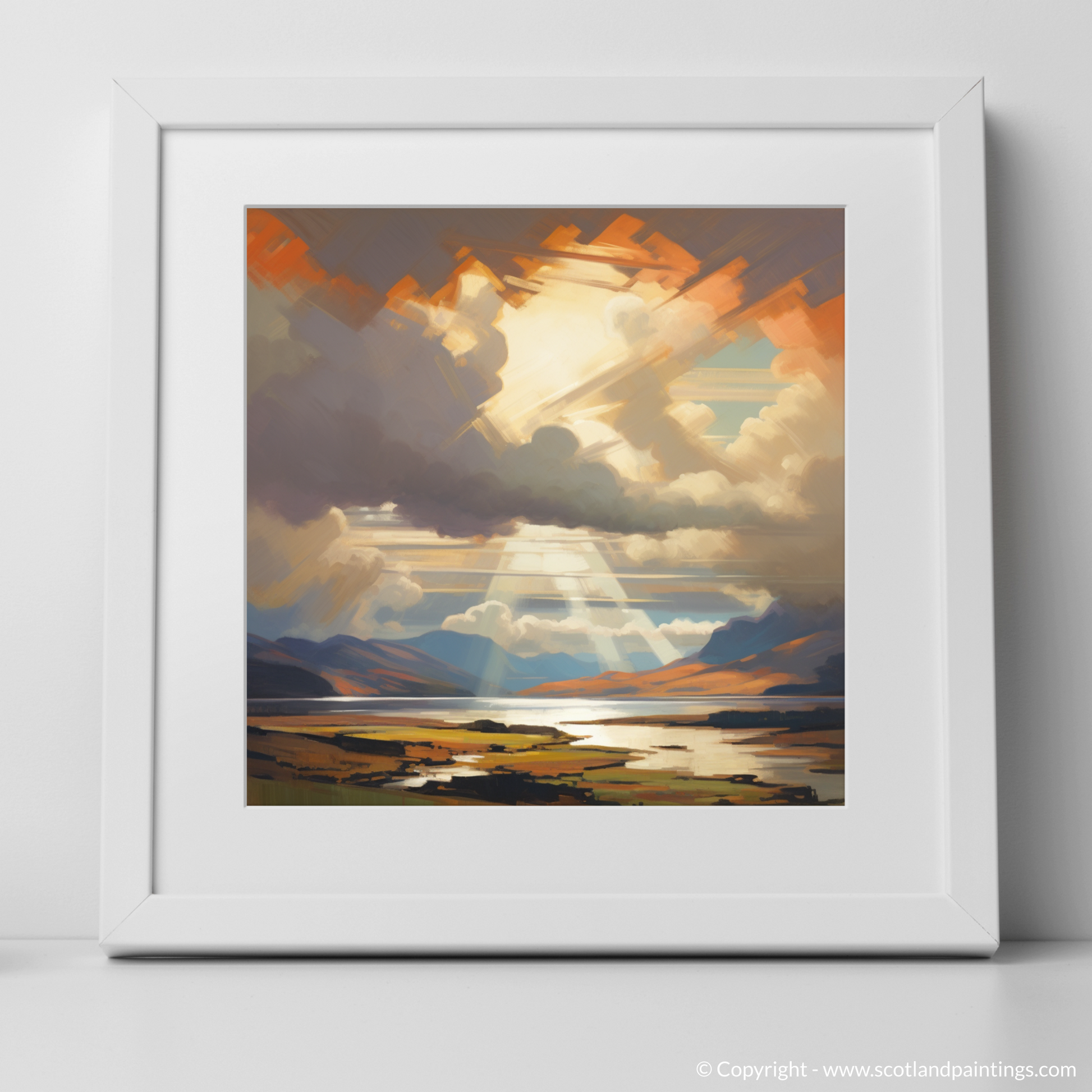 Capturing the stunning dynamism of nature, this contemporary piece brings to life the majestic beauty of Loch Lomond, one of Scotland's most beloved landscapes. Dancing with ethereal light, the focal point of this evocative print is the dramatic interplay between the brilliant sun rays and the brooding clouds above. The luminous beams pierce through the tumultuous sky, cascading over the tranquil waters and rugged terrain below.