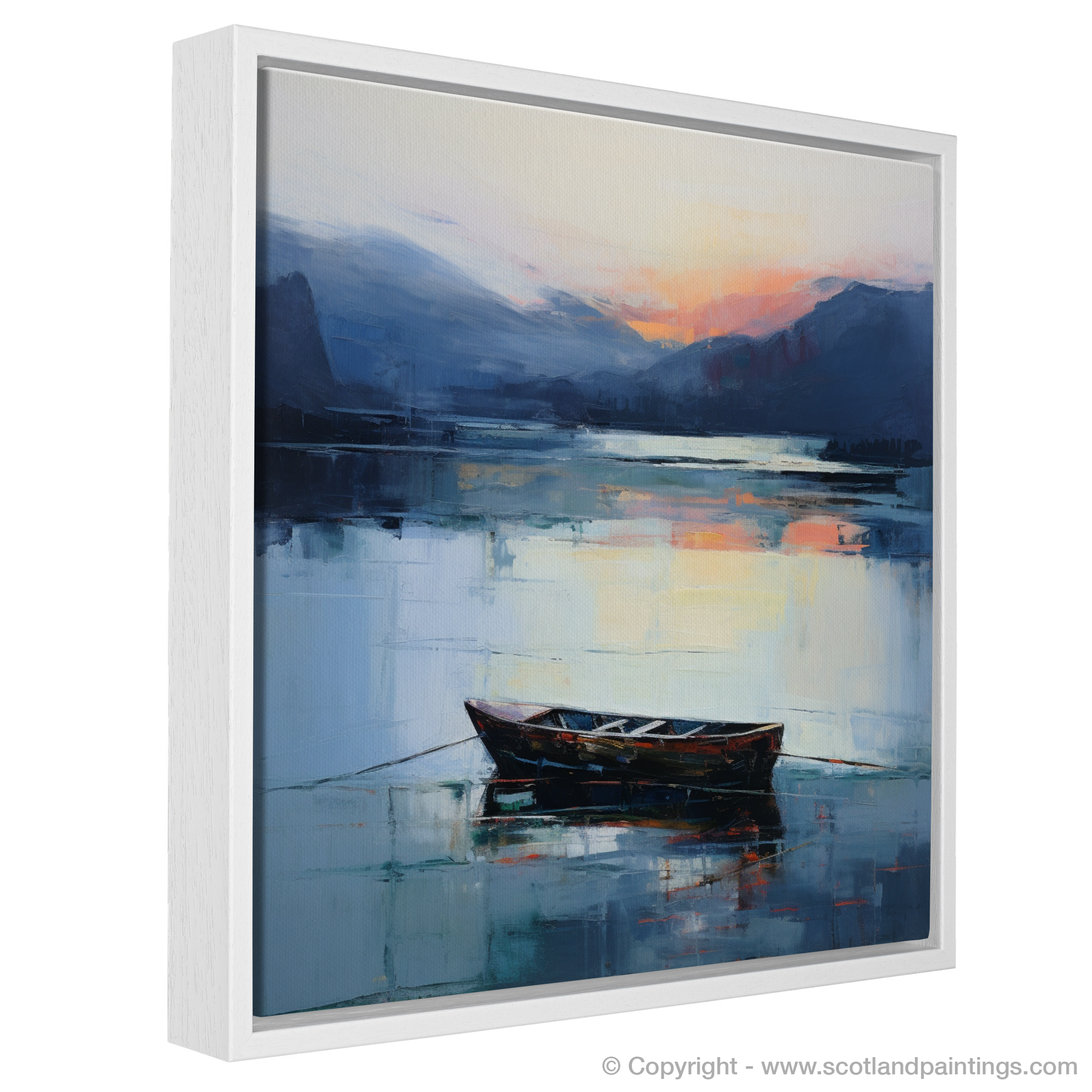 Captured within this alluring print is the essence of tranquility at Loch Lomond, as a lone rowboat rests gently on the mirror-like waters at dusk. The artwork is a harmonious symphony of abstract brushstrokes and a soothing colour palette that evokes the serene beauty of the Scottish Highlands.