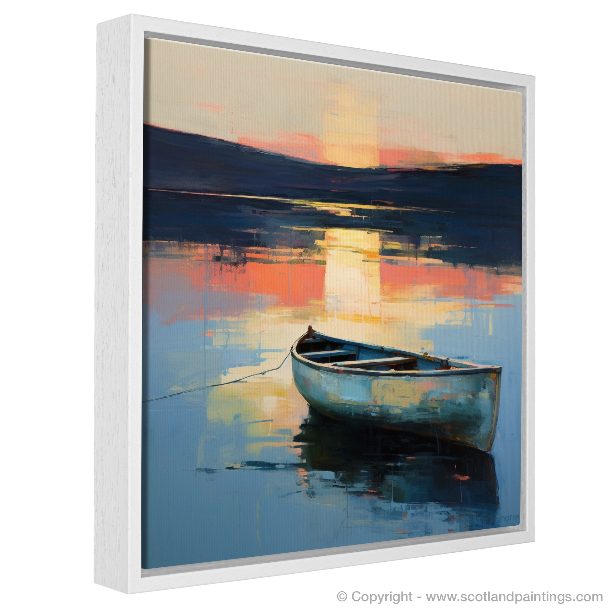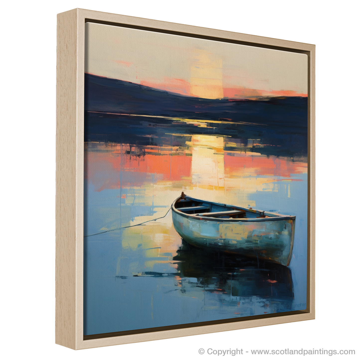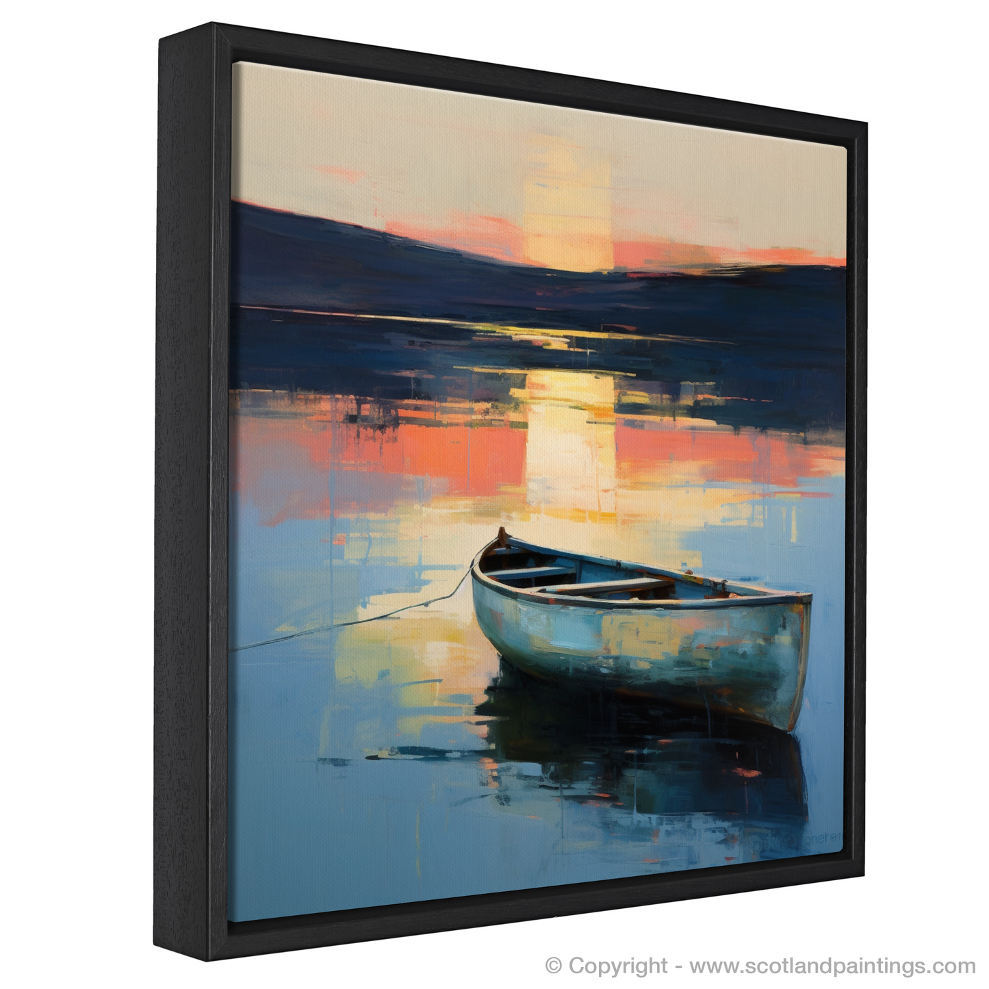 Capturing the tranquil essence of Loch Lomond at the close of day, this evocative print is a stunning testament to the serene beauty found in Scotland's natural landscapes. The centrepiece of the composition, a solitary rowboat, gently rests upon the glassy surface of the loch, tethered securely but floating freely, suggesting both stillness and an underlying potential for movement.