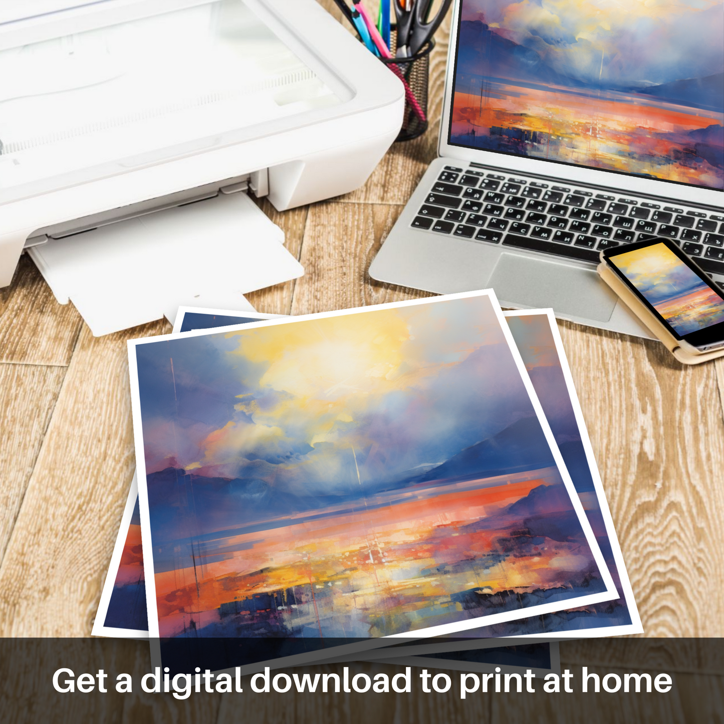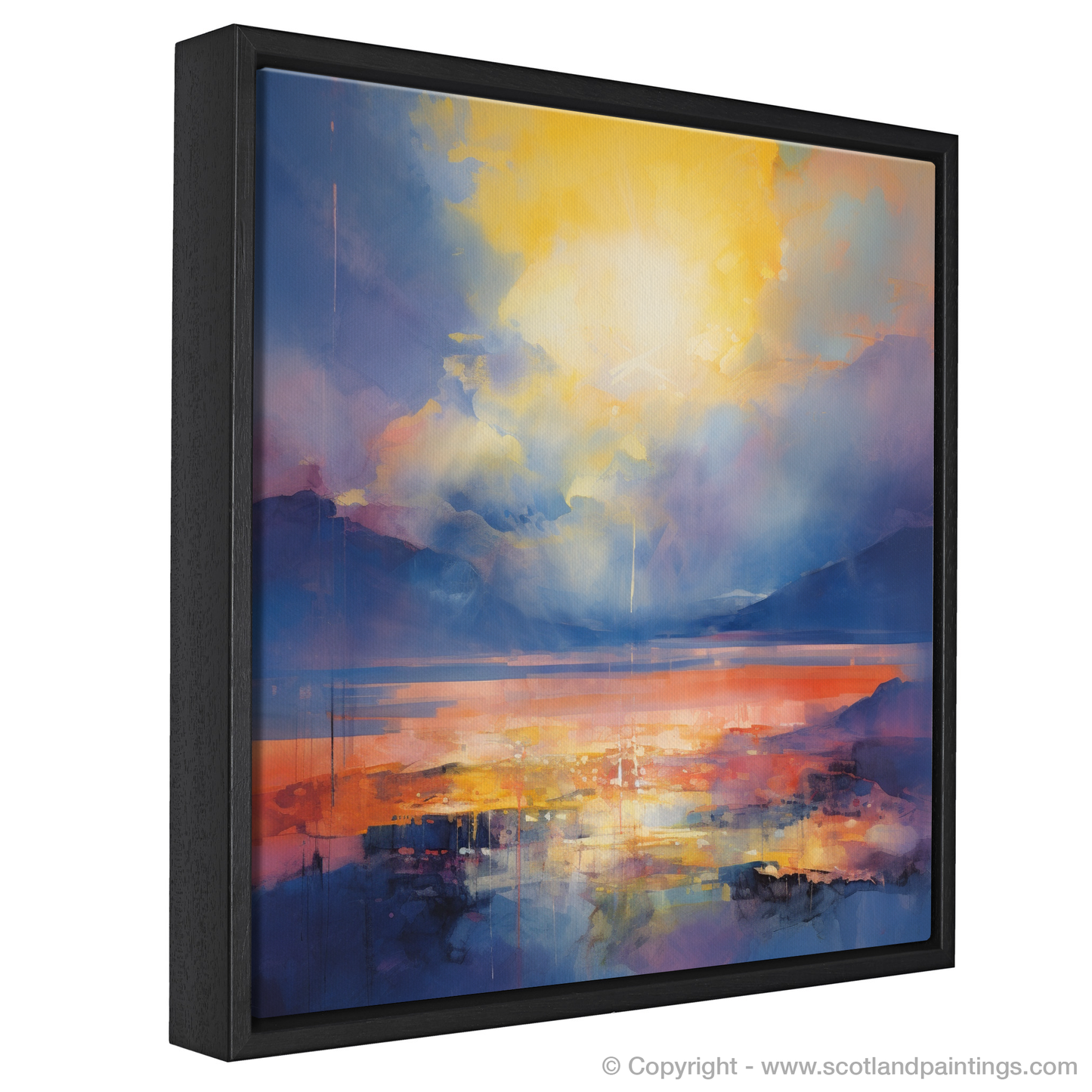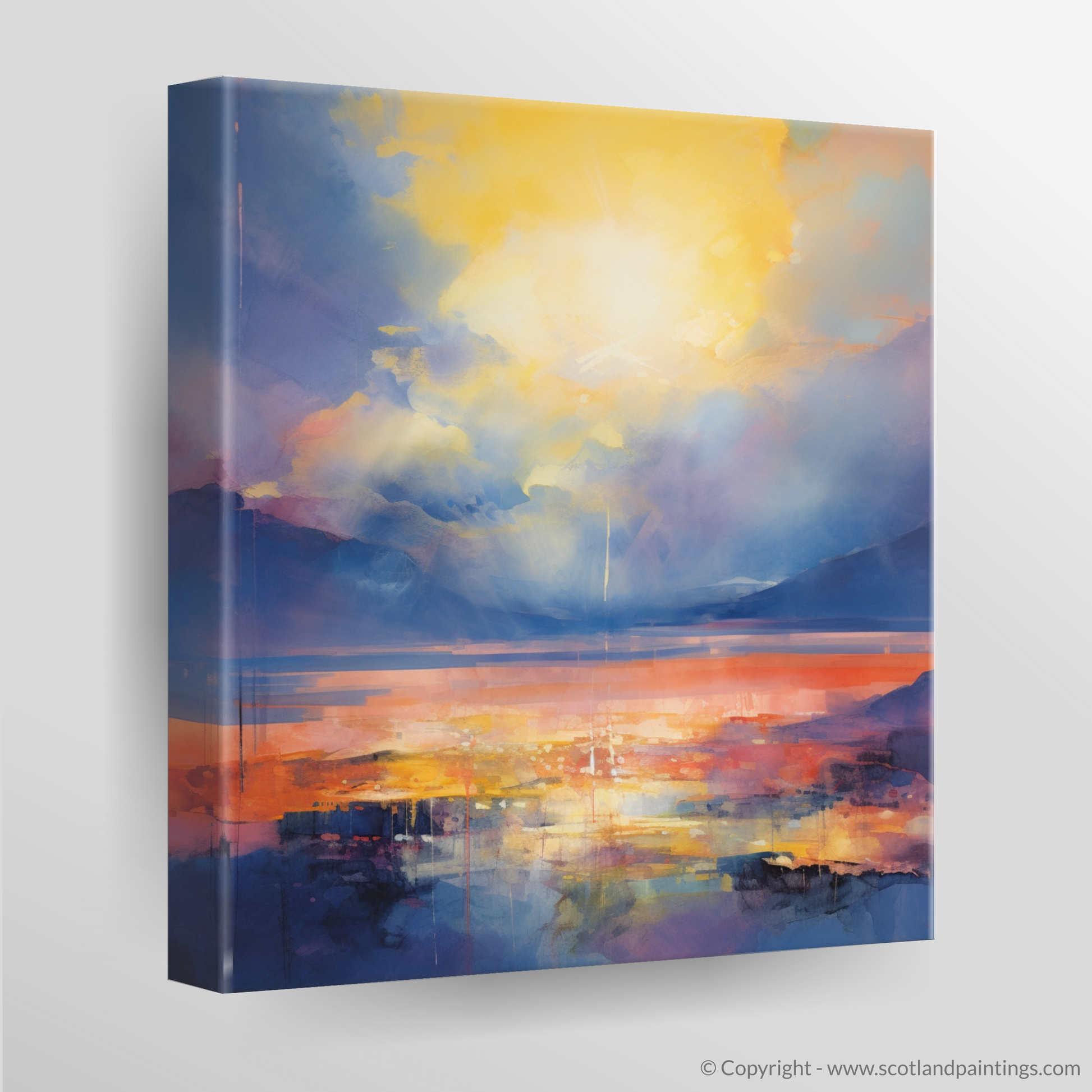 Capturing the ephemeral beauty of nature, this abstract depiction of Loch Lomond is a vivid dance of colour and light. The piece radiates with the warmth of crepuscular rays that pierce through the shifting clouds, casting a natural spotlight over the serene landscape. Hues of deep ultramarine and royal blue blend into the rugged silhouettes of distant peaks, encapsulating the essence of the Scottish Highlands.